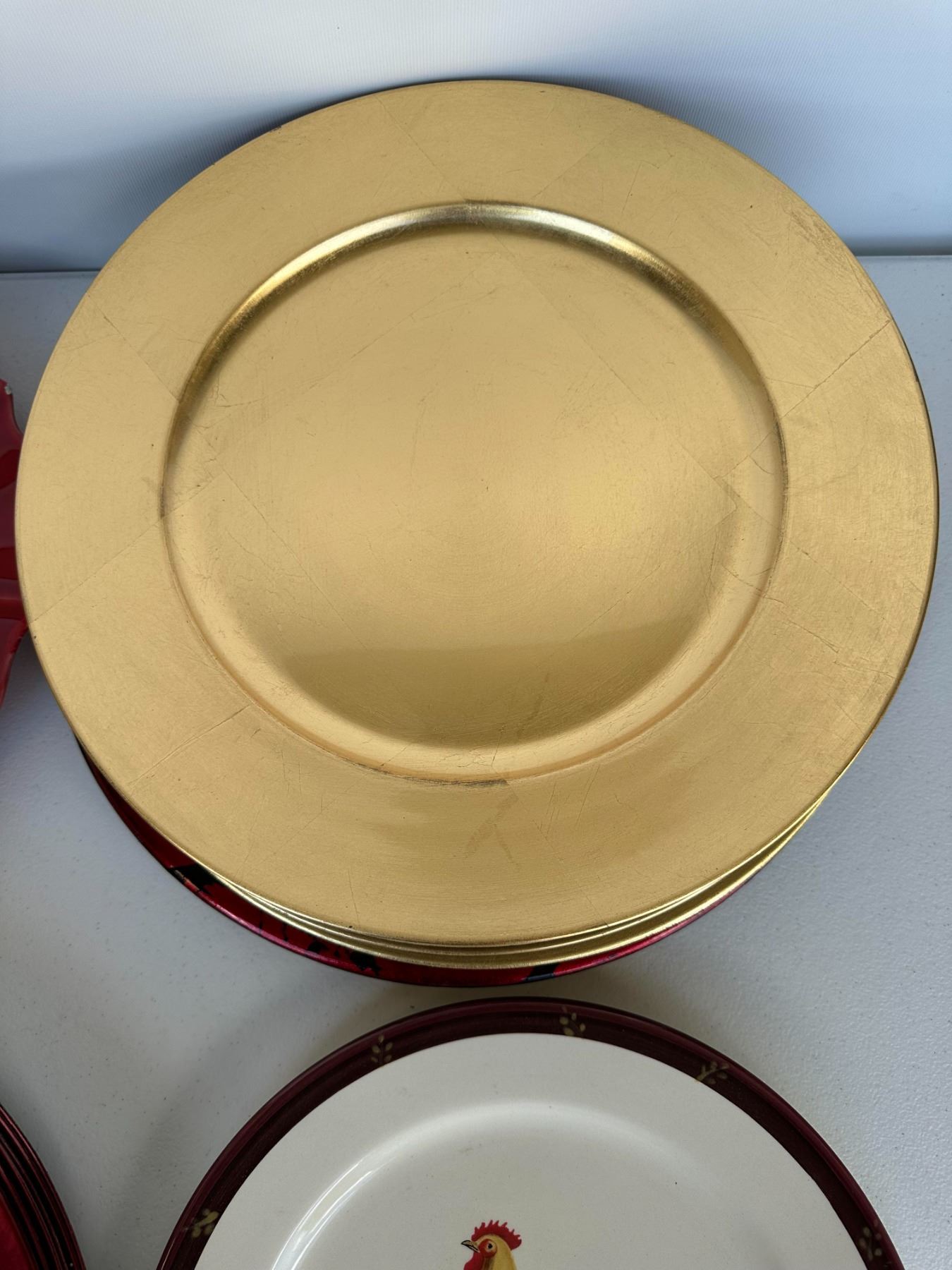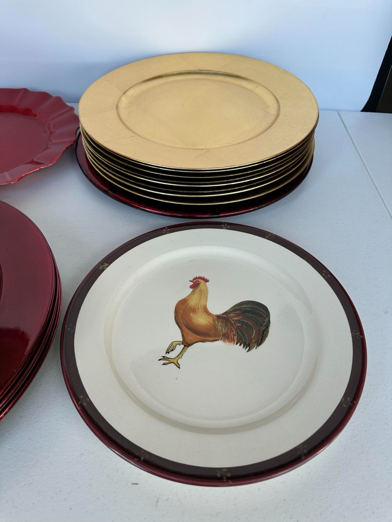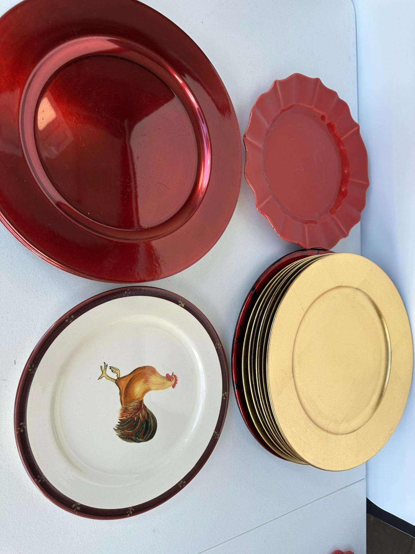 Group of assorted plates: rooster motif plate, scalloped red plate, red serving platter, and a stack of gold chargers. Eclectic collection for display or entertaining.