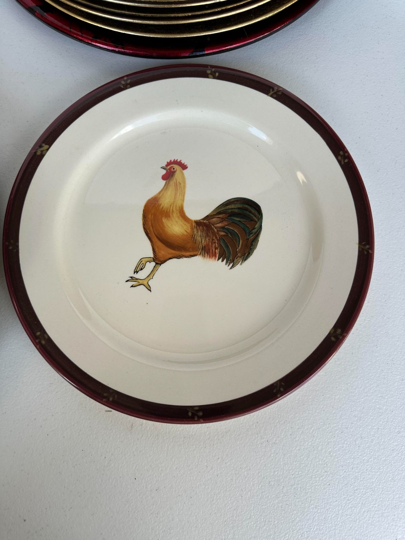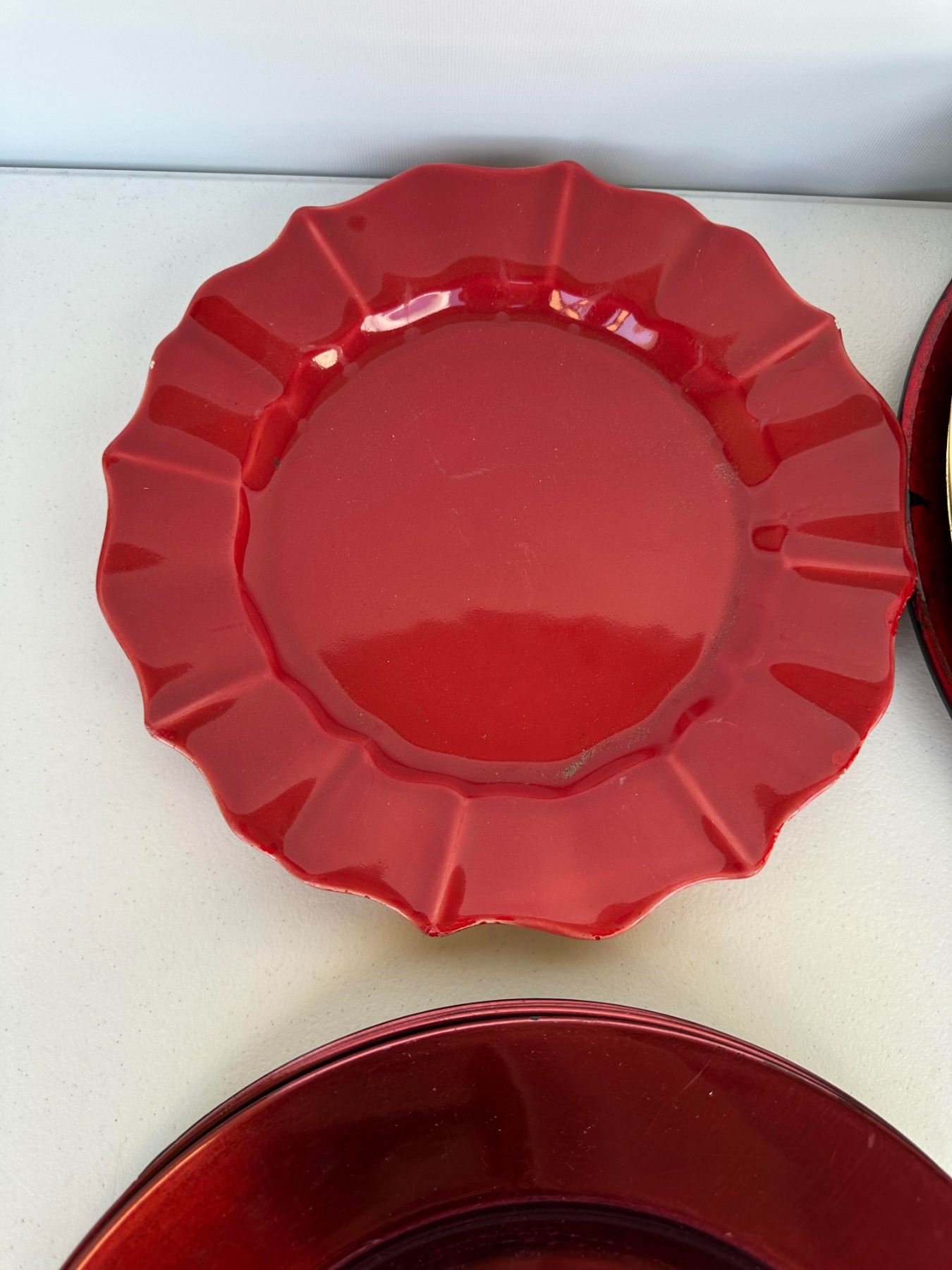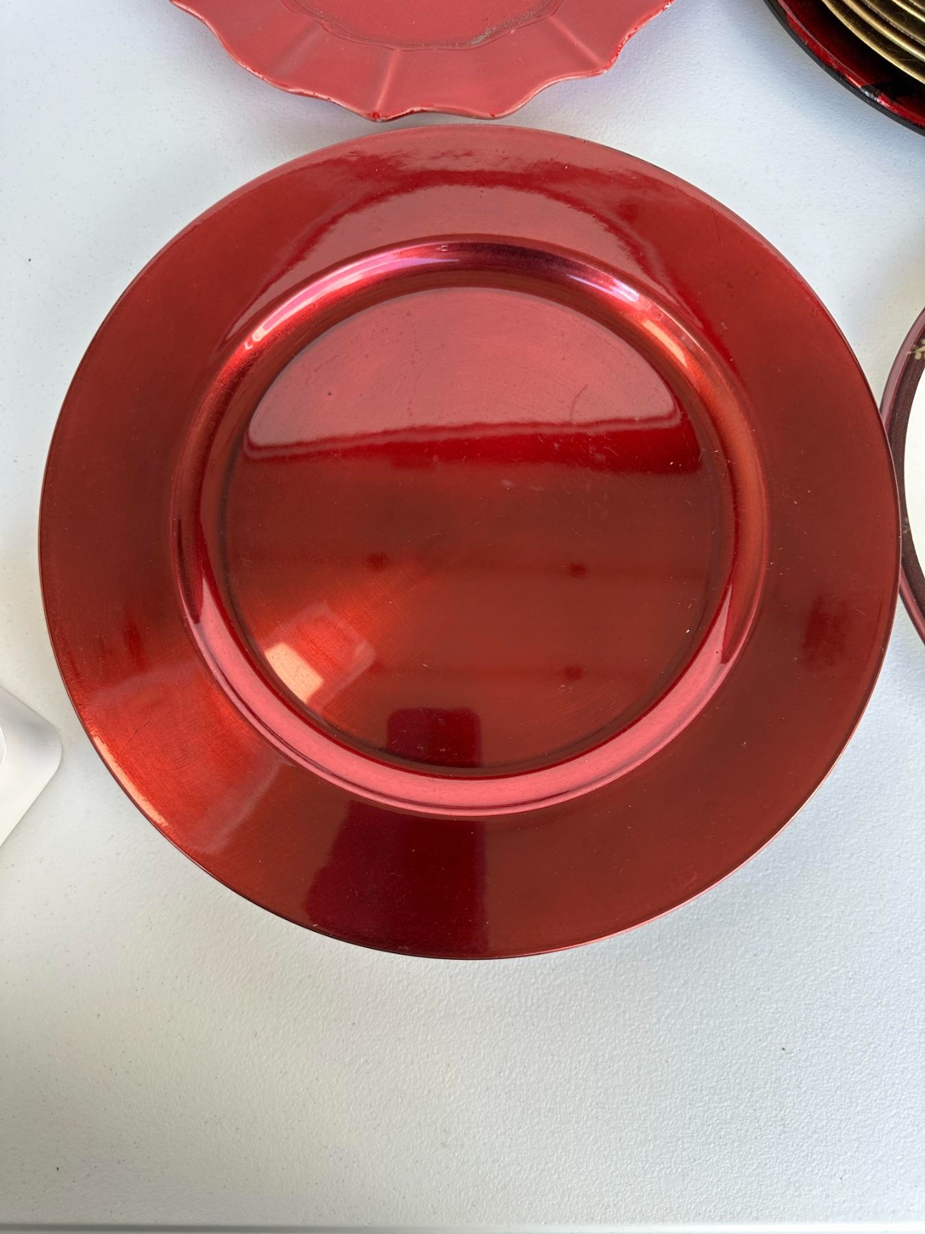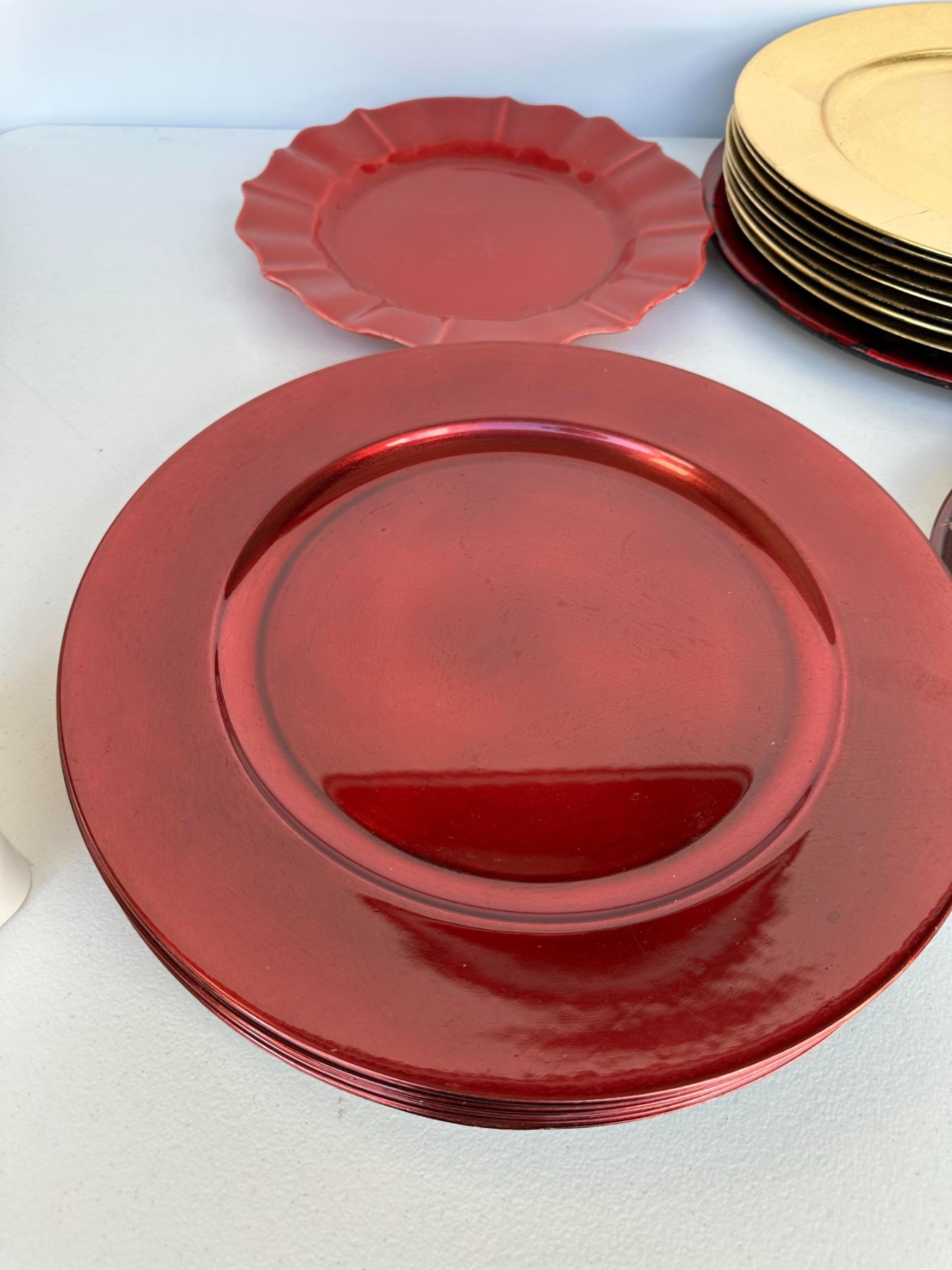 Group of assorted plates: rooster motif plate, scalloped red plate, red serving platter, and a stack of gold chargers. Eclectic collection for display or entertaining.