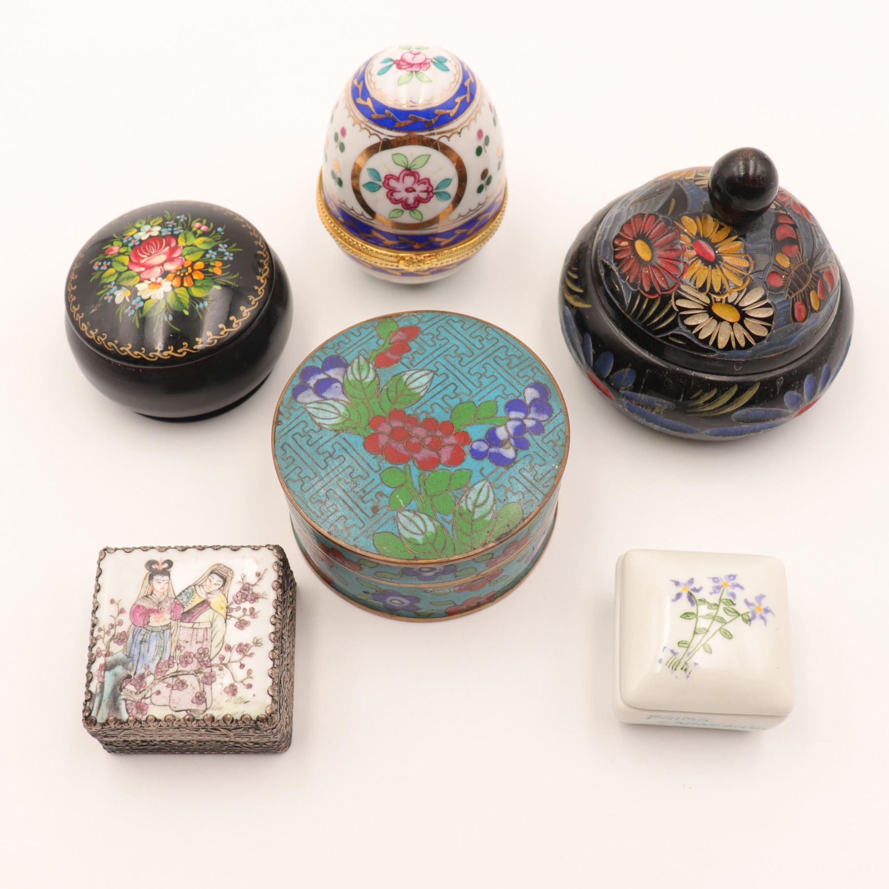 An assembled group of six small decorative trinket boxes in varied materials and styles, including two black floral-painted circular boxes, a mounted porcelain egg-form box, a turquoise-ground cloisonné enamel round box, a rectangular filigree-mounted figural box, and a small white porcelain floral pillbox inscribed “PRIMA CANADENSIS 27. IV. 92.126.” The lot combines painted, enameled, metal-mounted, and porcelain examples with good shelf and cabinet appeal. The cloisonné and filigree-mounted pieces add contrasting texture and color to the group, while the remaining boxes offer a range of decorative floral and figural motifs. General surface wear, rubbing, and minor scratches throughout; visible enamel wear and small losses to the cloisonné box; no major breaks noticed.