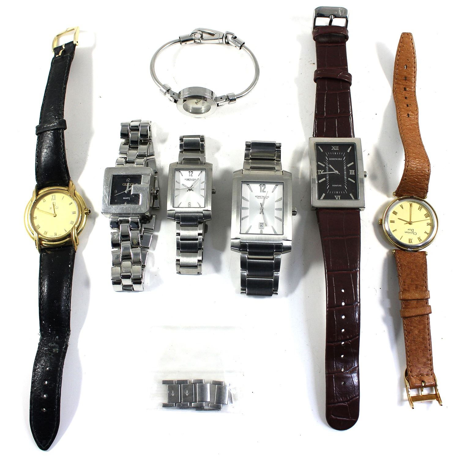 Seven (7). Various origins. Modern. Christian Dior, Fendi, Kenneth Cole, Coach & Gucci. Stainless steel and gold plated. 22mm to 32 mm case diameters. Running watches have not been tested for timekeeping accuracy and may require adjustment. The fact that a watch has been described as "running" provides no guarantee of its ability to continue to do so.