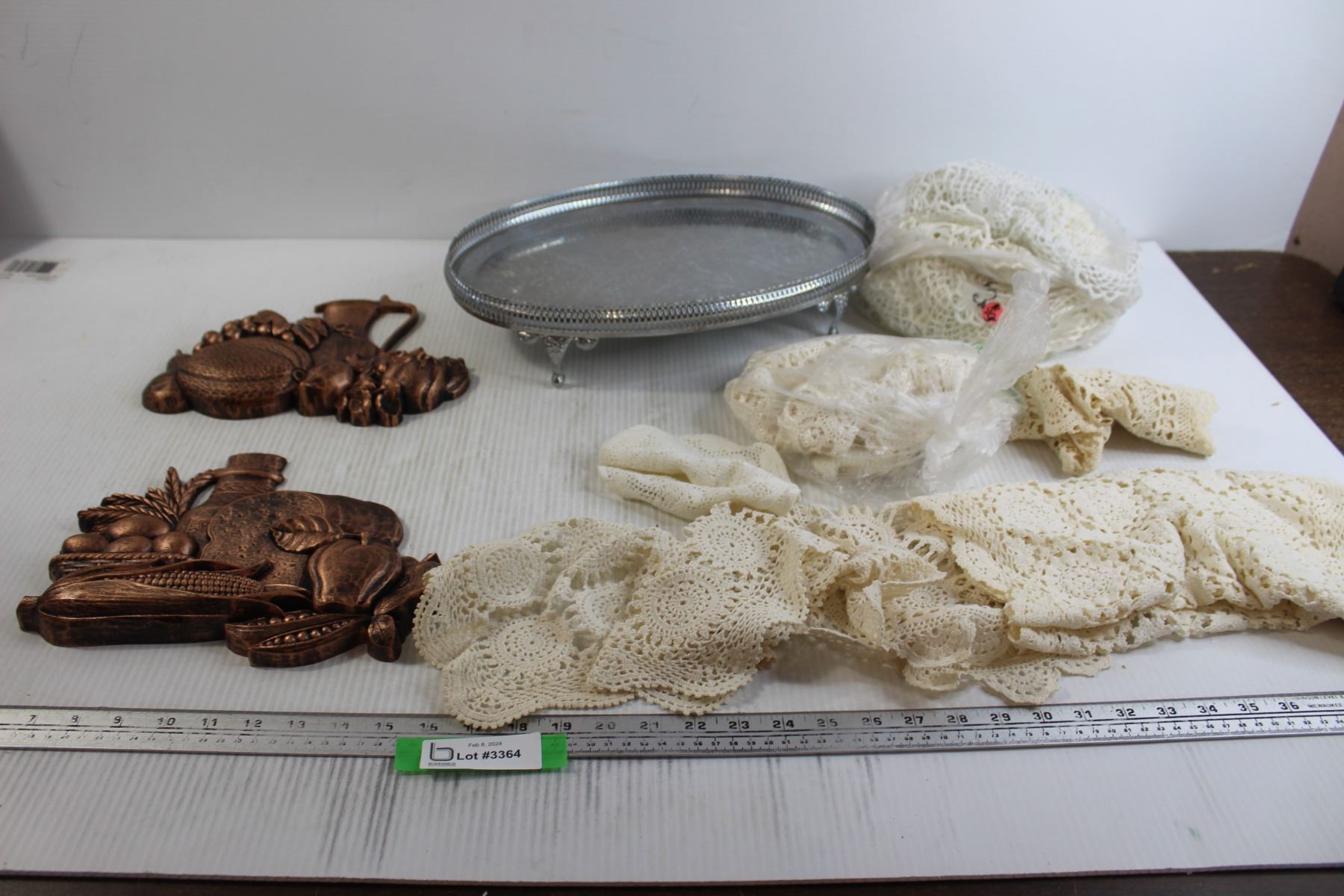Assorted Doilies, Metal Tray, (2) Wall Decorations