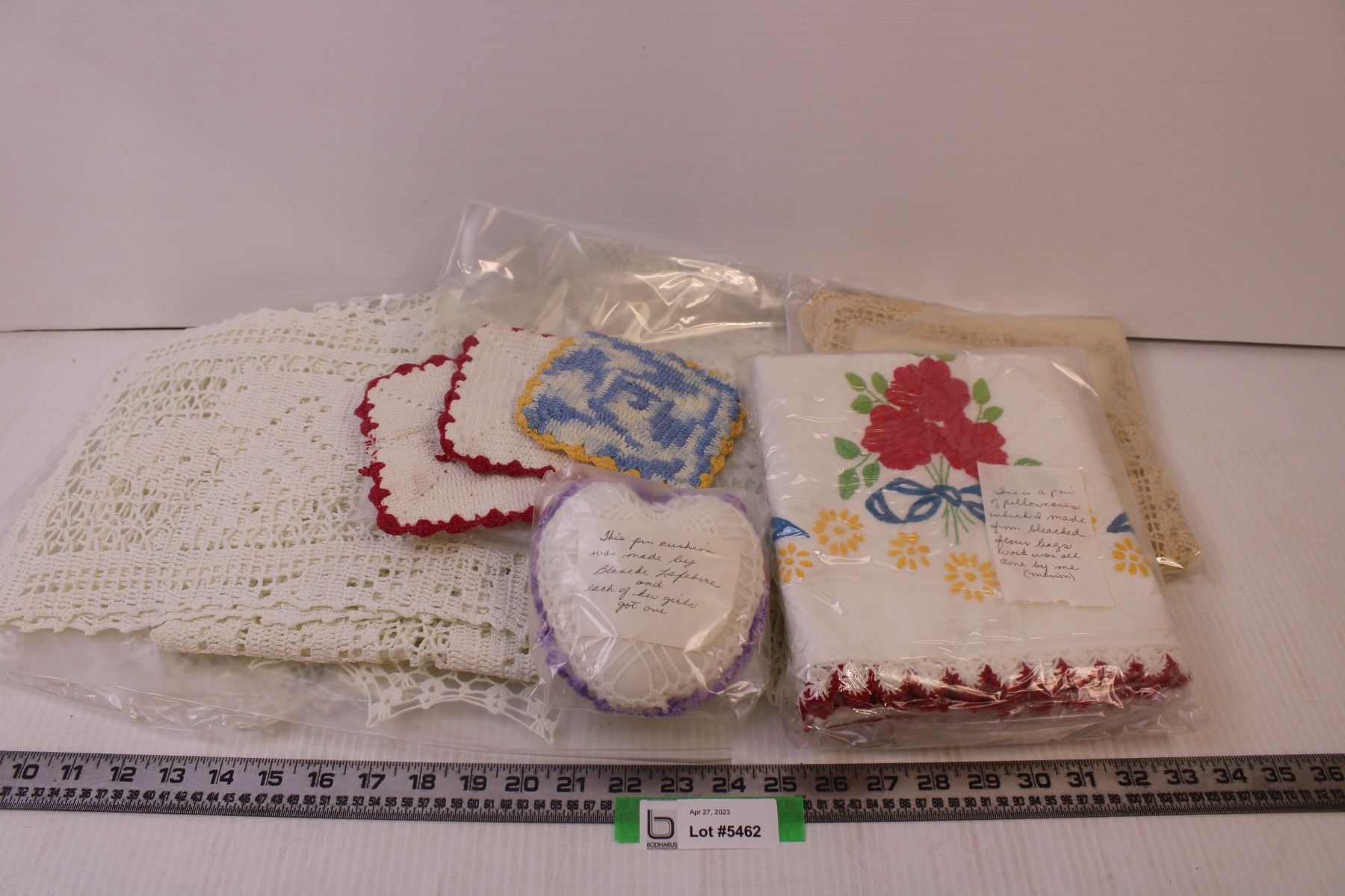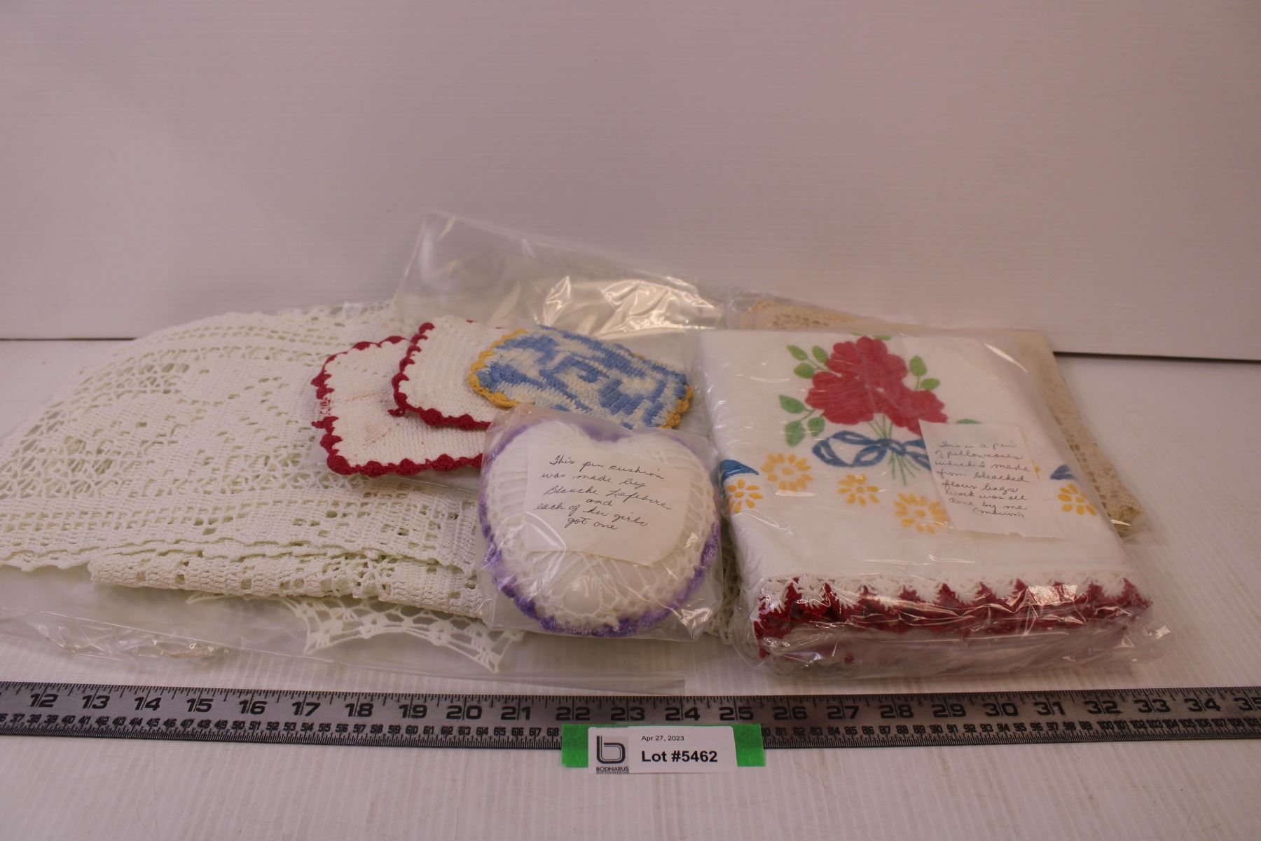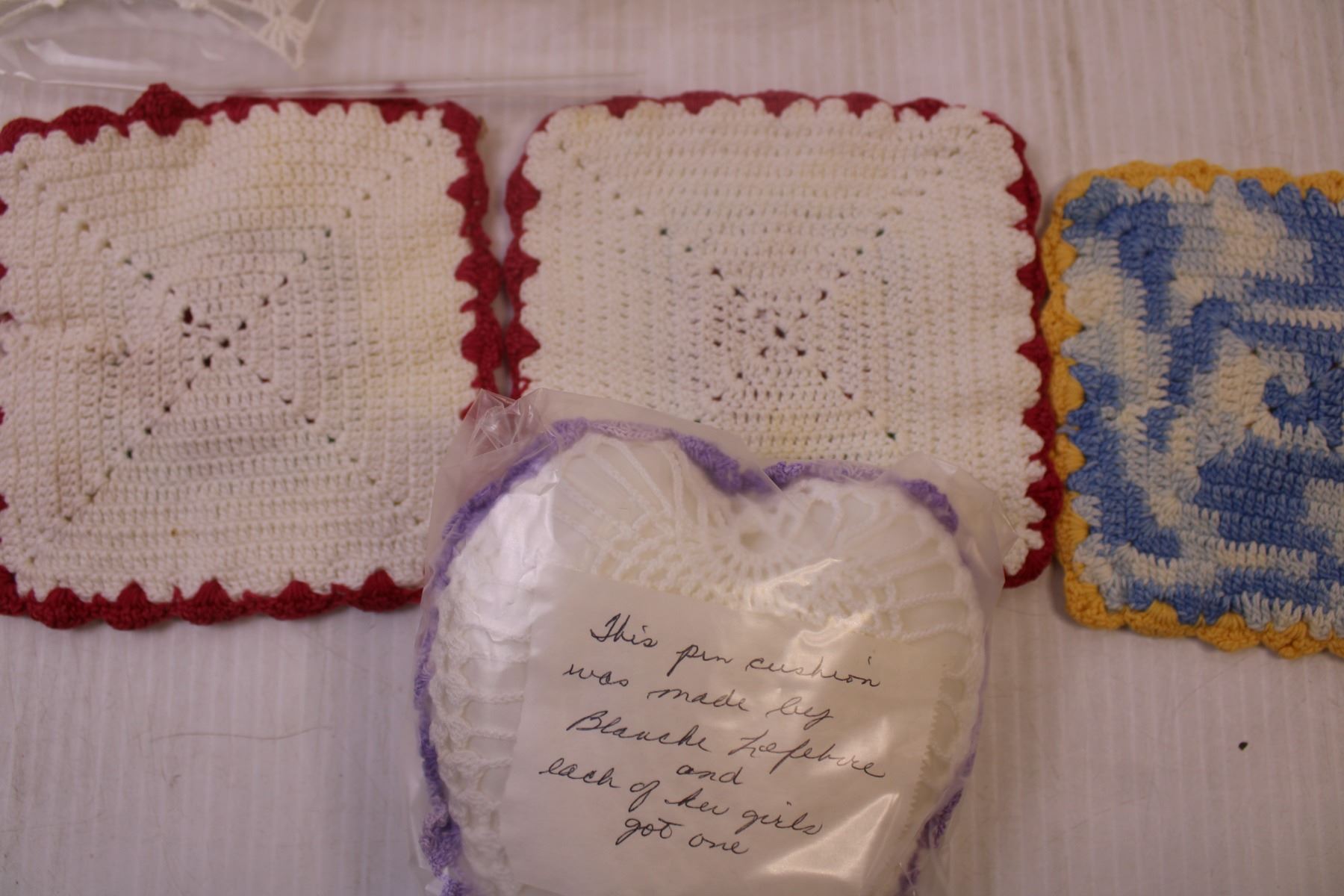 Assorted Doilies, table cloth, pin cushion, coasters, crotched and embroidered
