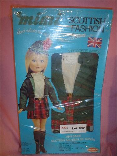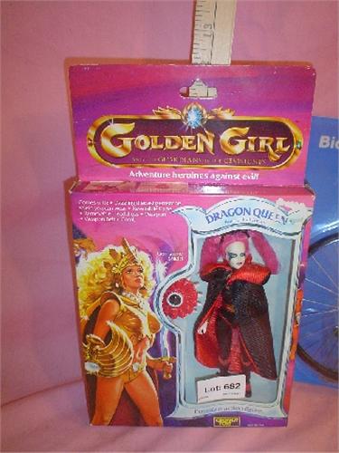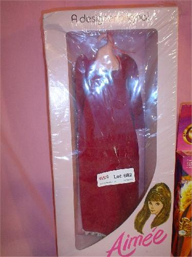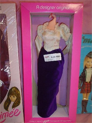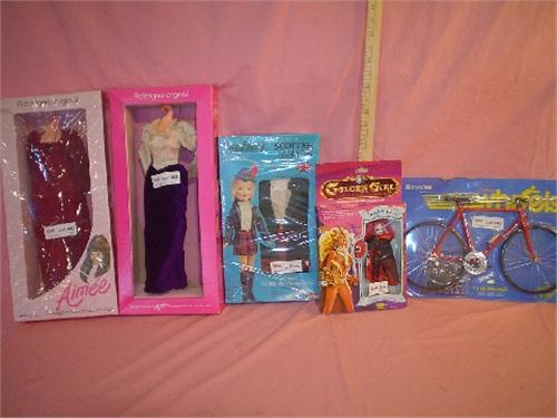 Assorted Doll Clothes & Doll Bike: 1)"Aimee" Red Velvet Gown #4772 by Hasbro 1972. In Orig. Box. 2)"Aimee" Victorian Gown #4771 by Hasbro 1972. In Orig. Box. 3)"Mimi" Scottish Fashion #3504 by Remco 1973. In Orig. Box. 4)"Golden Girl" & The Guardians of the Gemstones Costume. #51/216. In Orig. Box by Croner Toys 1984. Never Opened. 5)"Wheels" Bicycle. Made in Taiwan. New in Orig. Pkg. Never Opened