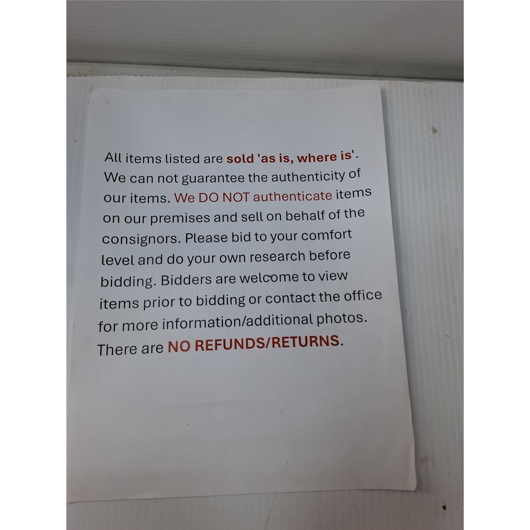 If you are wanting to hold on items for another auction coming up, let us know within 24 hours (maximum hold: 2 auctions). Please give 15 to 30 days for items to be collected, packed, payment processed and shipped out.