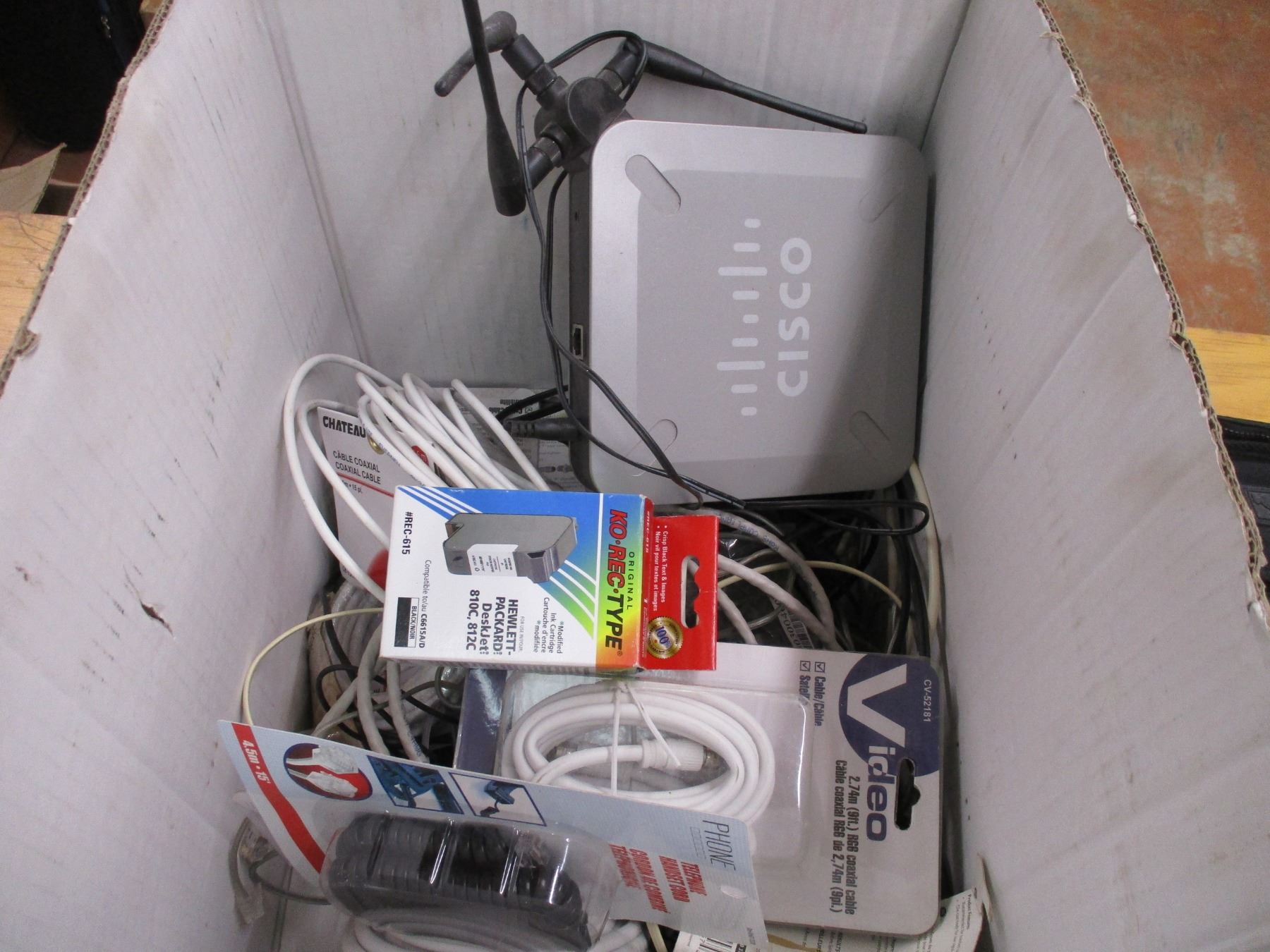 Assorted Electronics Cables and Ink Vacuum in Box