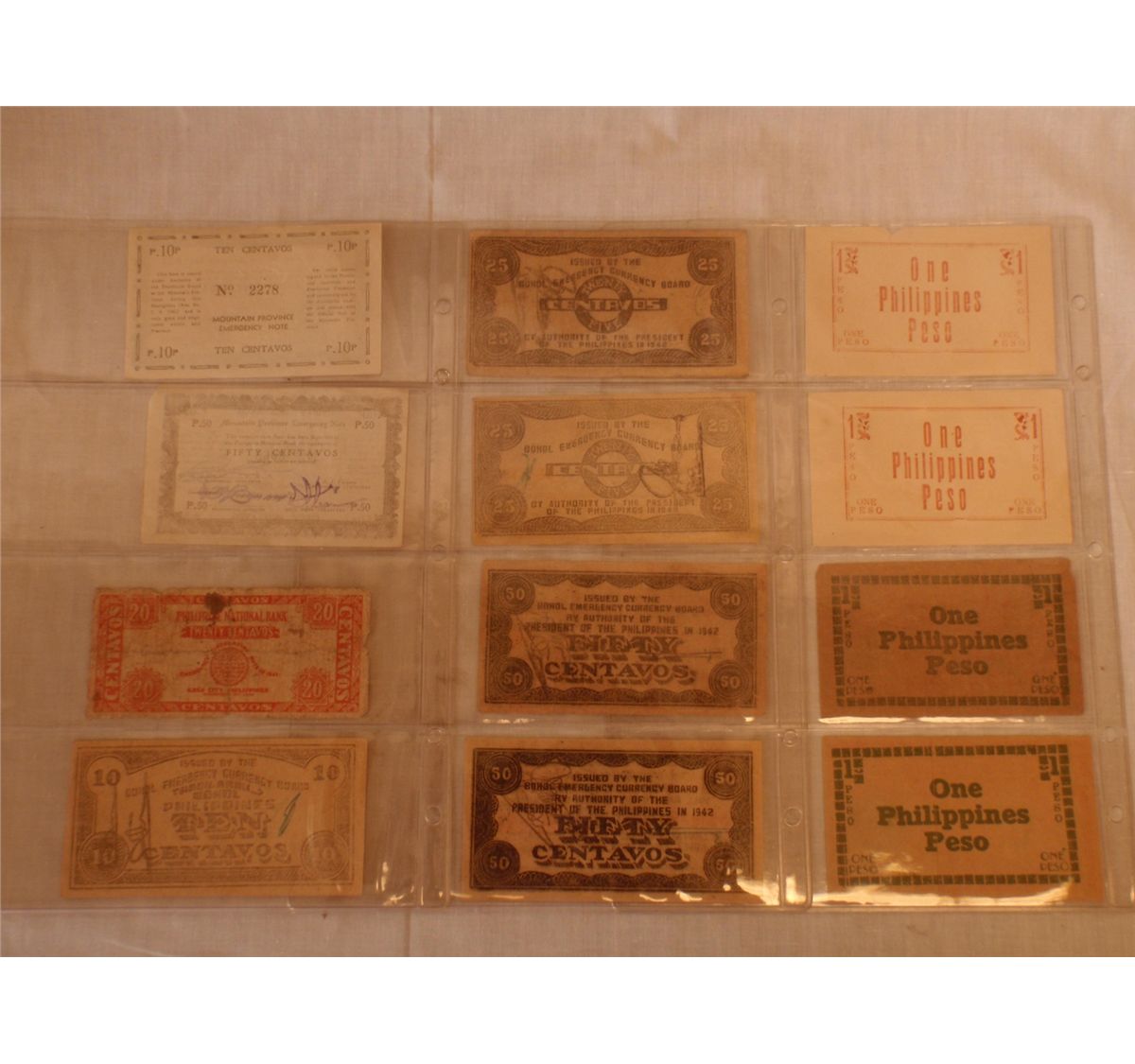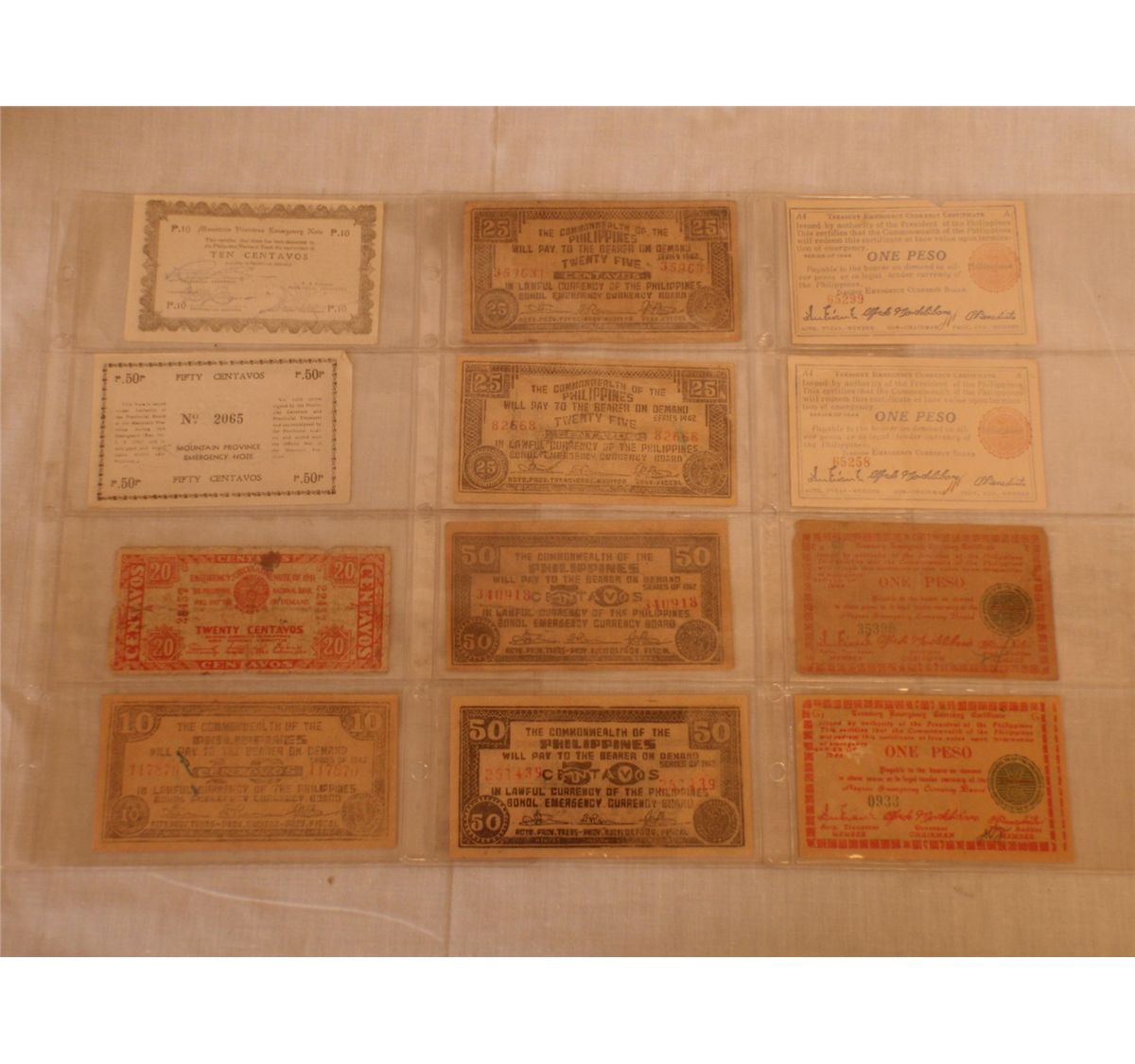 Total of 12 Philippine Emergency Bank Notes. Ranging from 10 Centavos to One Peso. In 1942, the Japanese occupiers introduced notes for use in the Philippines. Emergency circulating notes (also termed "guerrilla pesos") were also issued by banks and local governments, using crude inks and materials, which were redeemable in silver pesos after the end of the war. The Japanese-sponsored Second Philippine Republic under José P. Laurel outlawed possession of guerrilla currency and declared a monopoly on the issuance of money and anyone found to possess guerrilla notes could be arrested. (No longer a law, you will not be arrested for purchasing or owning these notes)
