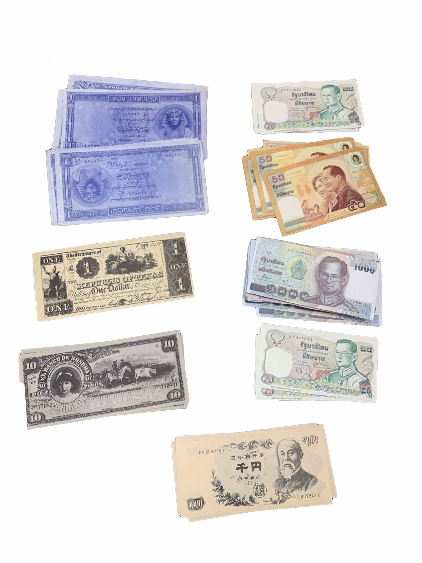 Set of assorted currency notes featured in film and television. This set consists of various faux currency that were used in various television shows and film productions. These are all printed on high quality paper and remain in excellent condition.