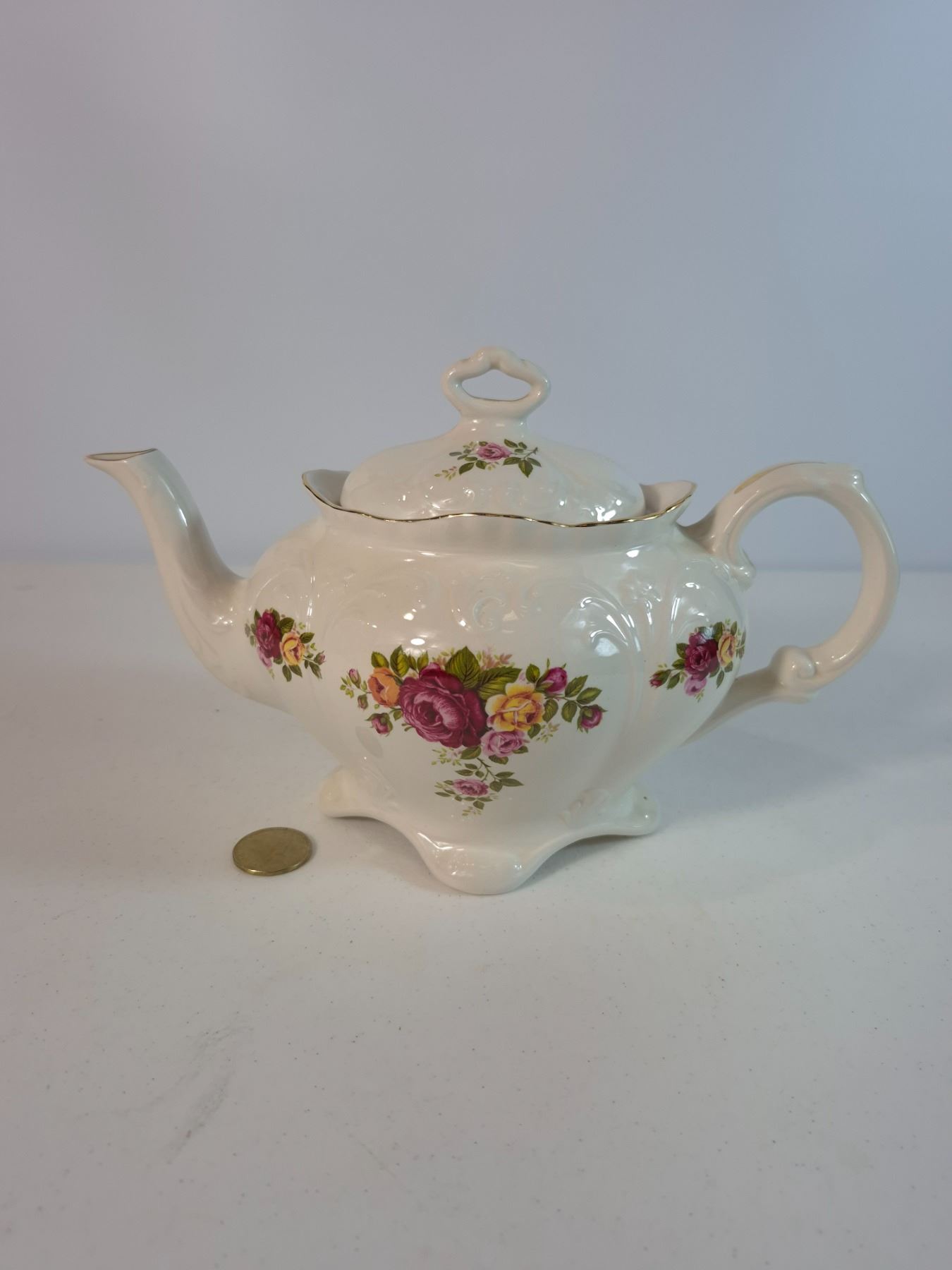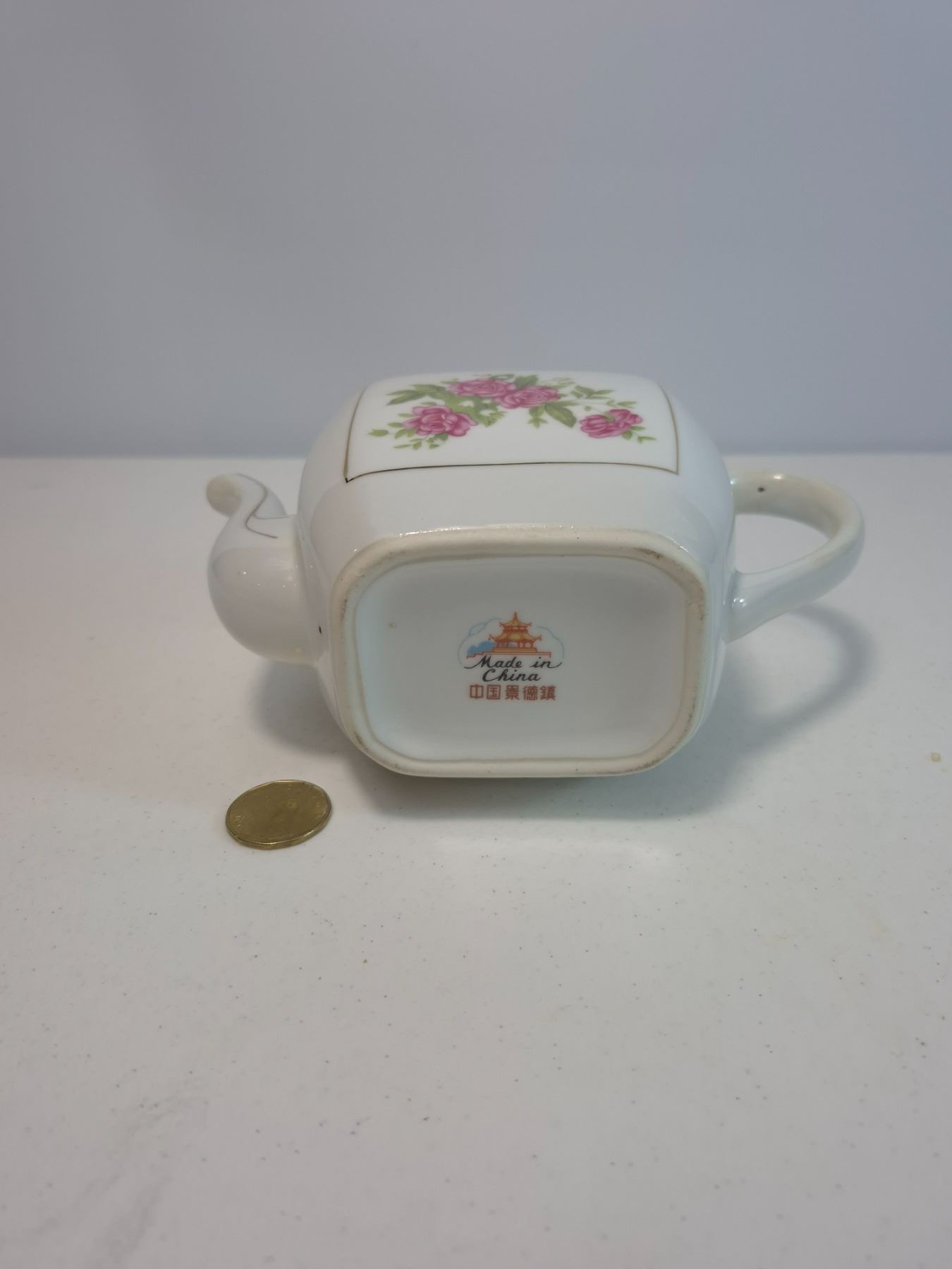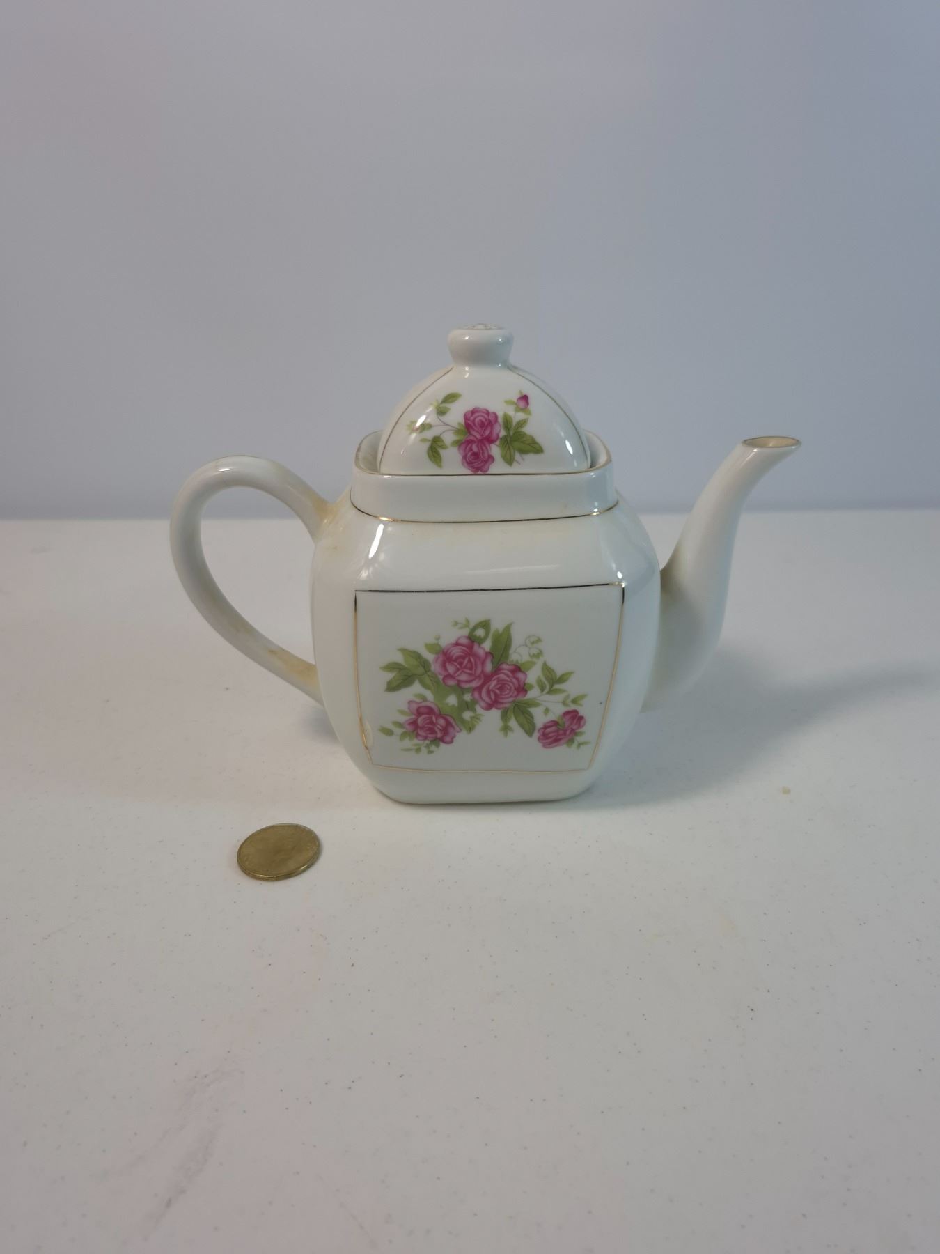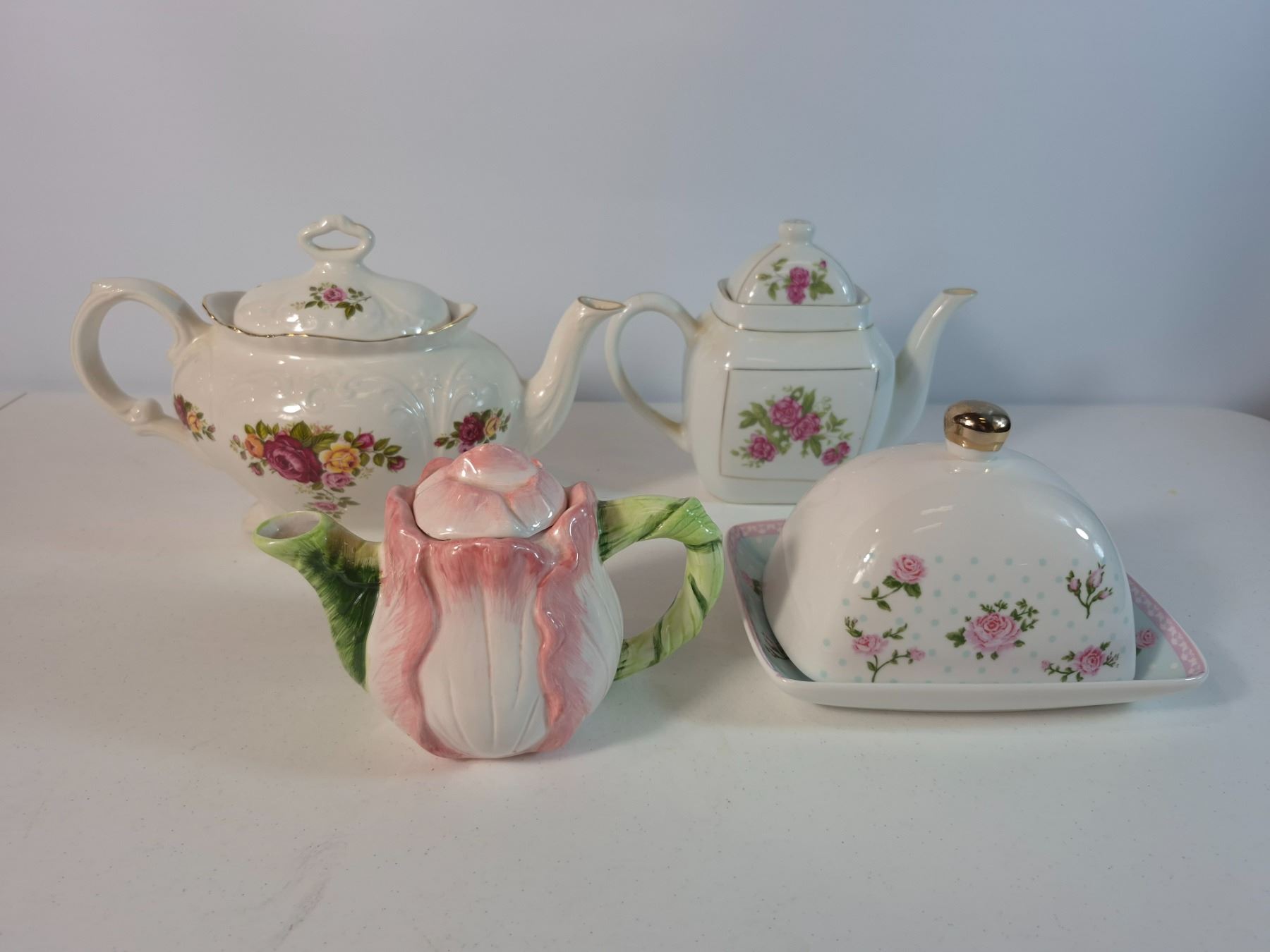 Mixed porcelain teapots with floral designs and a matching covered butter dish. Likely mid-20th century. Minor wear from age and use.