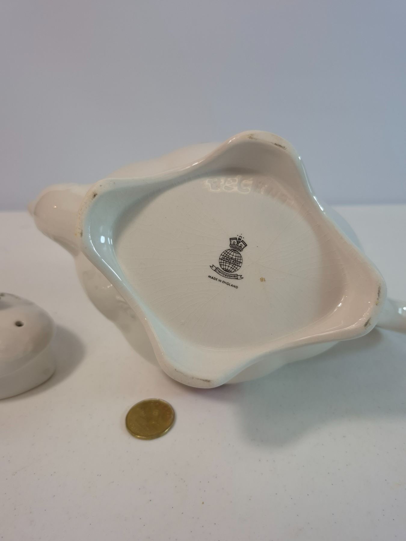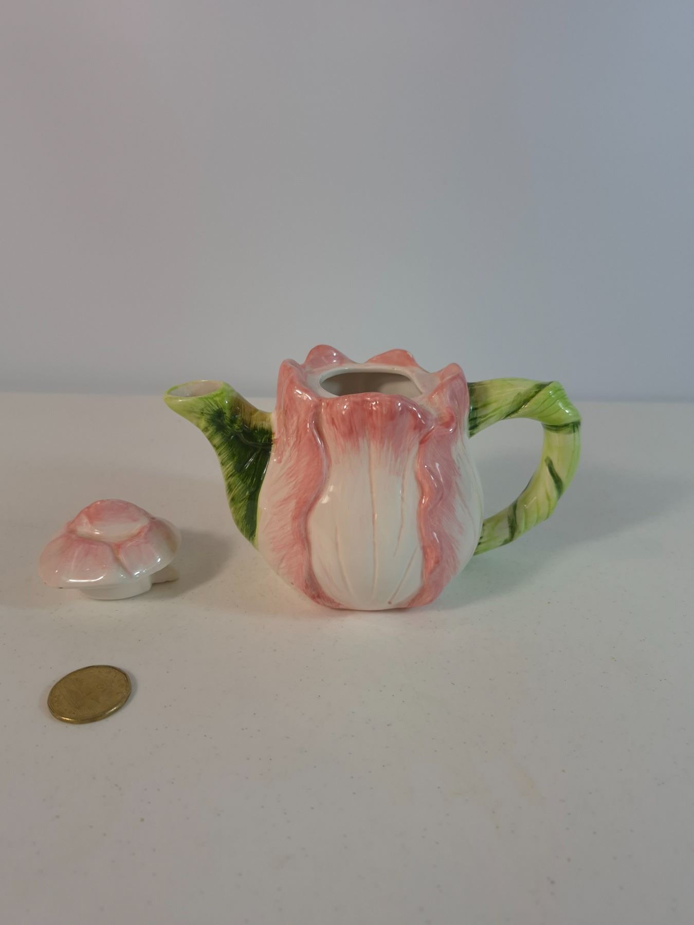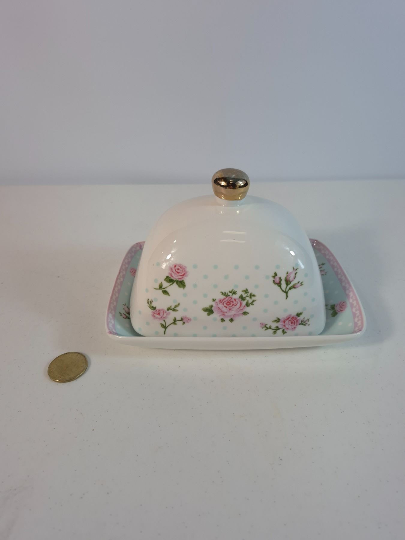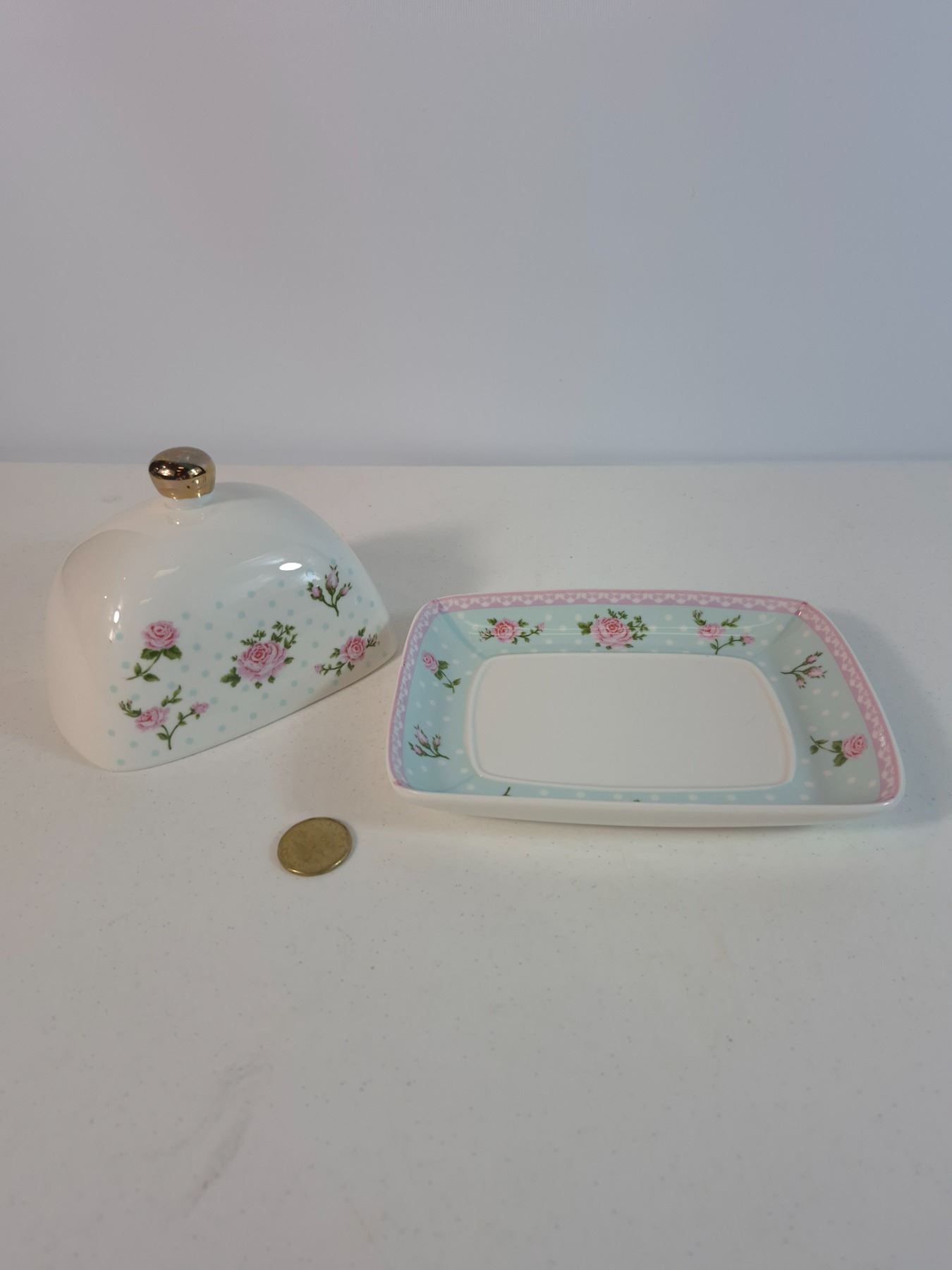 Mixed porcelain teapots with floral designs and a matching covered butter dish. Likely mid-20th century. Minor wear from age and use.