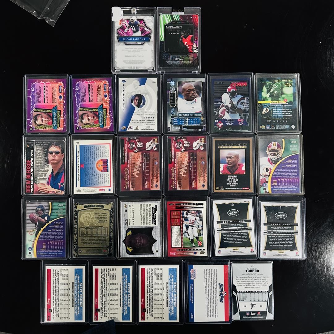 This mixed lot features an exciting variety of football cards, highlighting legends, rookies, autographs, and inserts across multiple decades. Notable names include Joe Montana, Barry Sanders, Warren Moon, Eddie George, and current stars like Micah Parsons. Standouts include a Parsons rookie relic card and a signed card of Rams receiver Aaron Jarrett. With a range of brands like Topps, Score, Leaf, Playoff, and Fleer, this diverse bundle offers strong collector value across eras and positions.