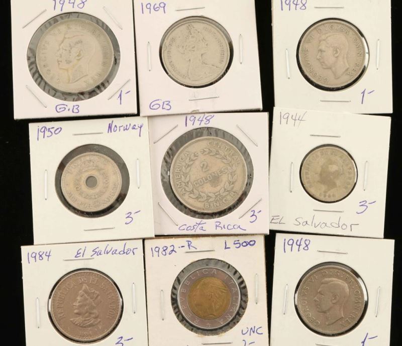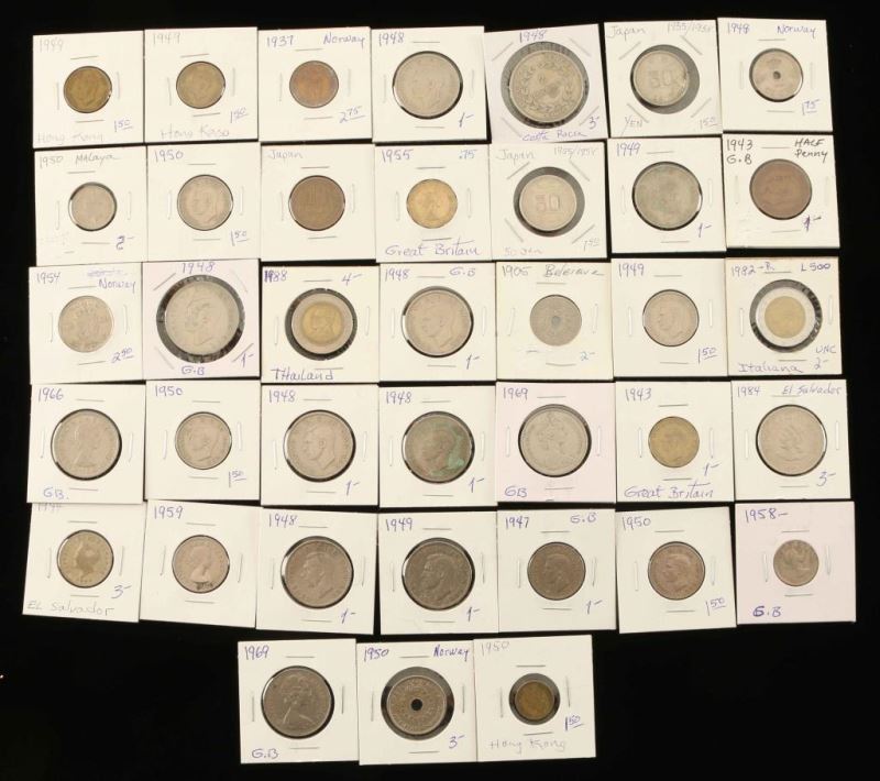Including; Pence, coins from Hong Kong, Krone, Shillings, Centavos, Ore, Half Penny and more.
