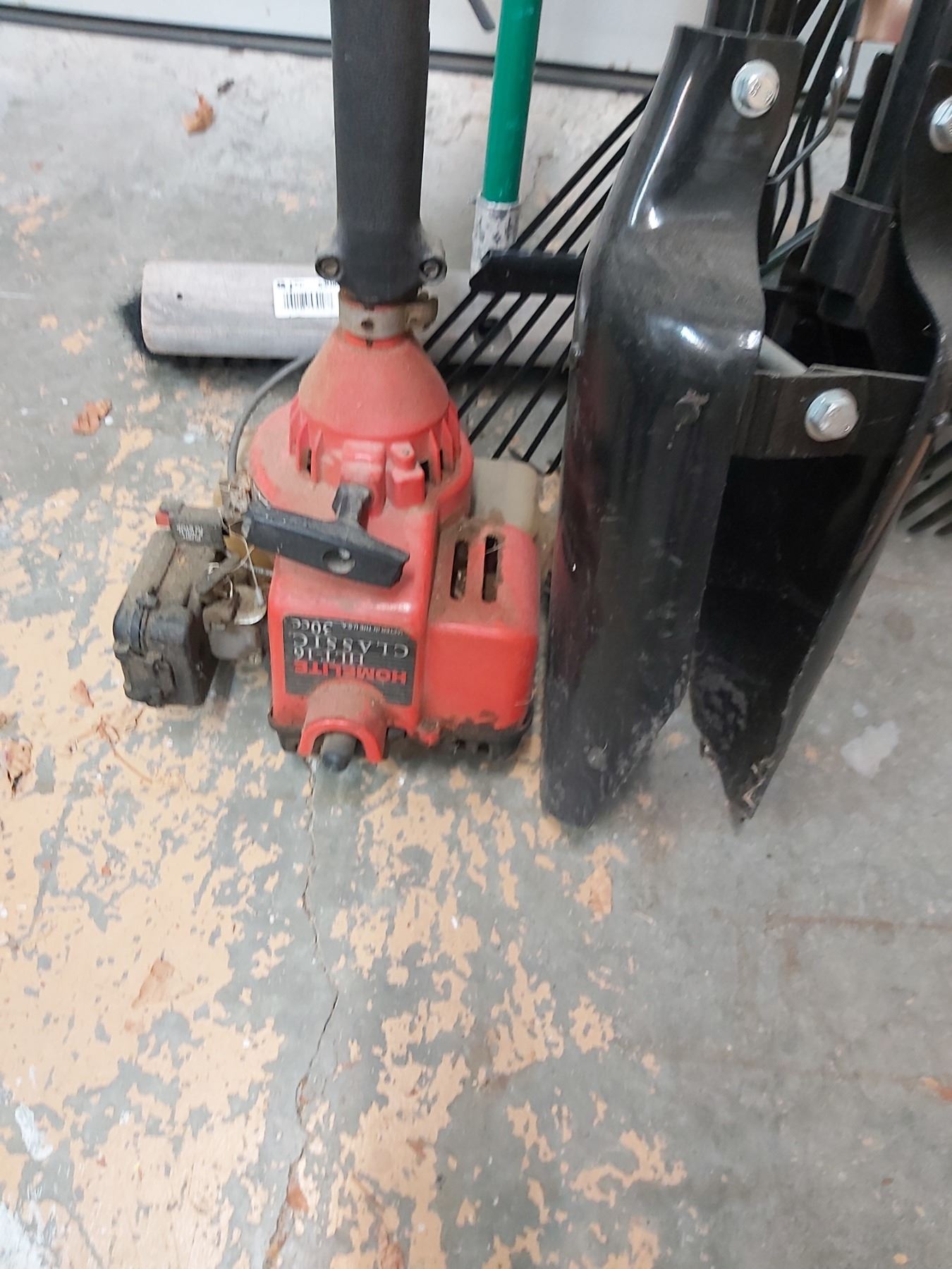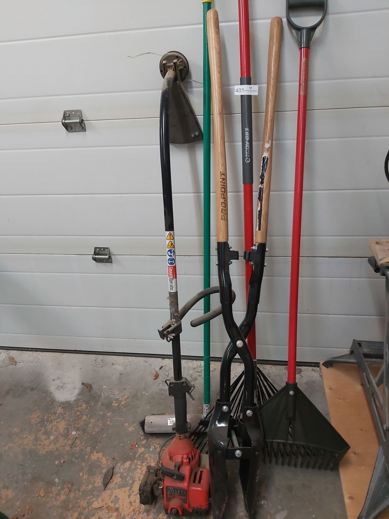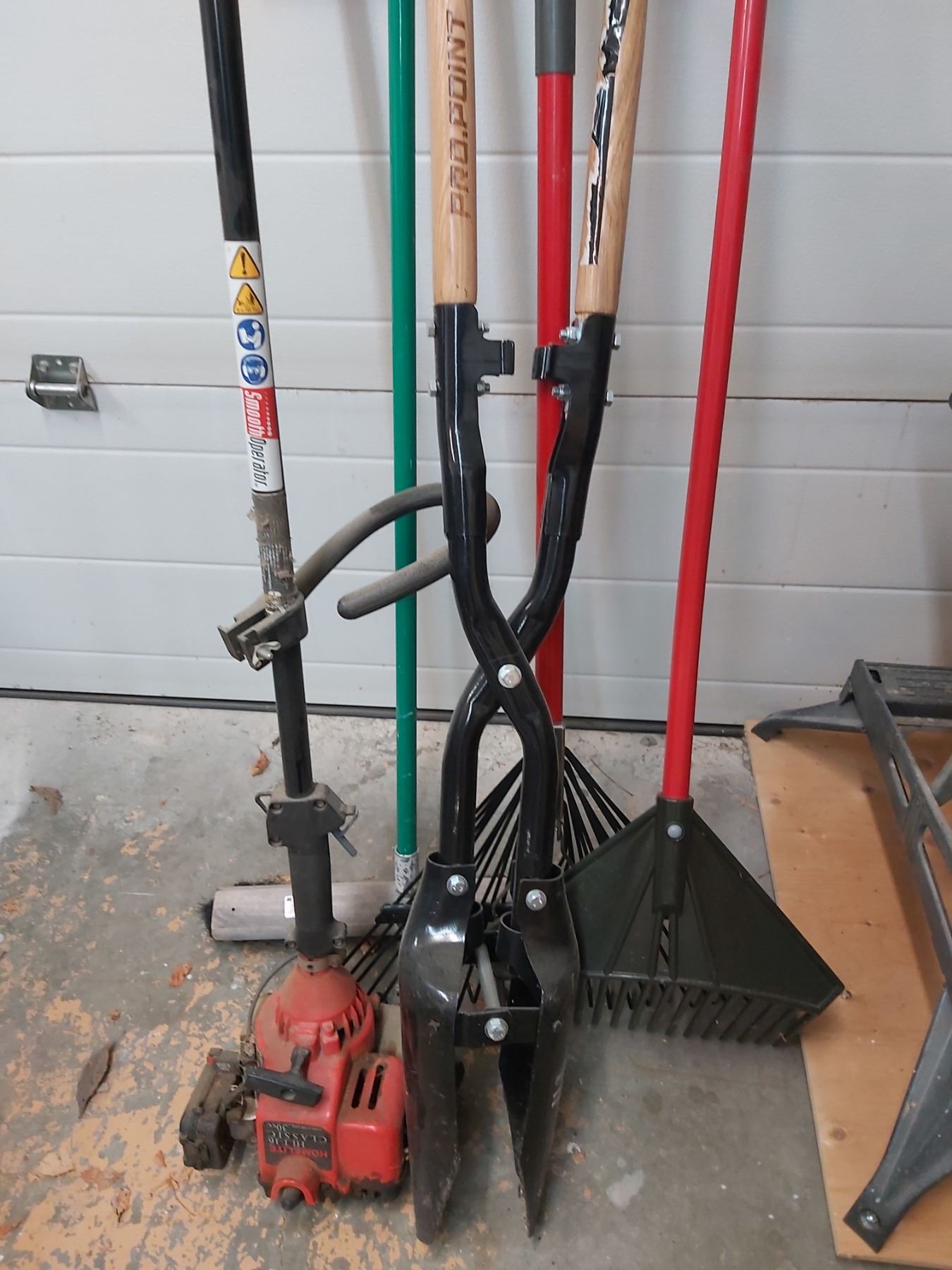 Assorted Garden Tools including Post Hole Digger, Rakes, Homelite HLT-16 Weed Whacker & More