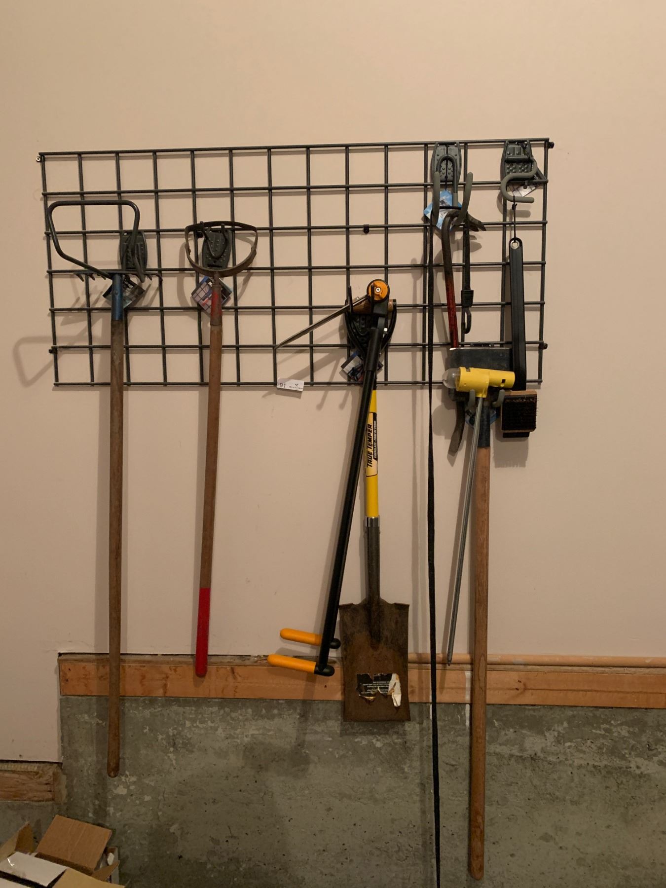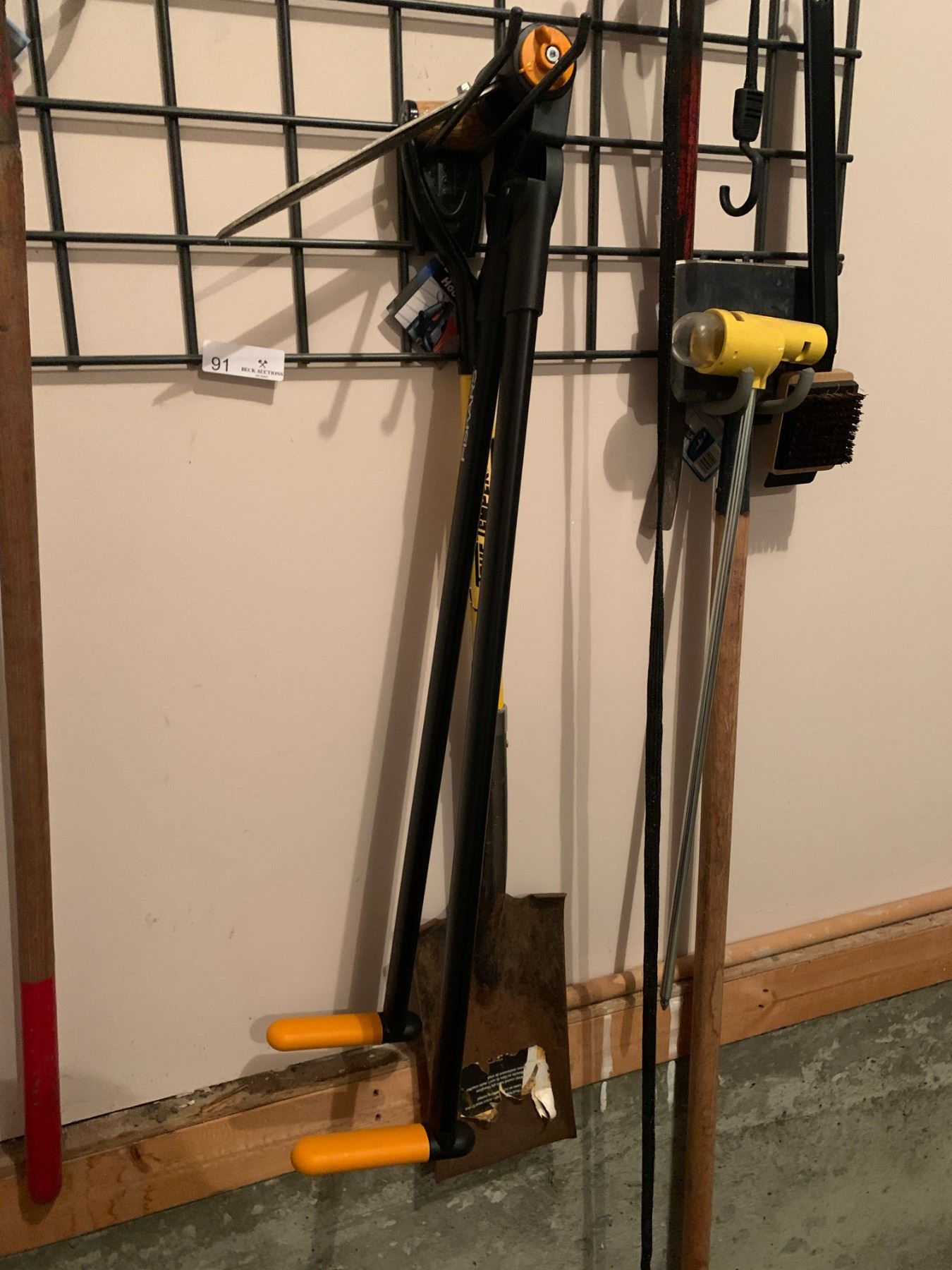 Including rake, shovel, ice pick, crowbar, and Fiskars tree pruner