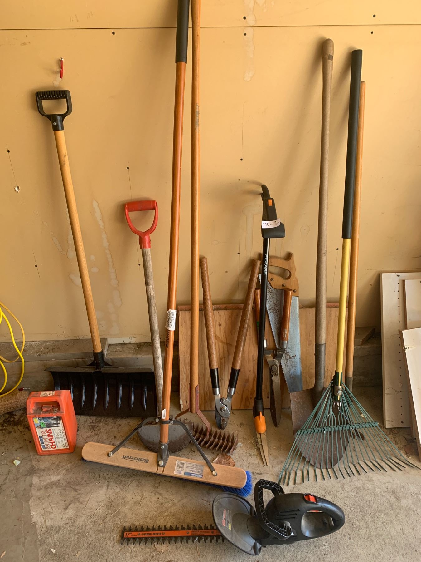 Also includes: shovels, hedge trimmers (electric and manual), tree pruner, snow shovel, Black and Decker handsaw, and push broom