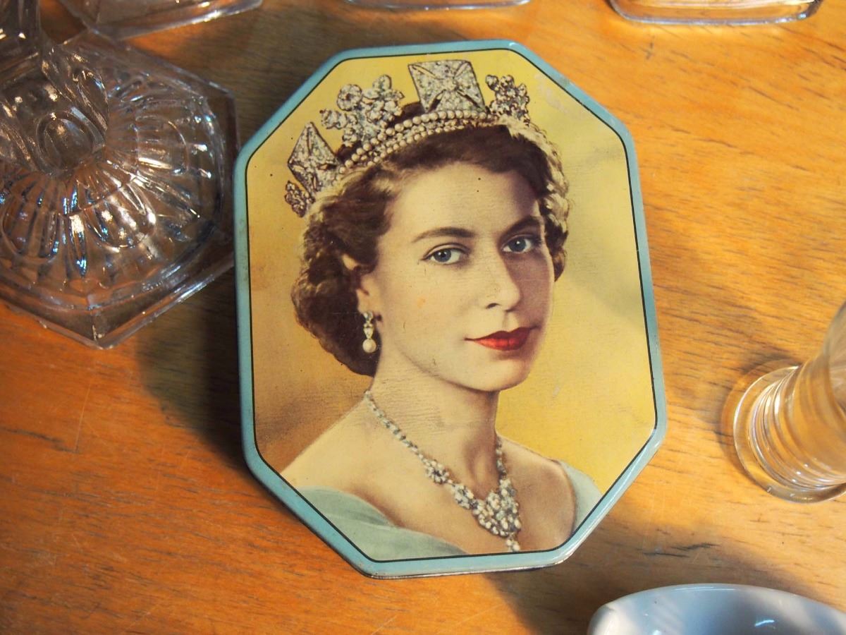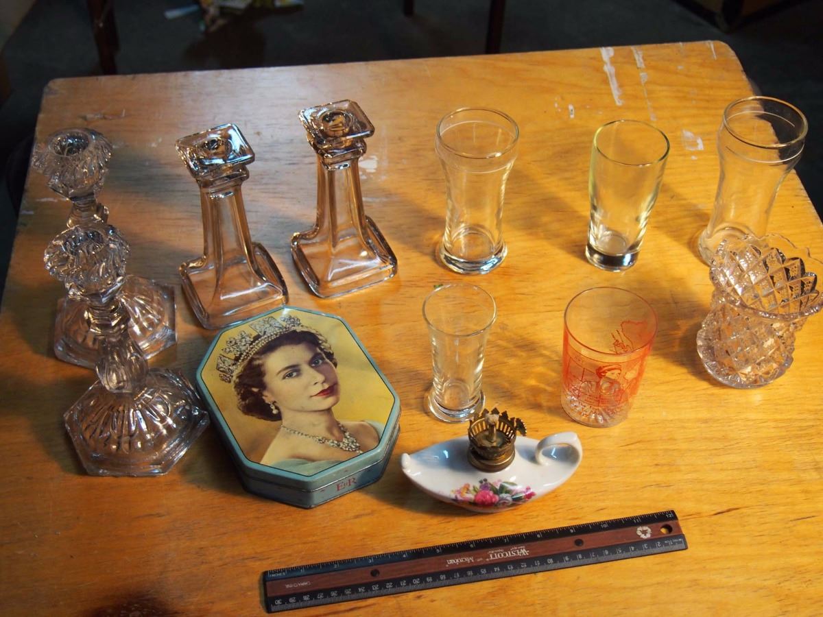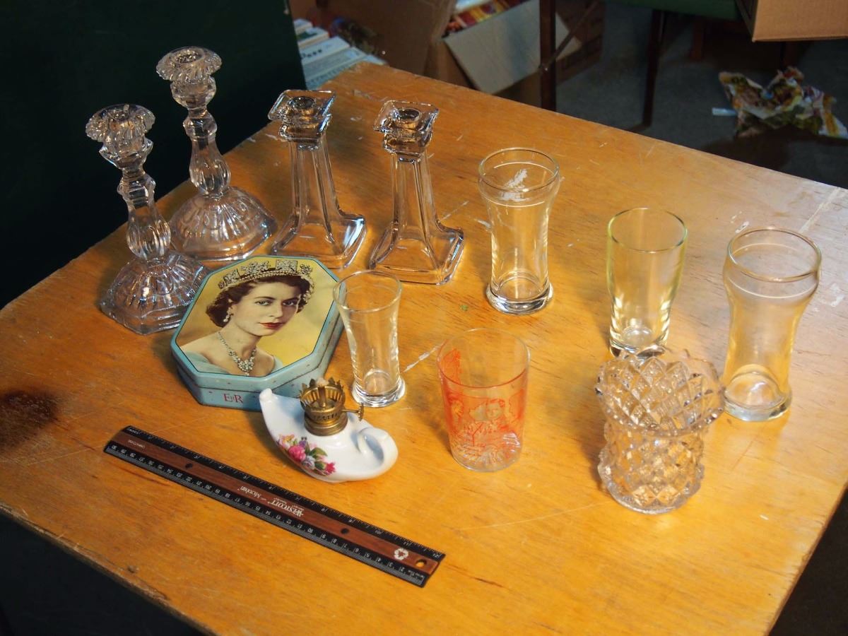 Assorted Glasses And Glass Candlestick Holder, Lamp, Tin