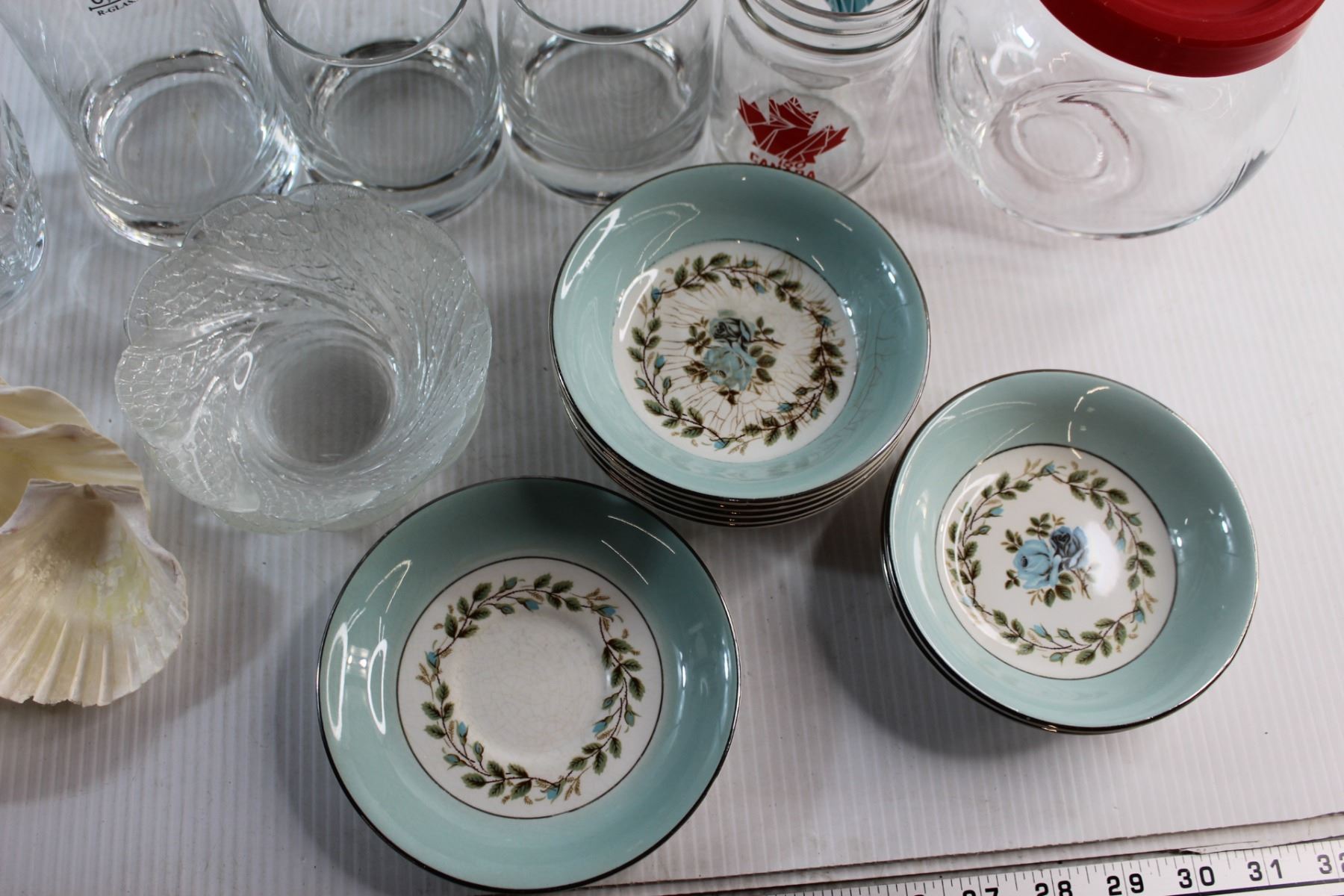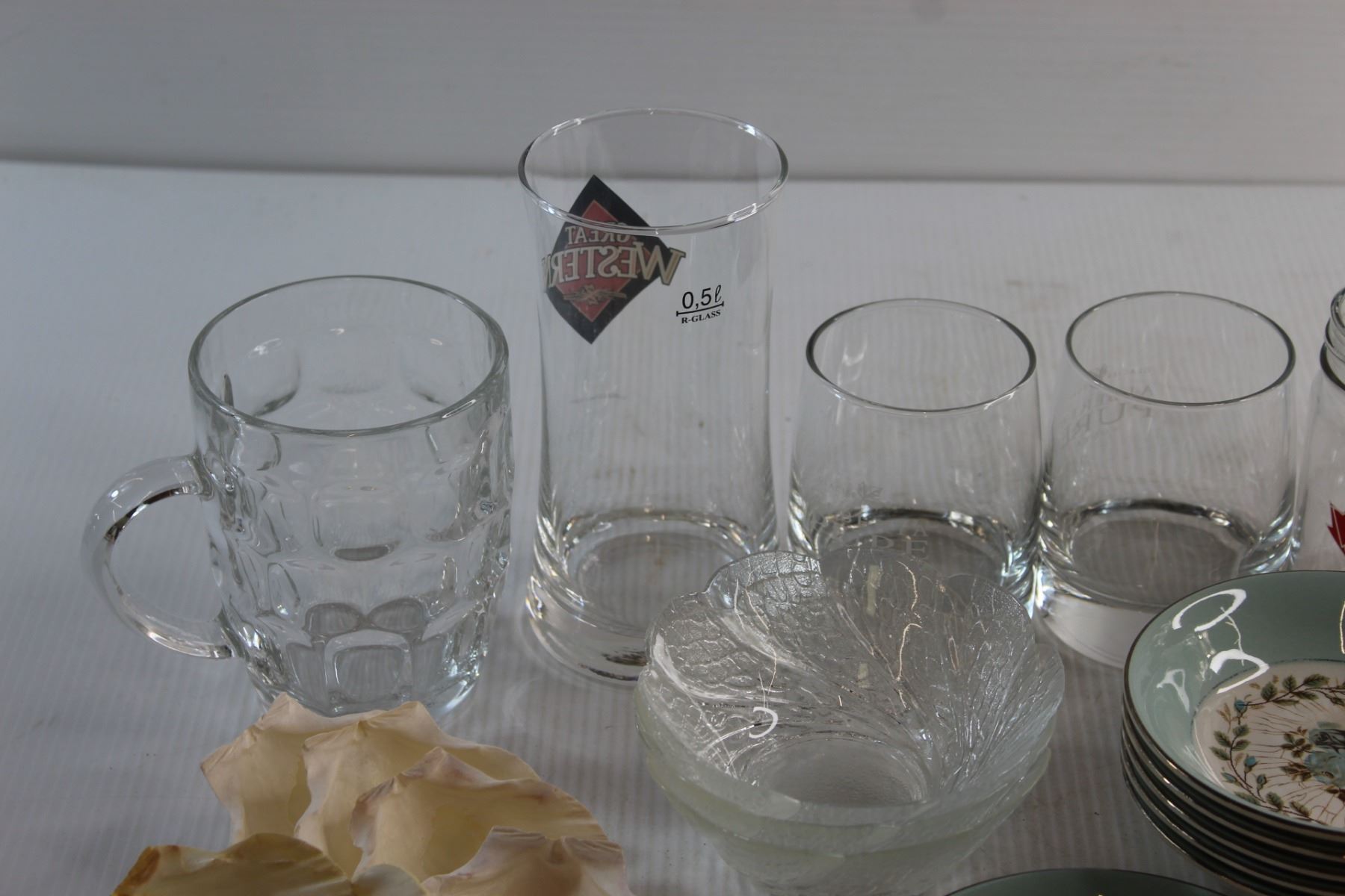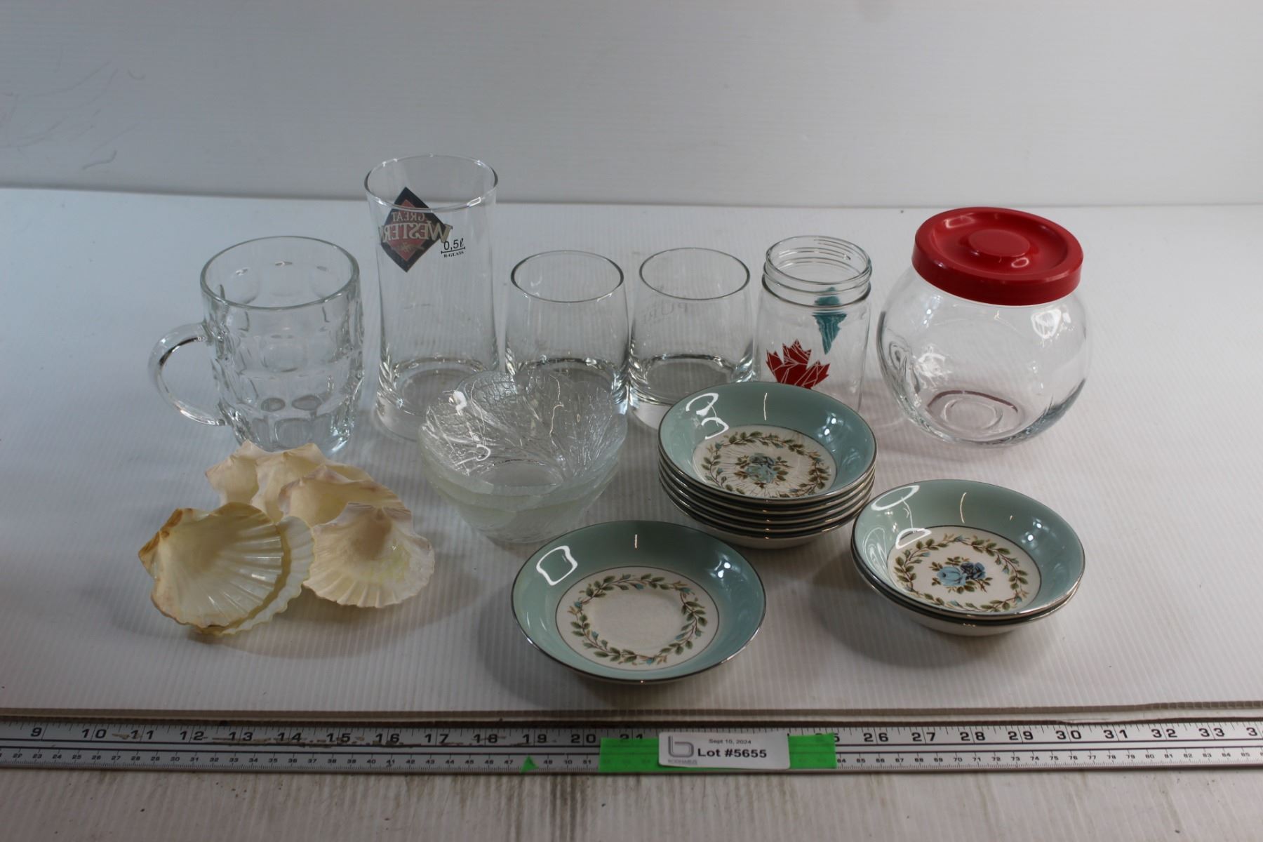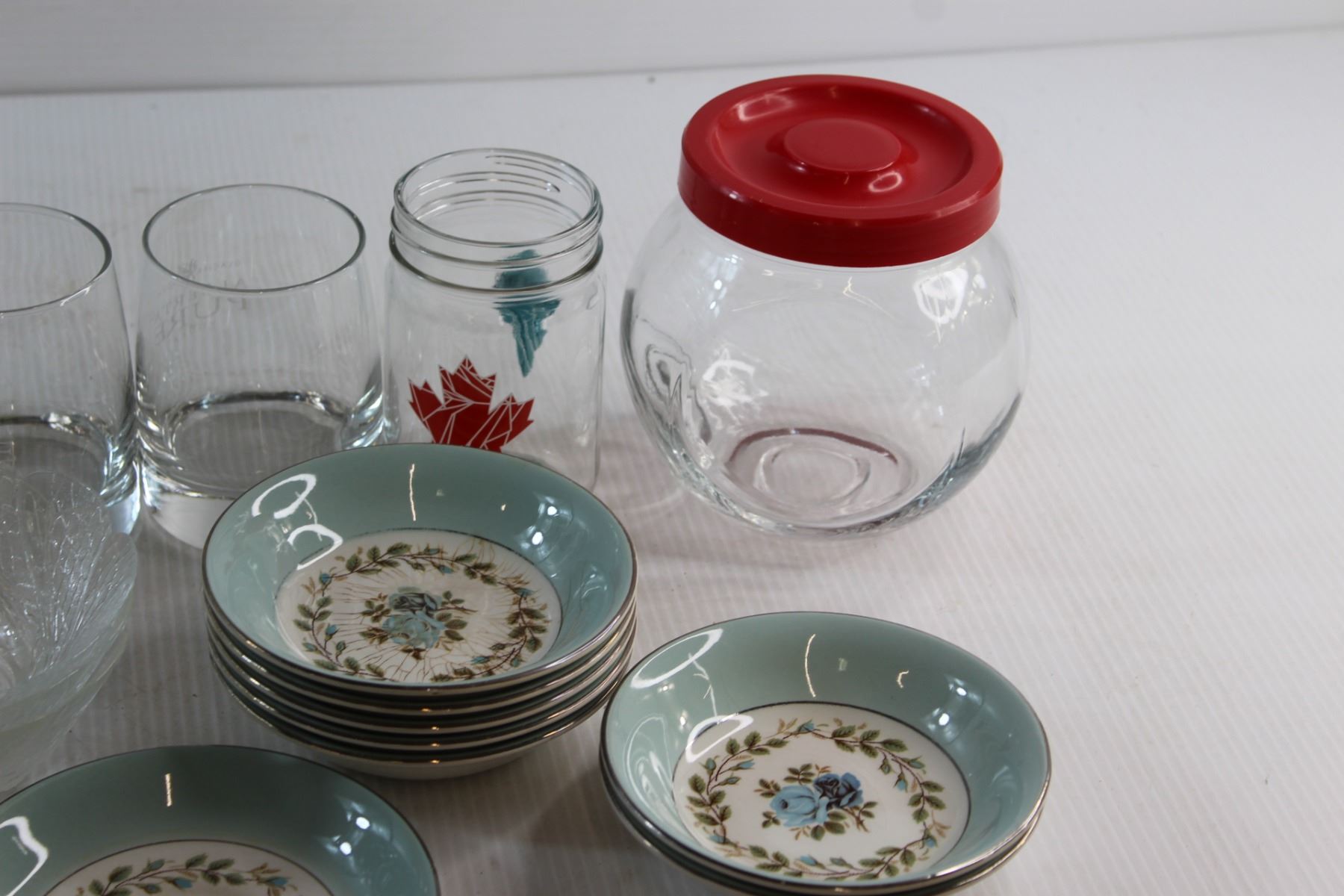 Assorted Glasses, Mug Cookie Jar, Miniature Plates and Assorted Items
