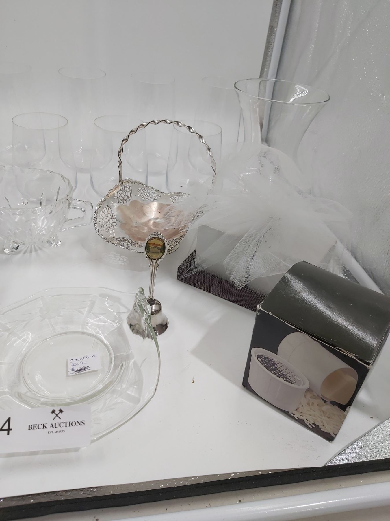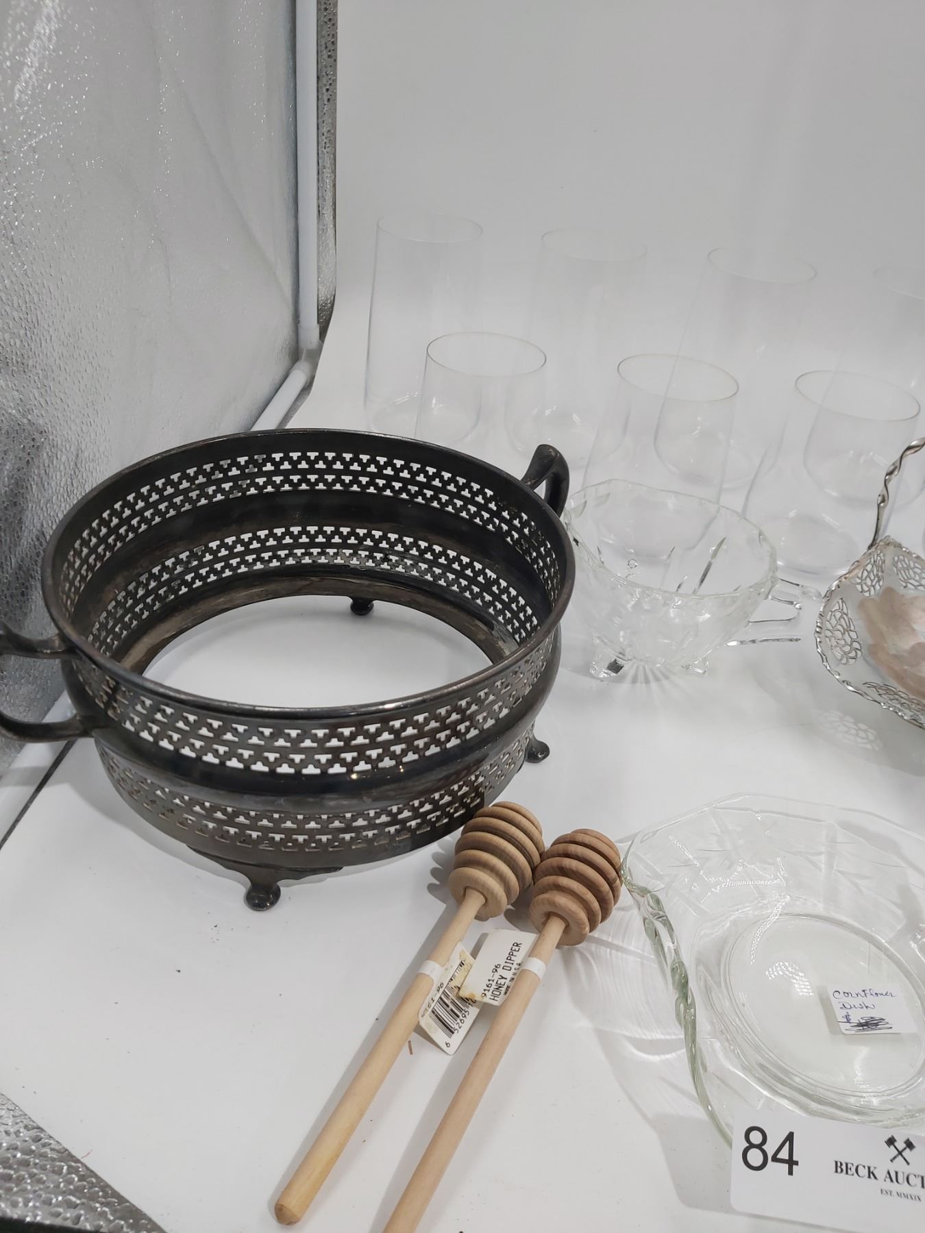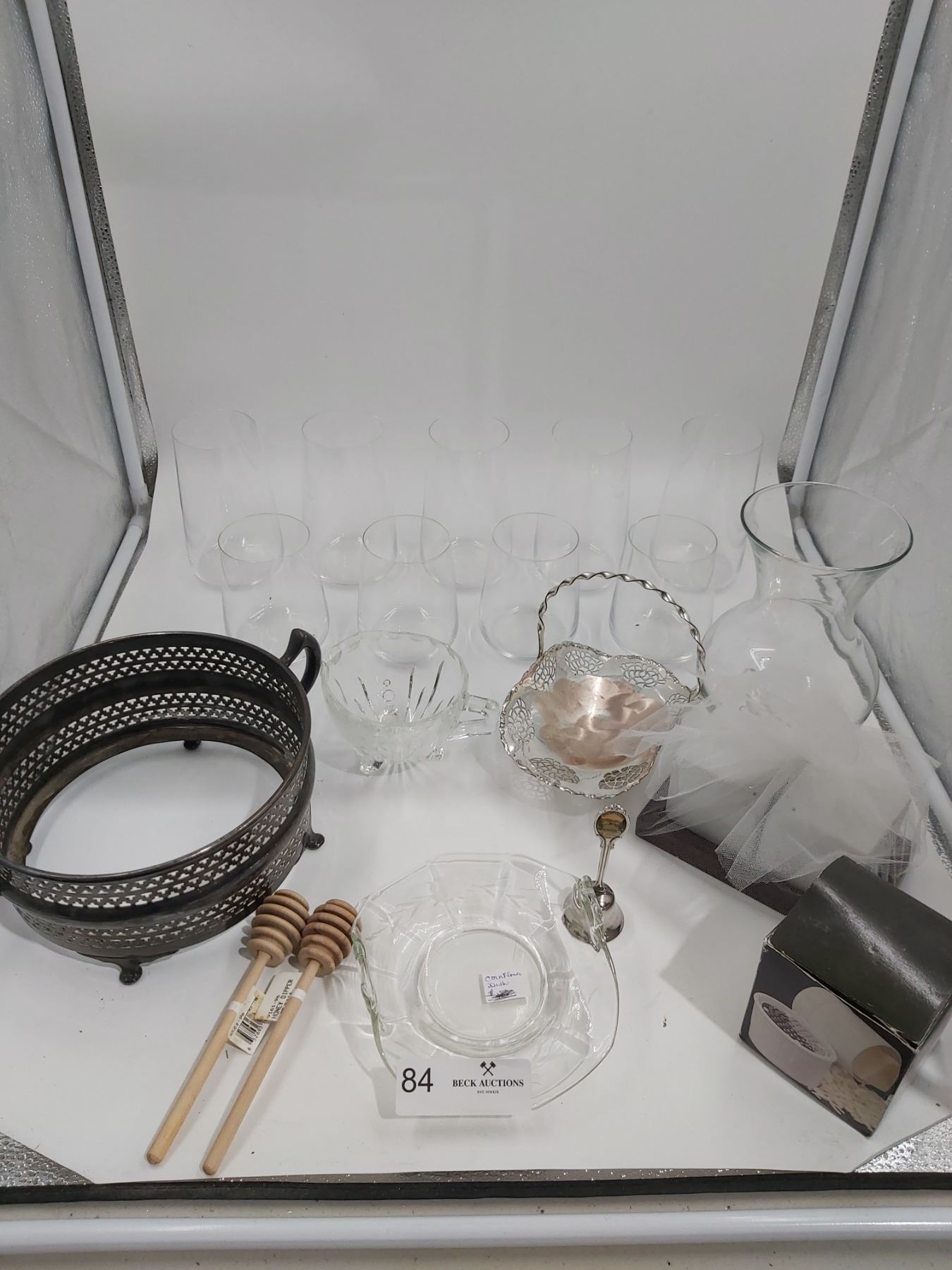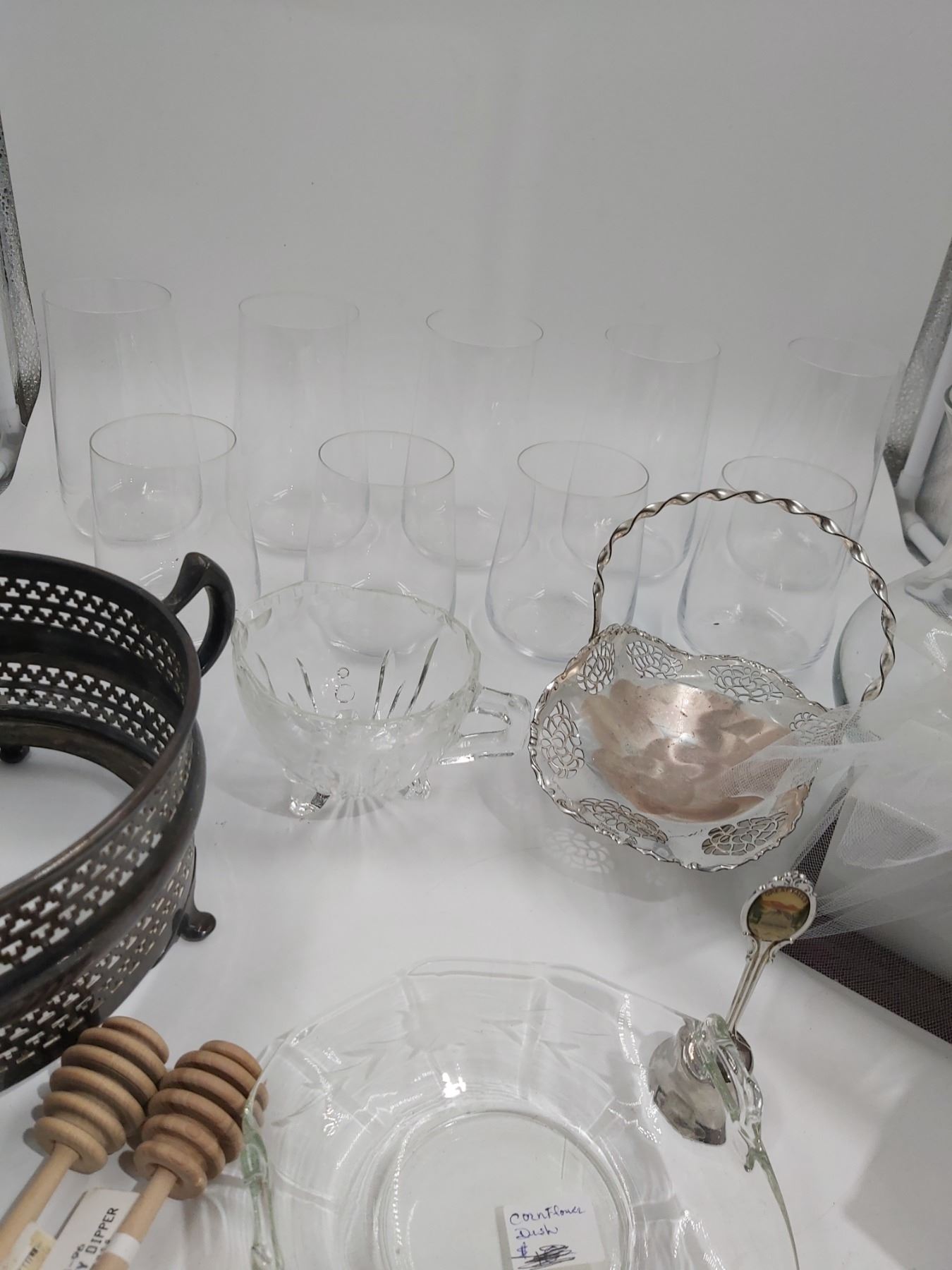 Assorted Glassware and Home Decor. Includes 5 water glasses, 4 highball glasses, Silver plated casserole dish holder, salt and pepper shakers and more
