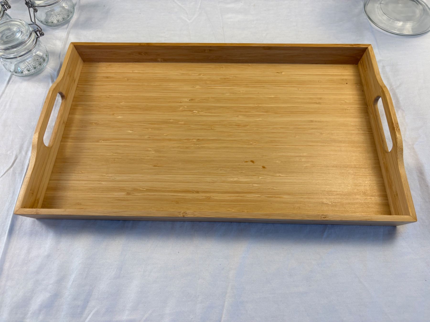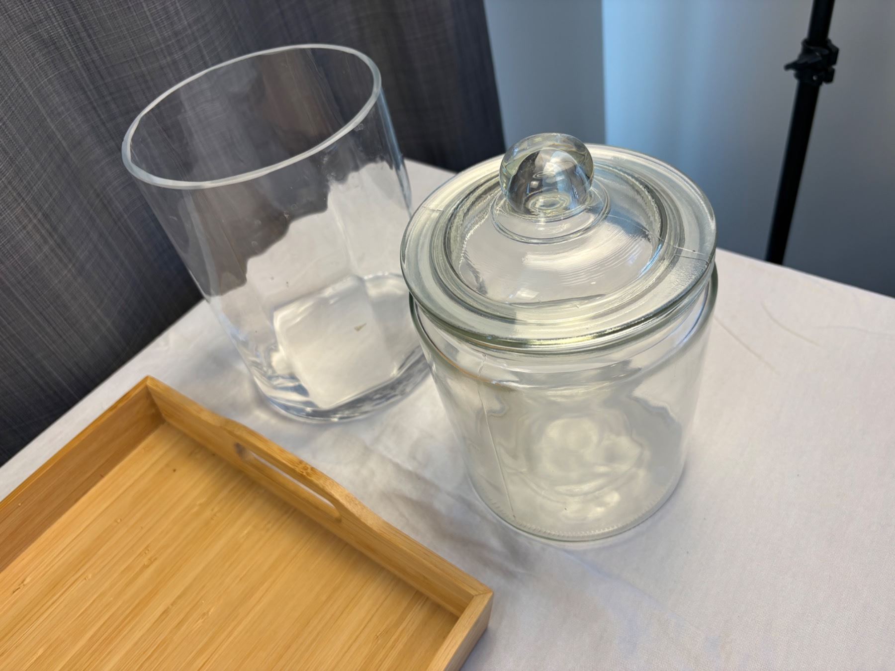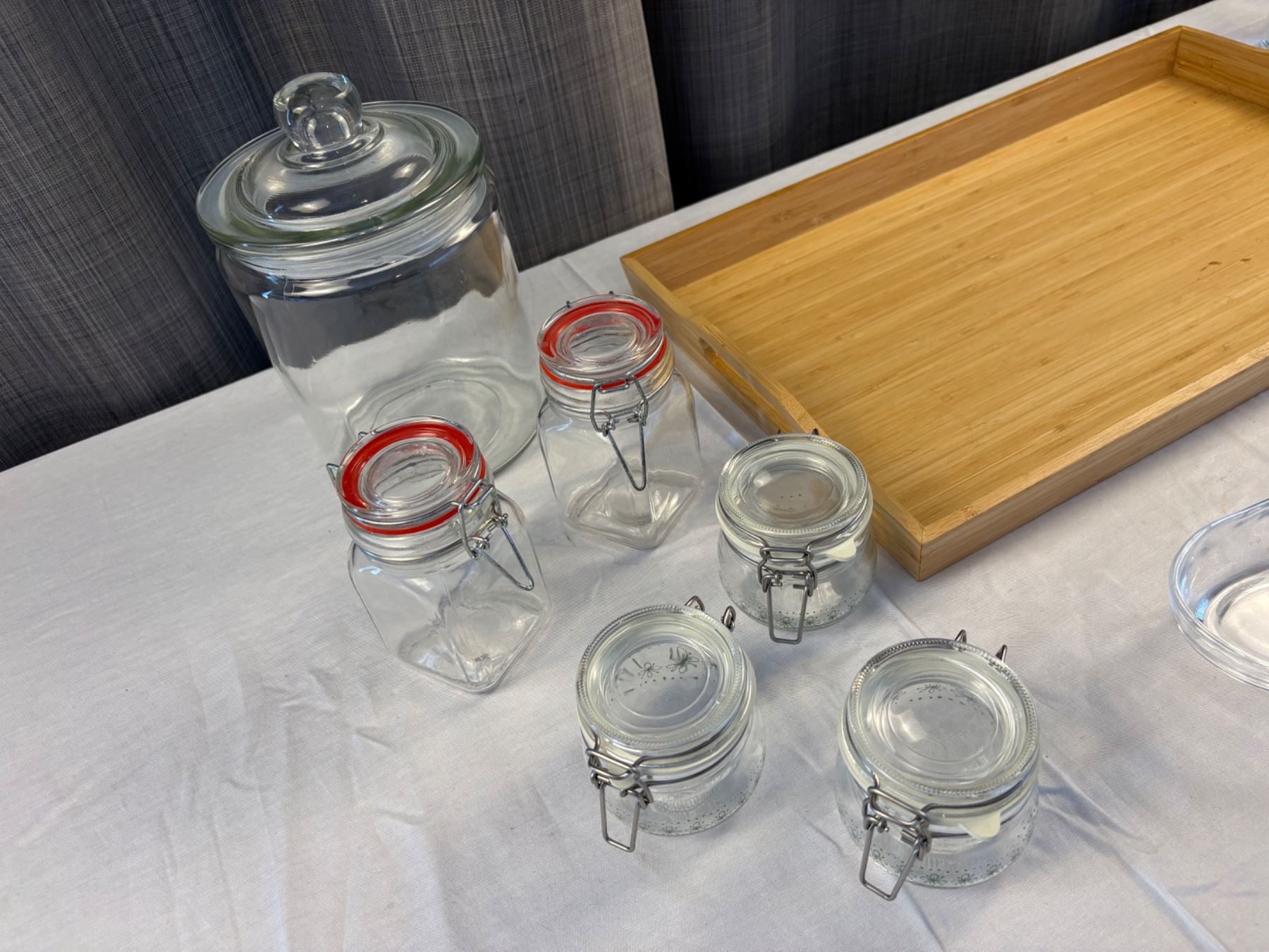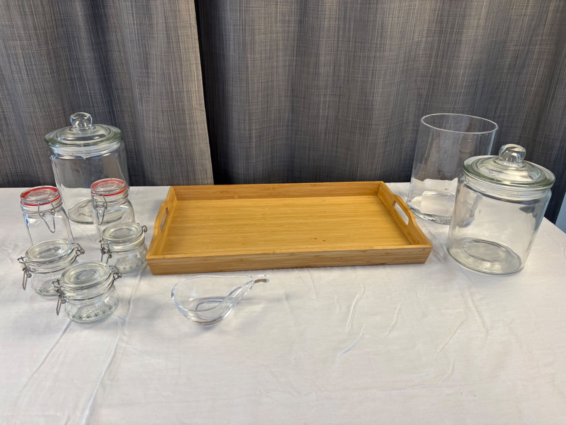 2 glass canisters with lids, assorted size mason jars, serving tray 20"X12"