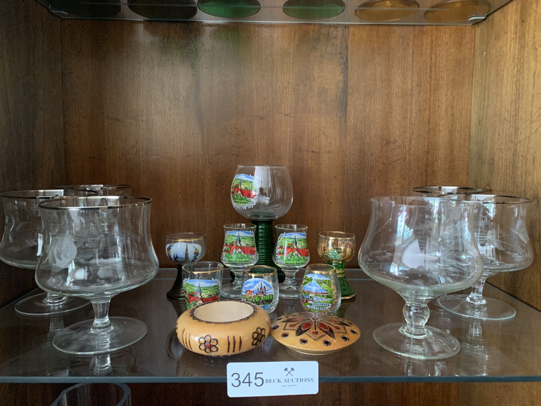 Includes 6 x stemmed glasses, 8 x decorative stemmed glasses, and a small decorative wooden bowl