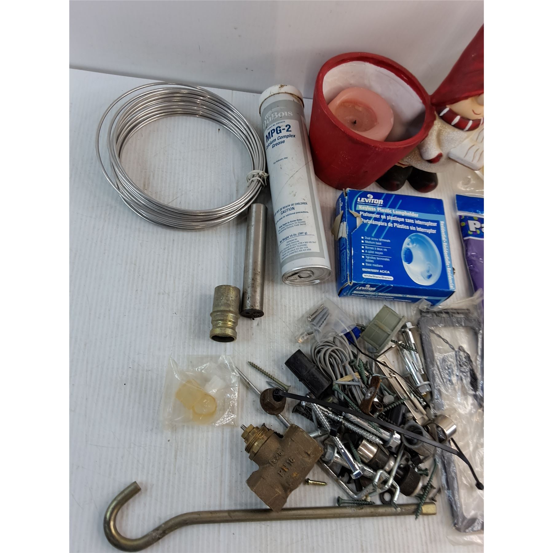 Assorted Hardware, Light Socket, Grease Tube, Candle Holder, Misc.