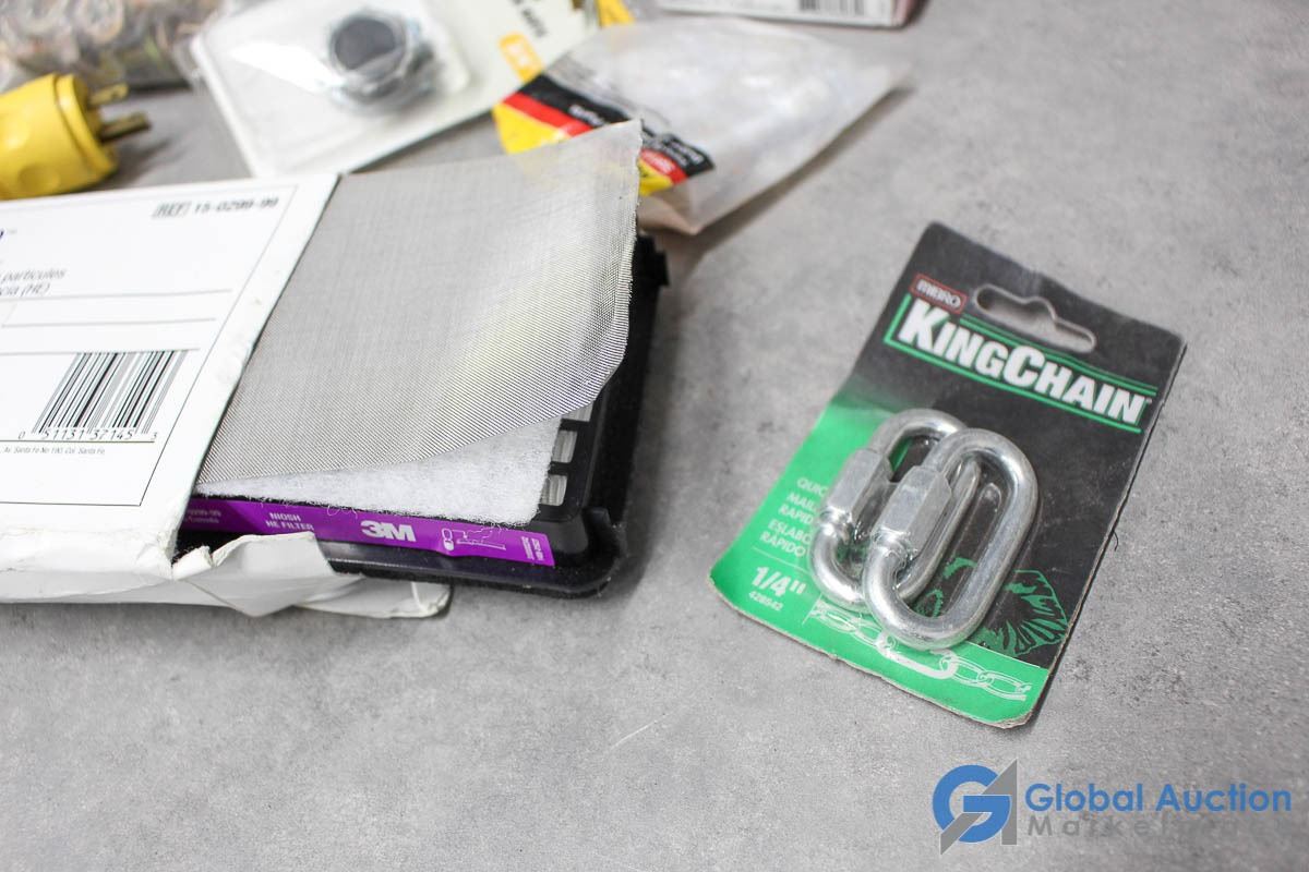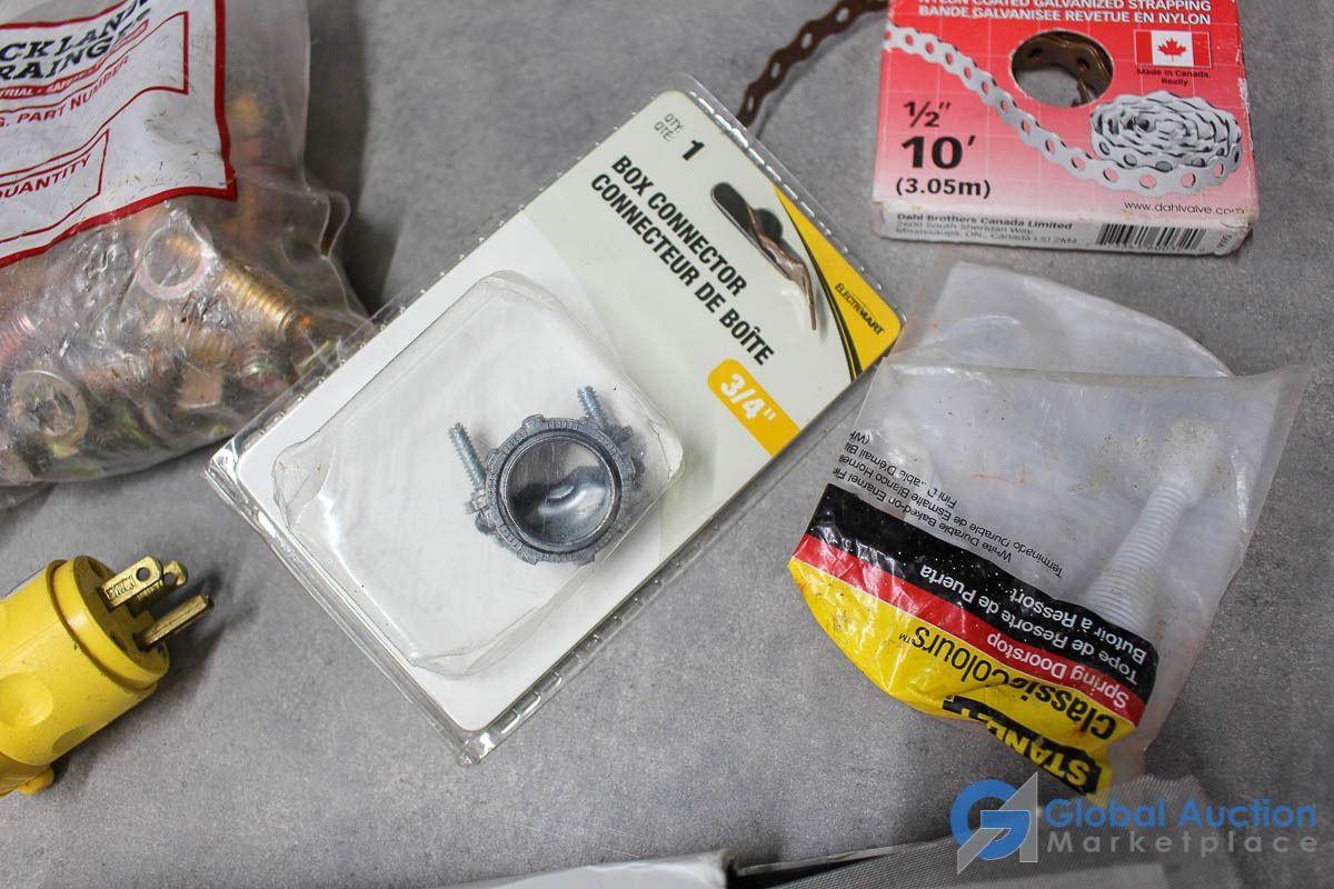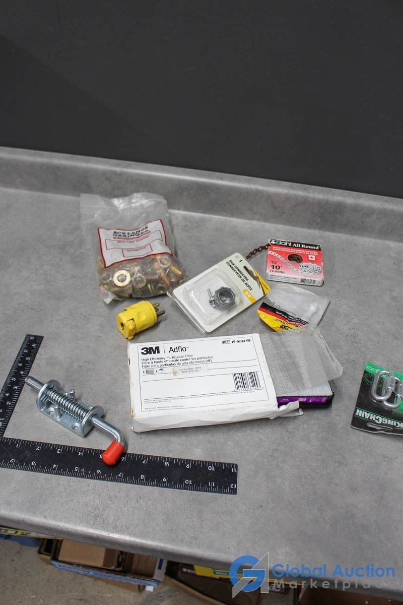 Ackland Grainger Brass Nuts, Bolts, Washers; Electrimart Box Connectors 3/4"; Nylon Coated Strapping 10' 1/2"; Mibro King Chain Quick link 1/4";Stanly Doorstop; Leviton 15A/125v 3-Prong Replacment End; 3M Adflo High Efficency Paticulat Filter; SpringLoaded Latch