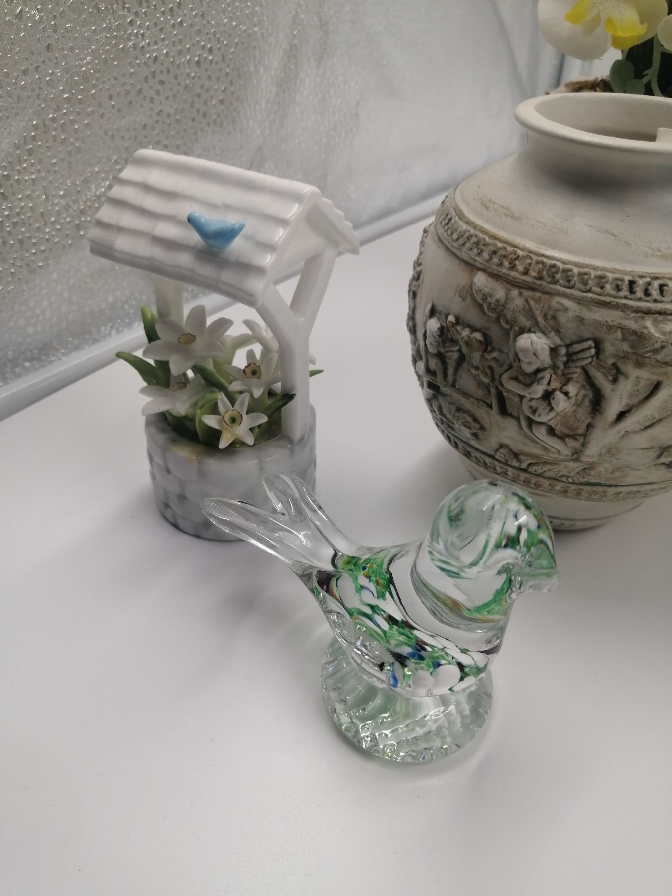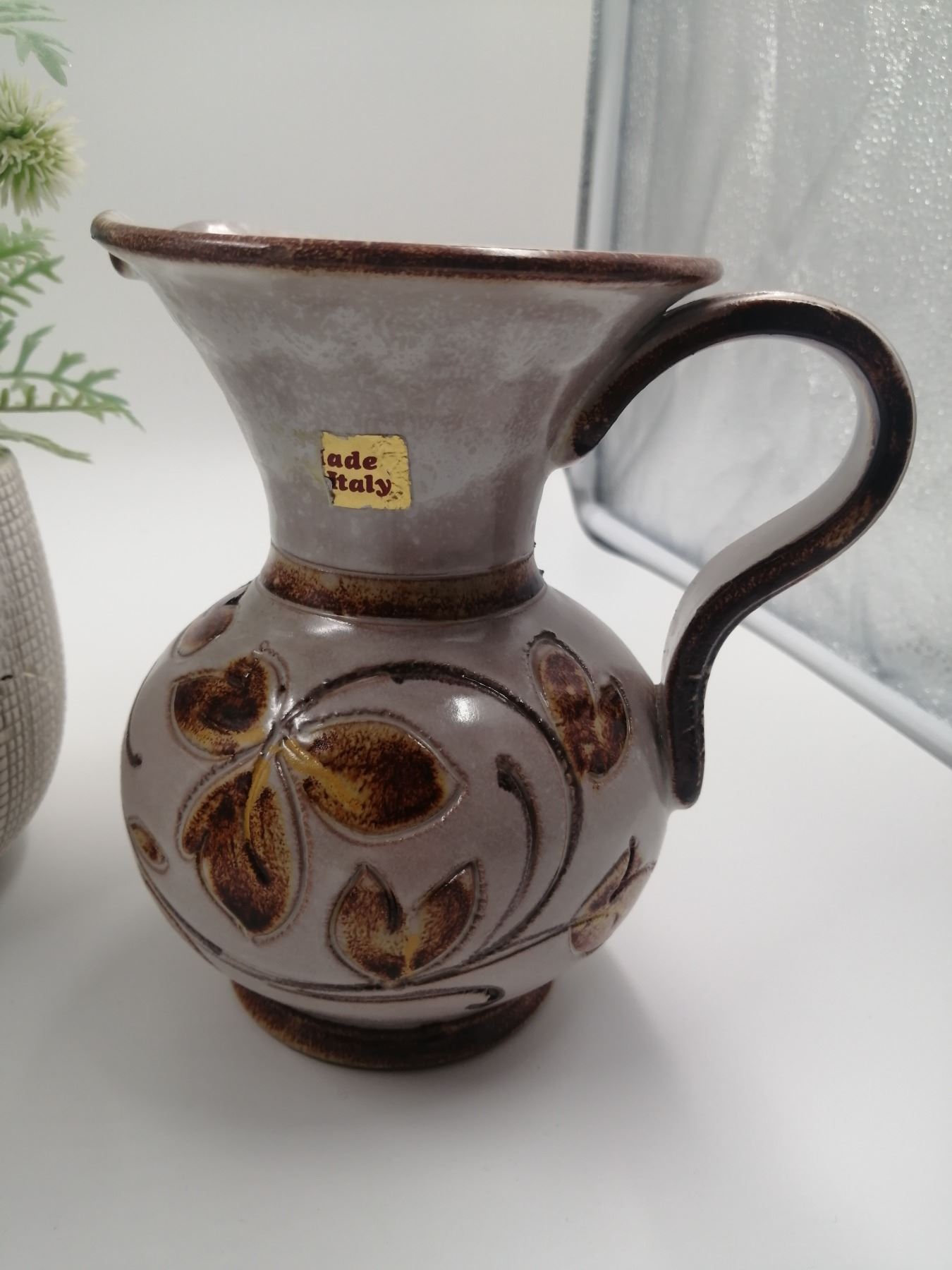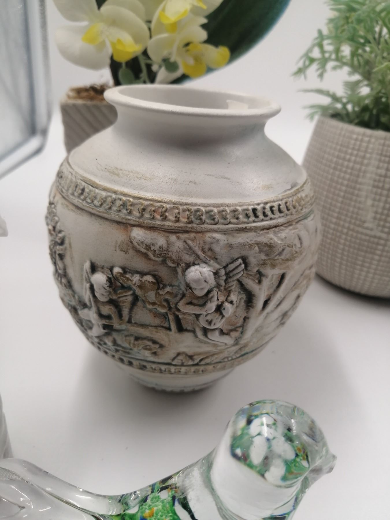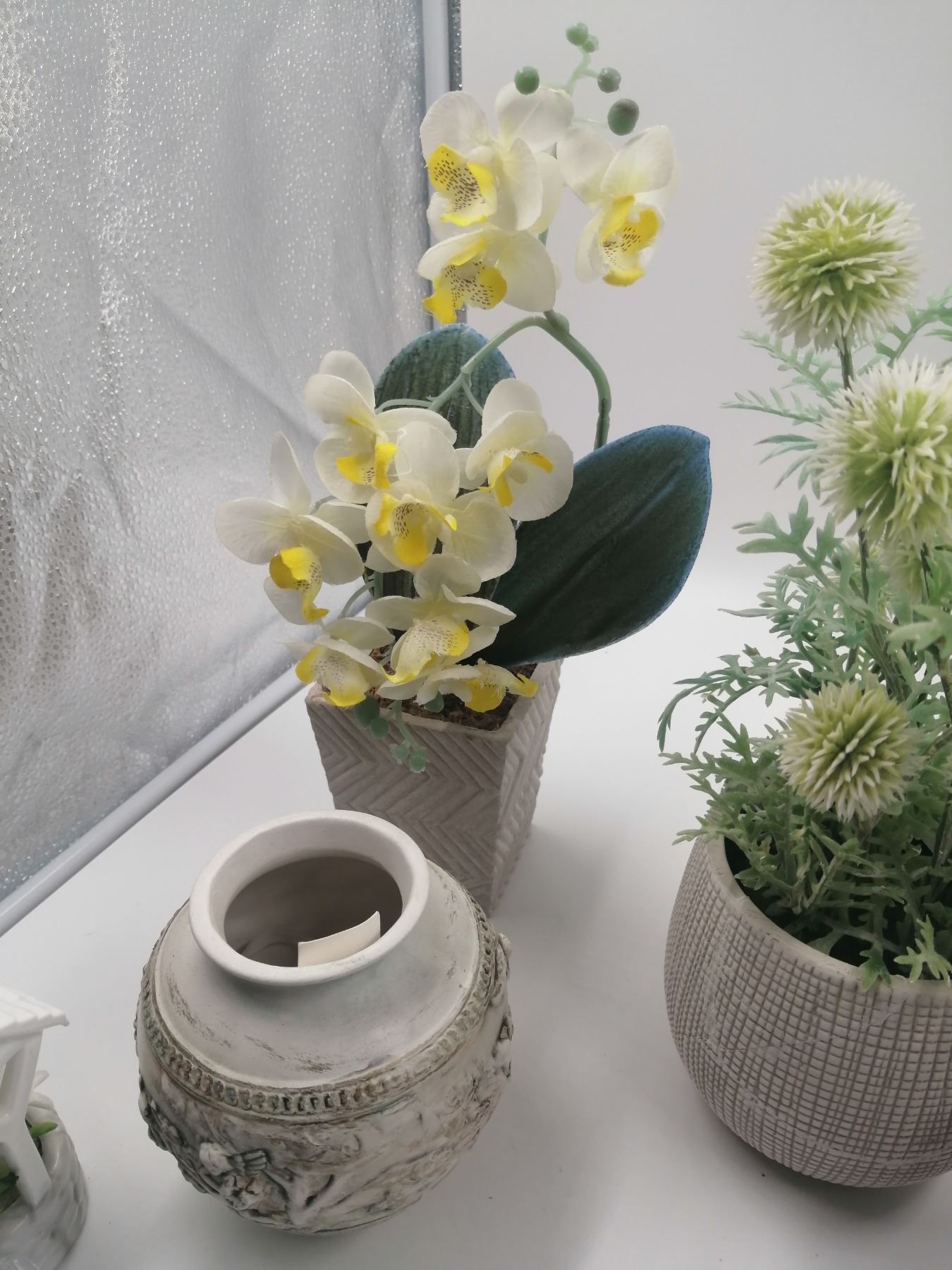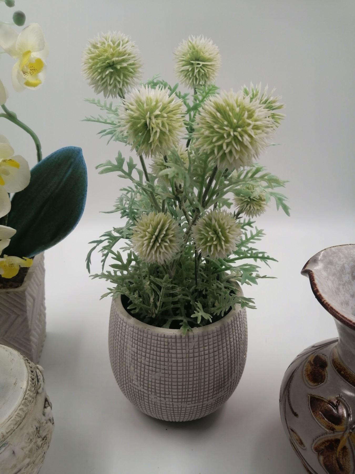 Assorted Home Decor Includes Artificial Plants Pottery and Glassware 12" Tallest