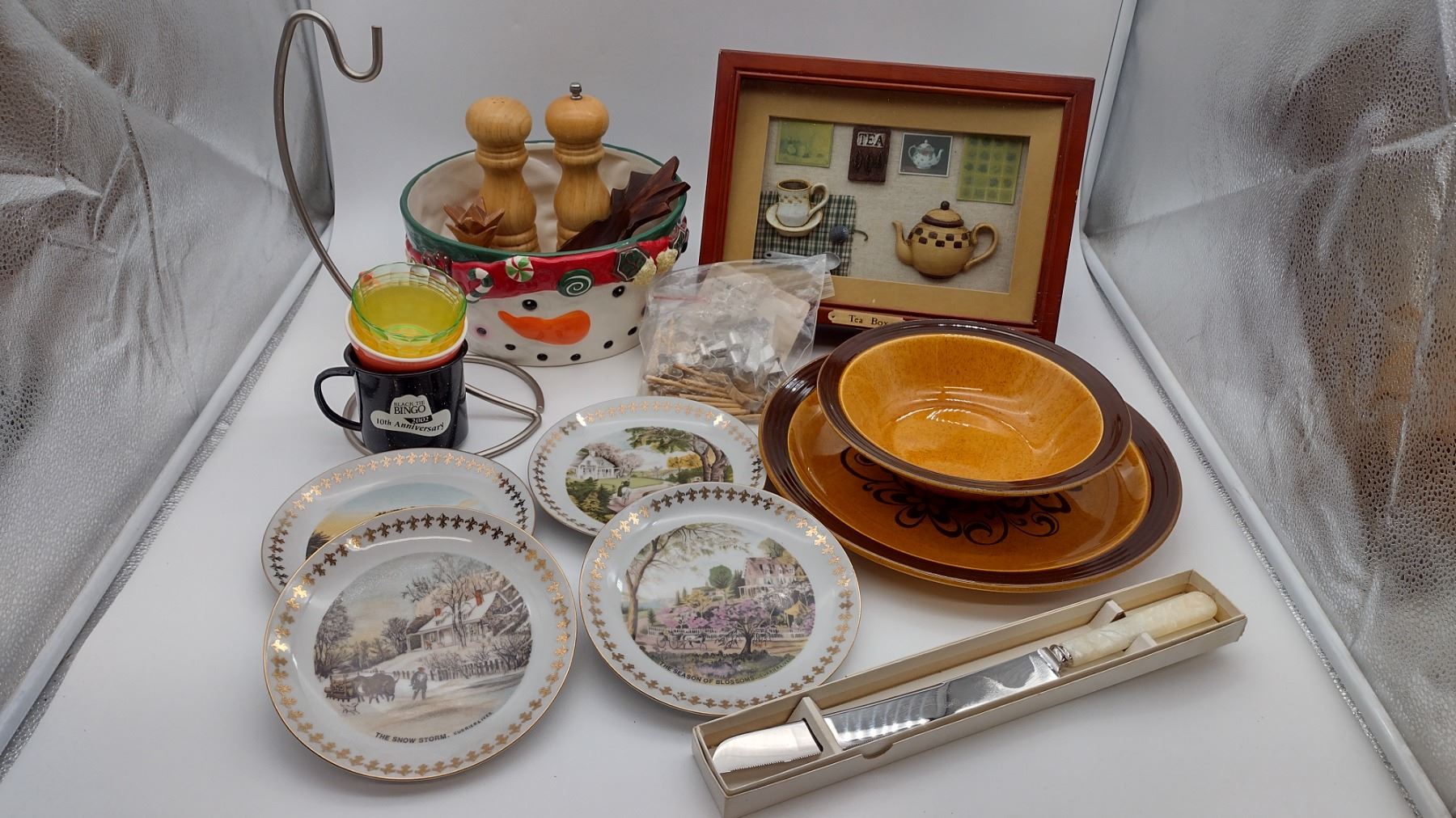 Includes 4 decoratie plates, christmas themed bowl, bridal cake knife, lollipop maker kit, tea sachet holder box,banana hook, salt and pepper grinder, wood carved pineapple peices.
