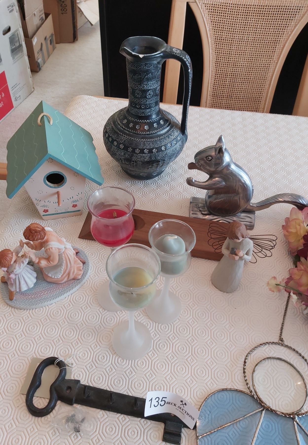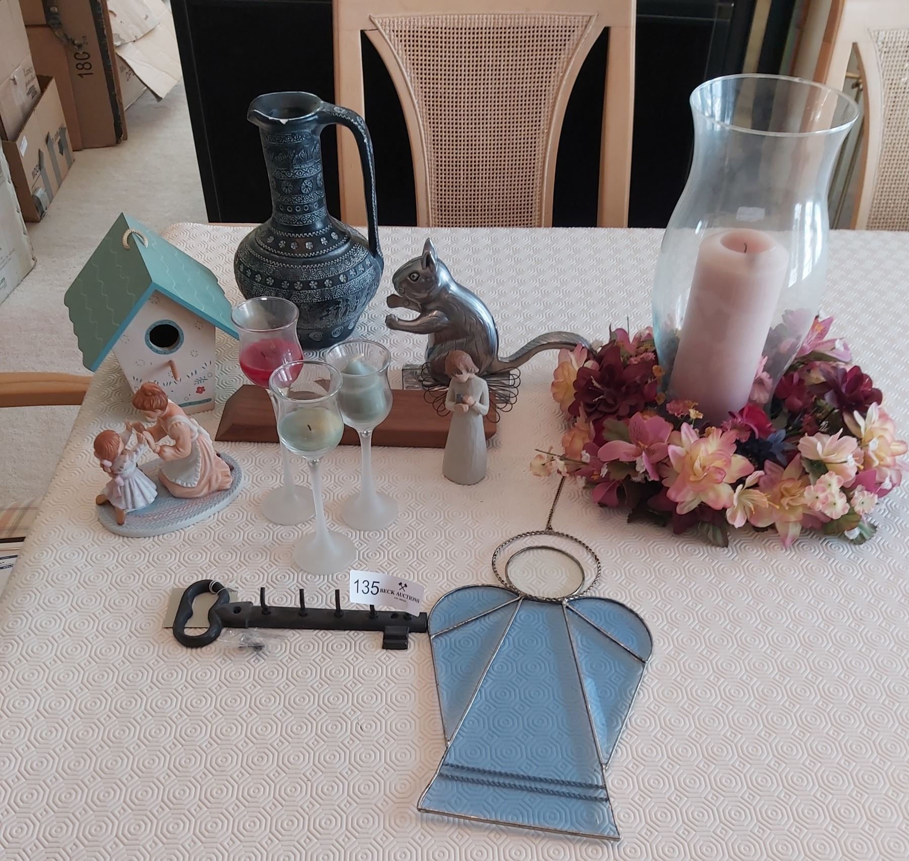 Squirrel nut cracker, bird house, Two figurines 1 treasured memories (patty cake), stain glass angel, Candles, Dark Vase has some chips, and more.