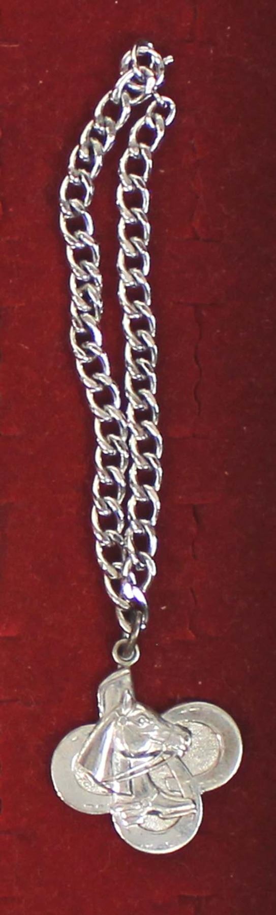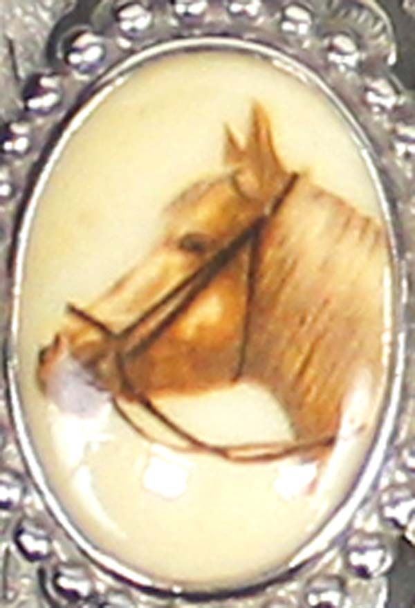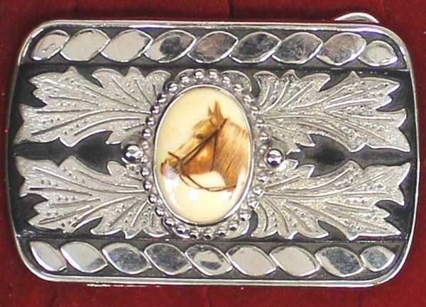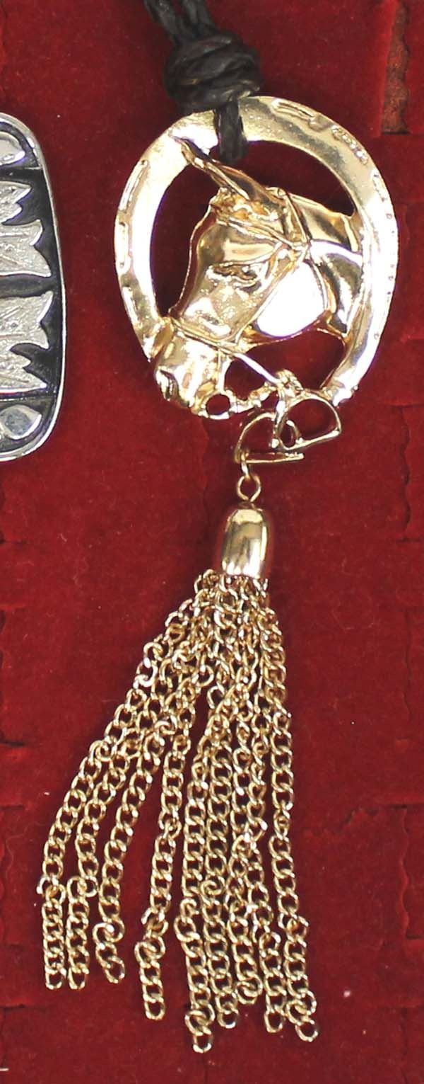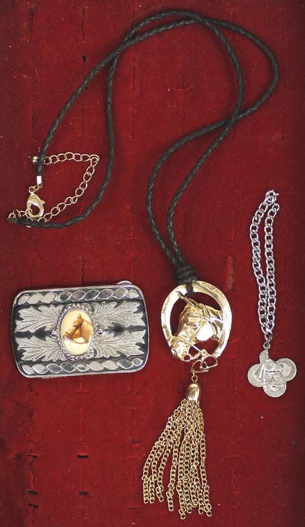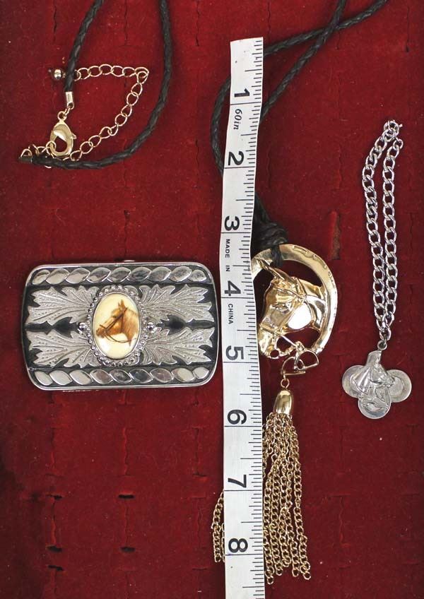 Assorted Horse Jewelry, includes 1. Silver-tone Belt Buckle 2. Gold-tone Horse Necklace 3. Silver-tone Bracelet with Sterling Silver Horse Charm, charm is marked 3G Sterling, longest is the necklace with the pendant measuring 5''L x 1.5''W, the leather cord necklace is adjustable