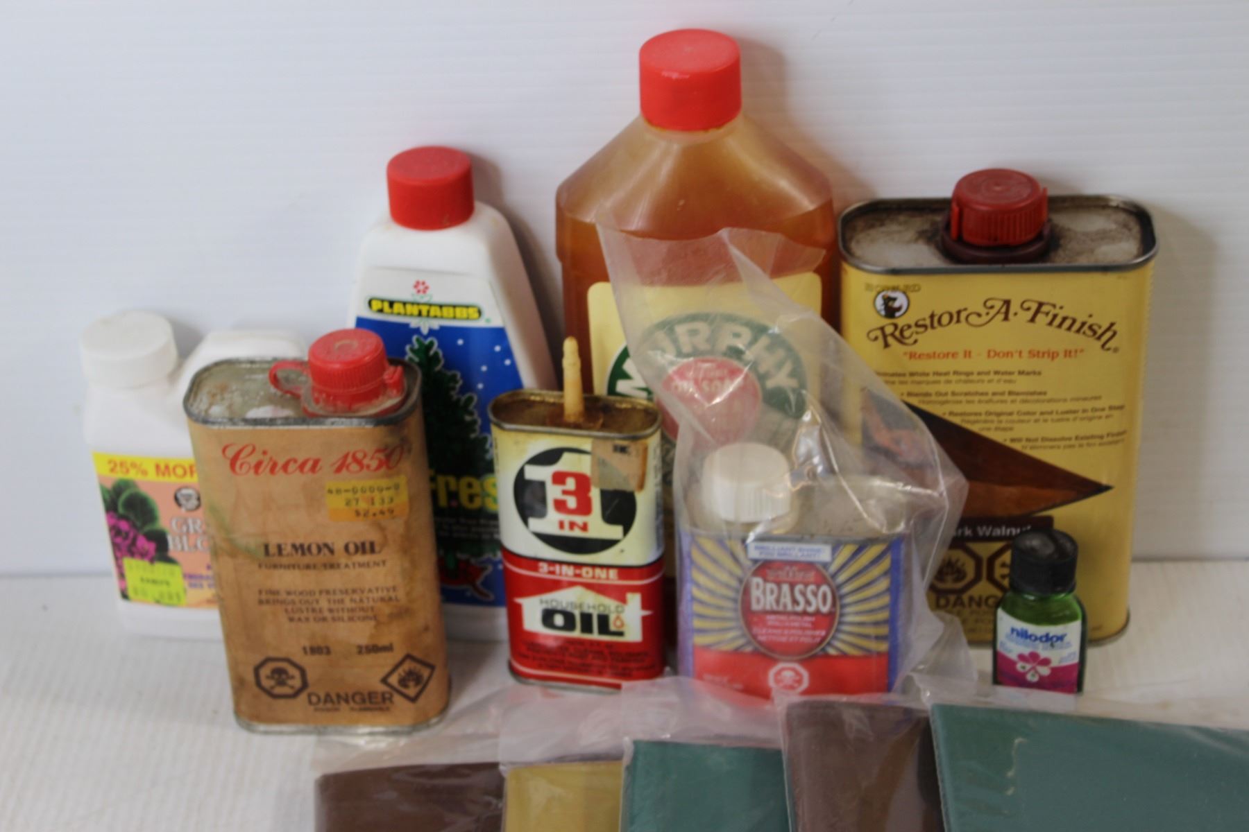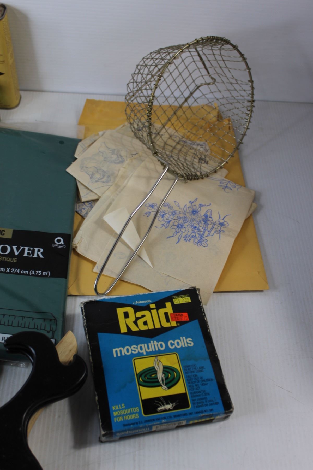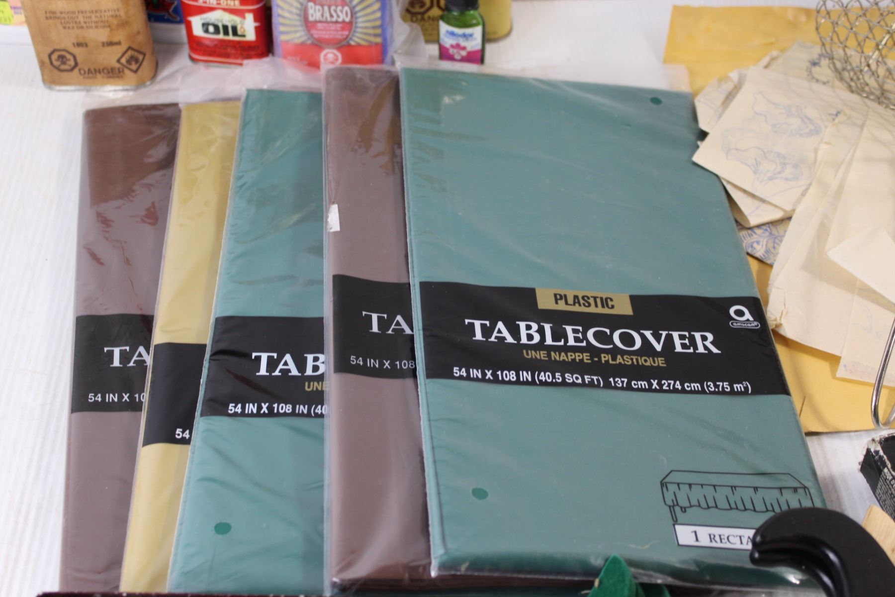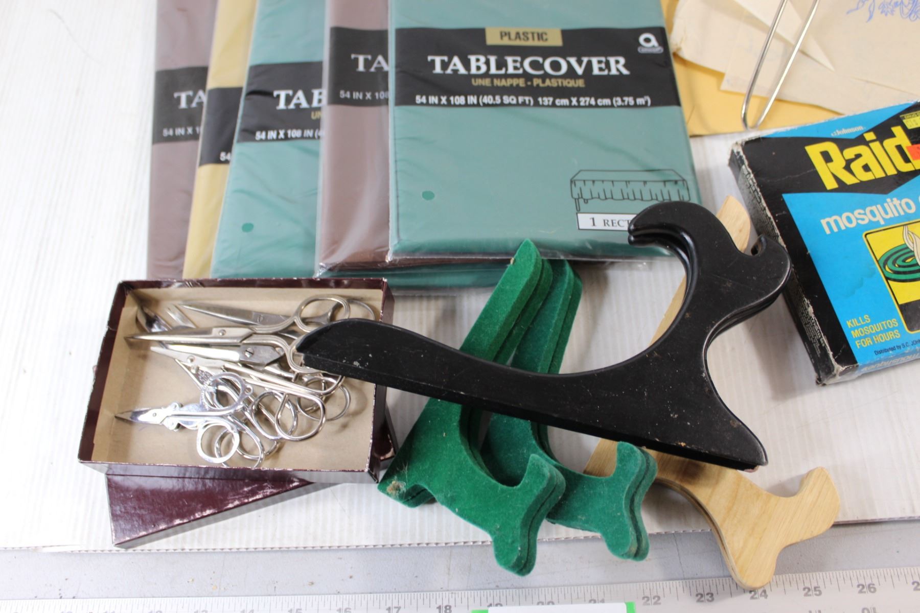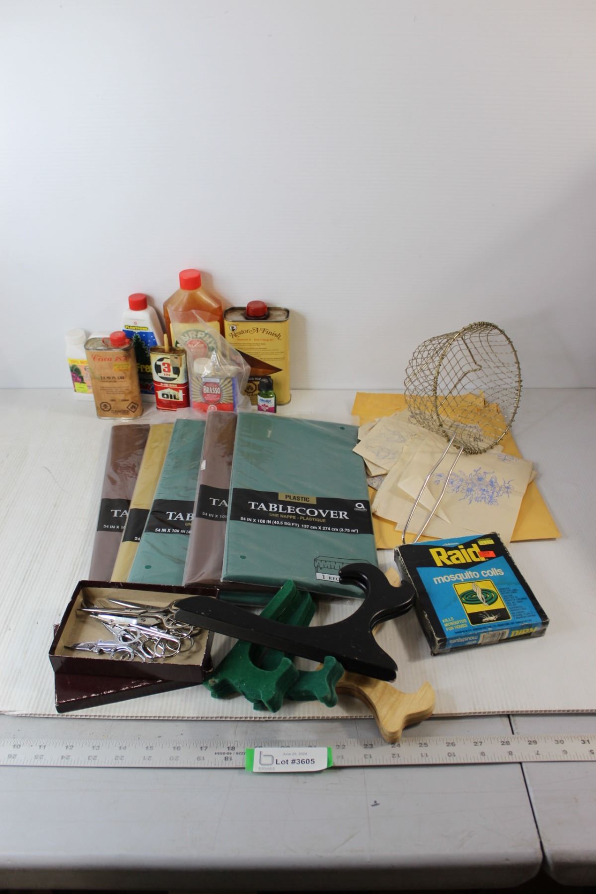 Assorted House Hold Cleaning Liquids, (5) Table Covers, Mosquito Coils, Misc.