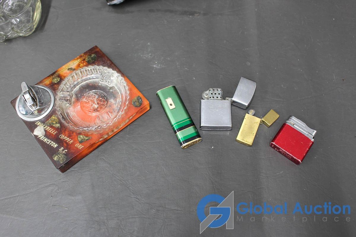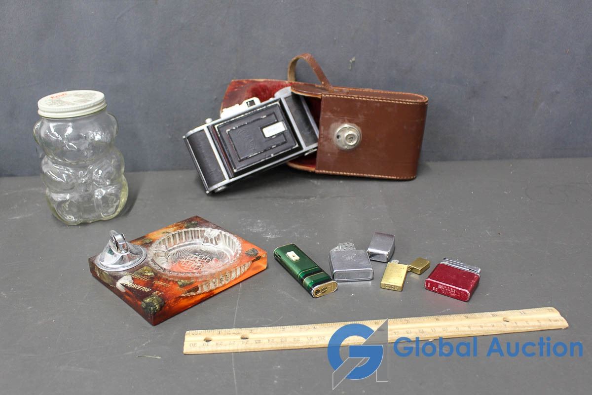 Lighters, Ashtray, Norca Camera, 1988 Kraft Peanut Butter Glass Jar, etc