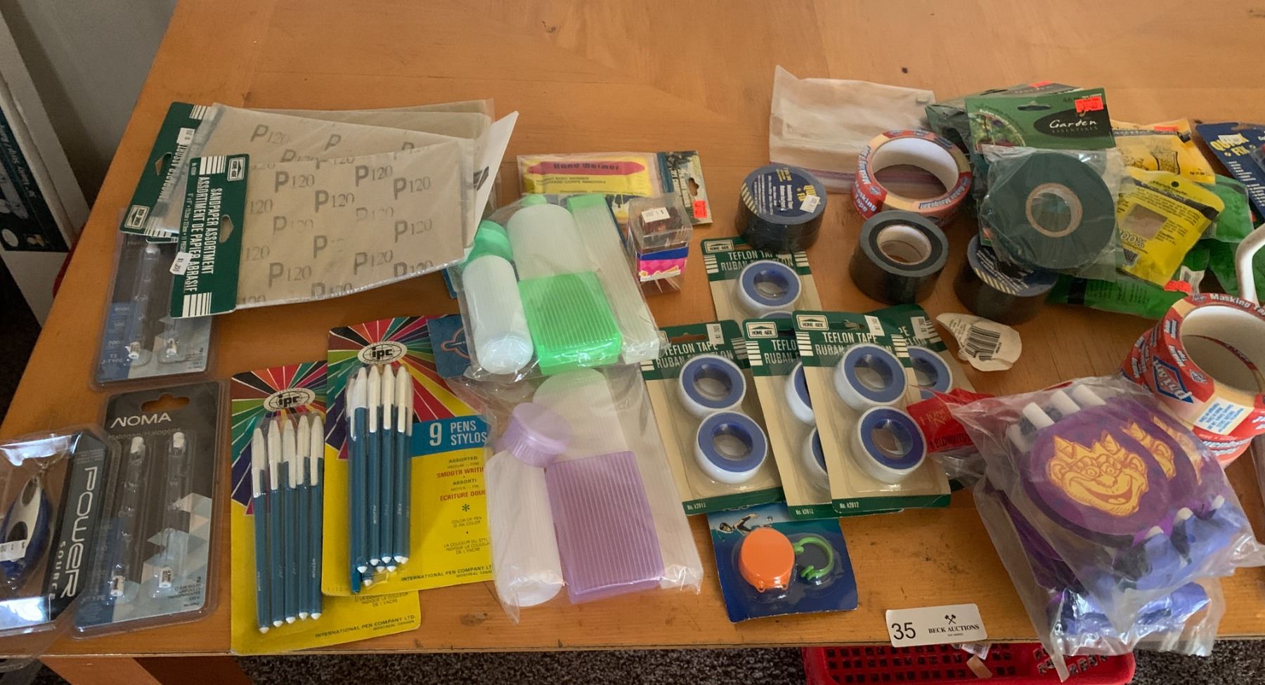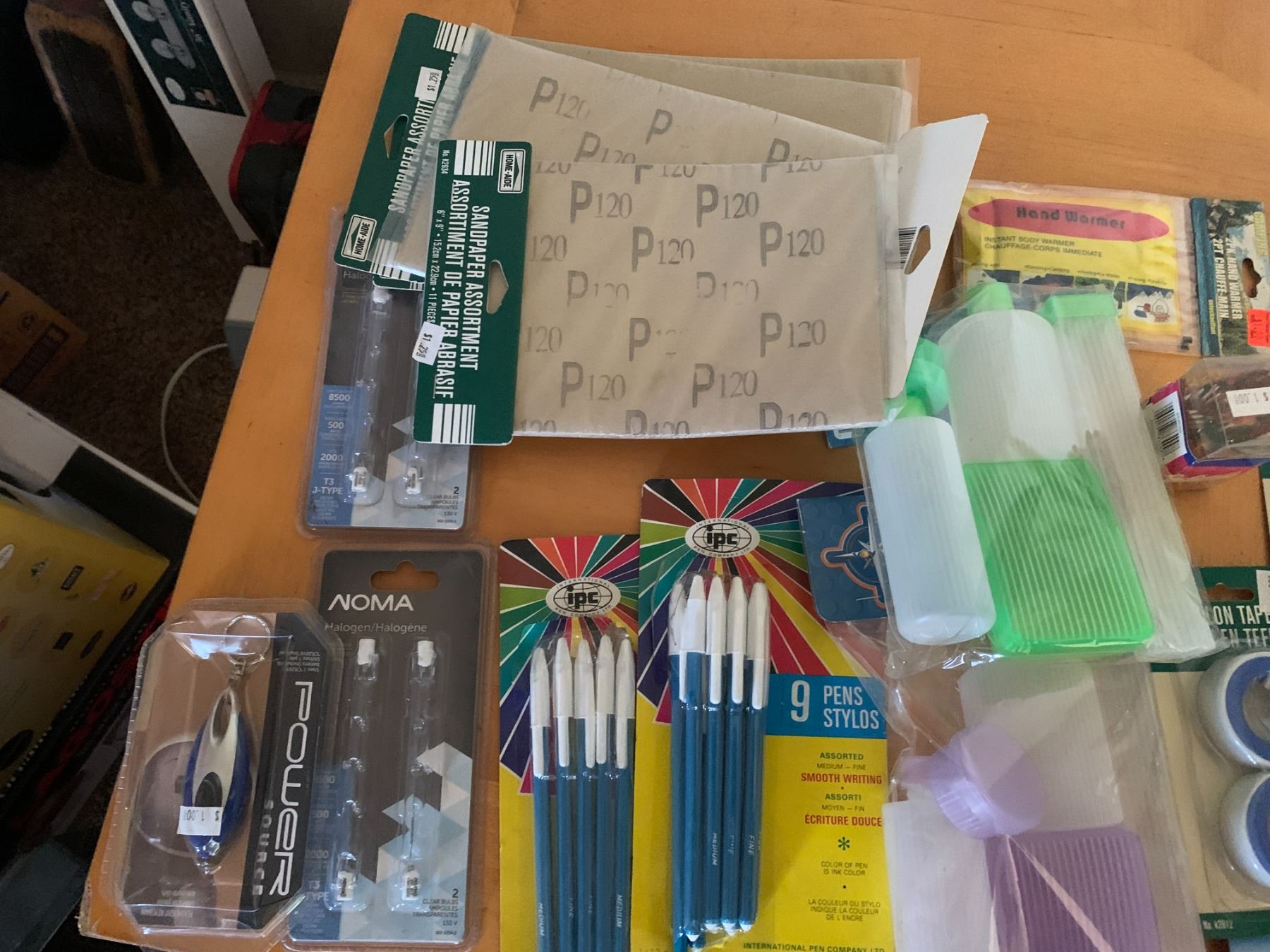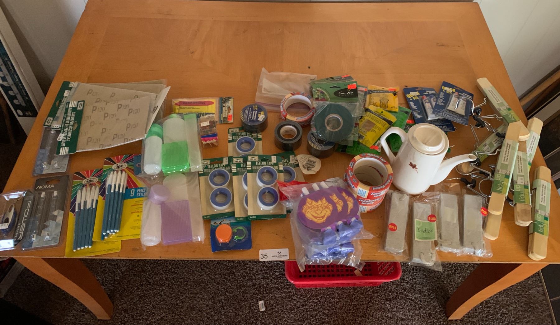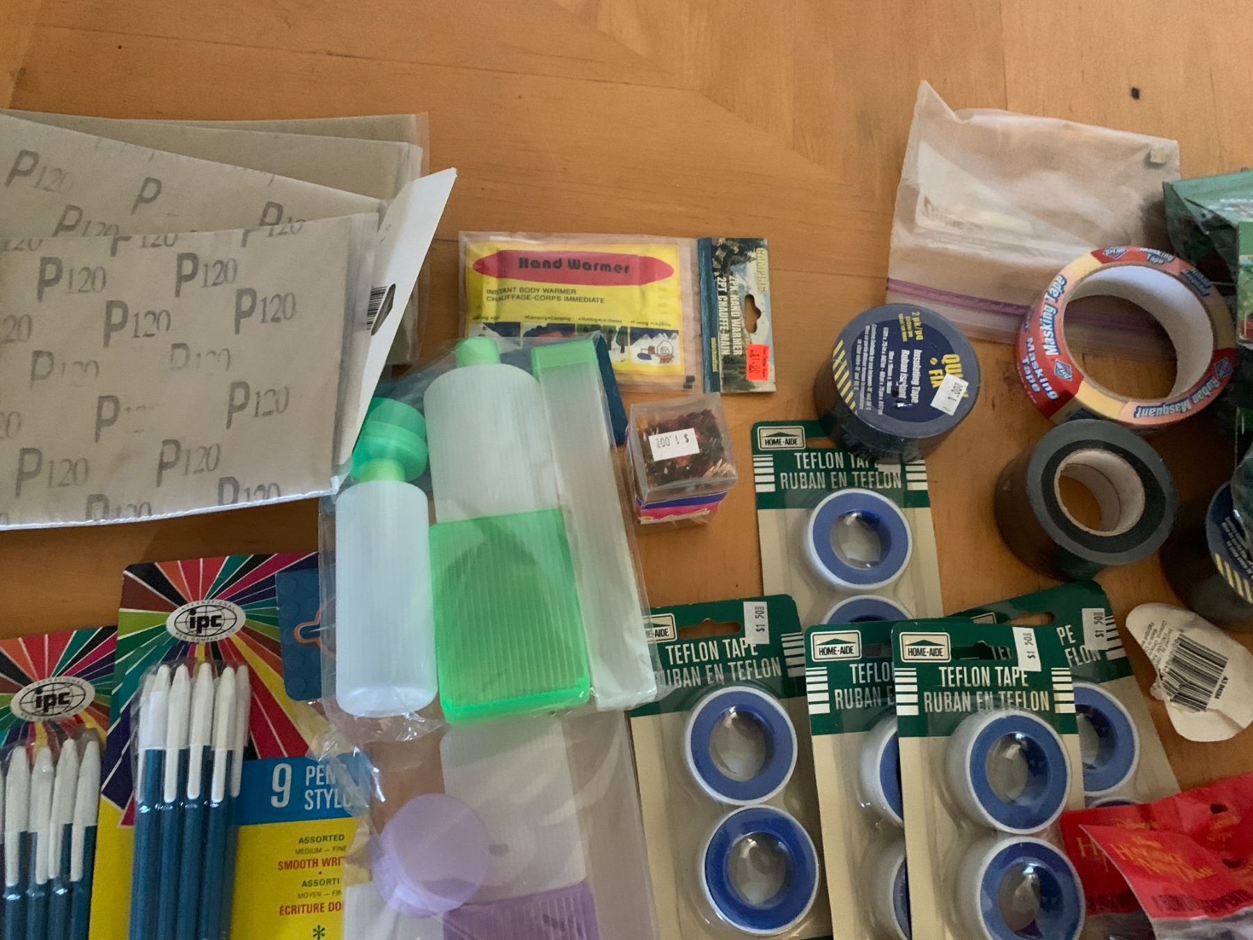 Including pens, teflon/insulating/masking tape, epoxy glue, pumice stones, clothing hangers, 120 grit sandpaper, and more!