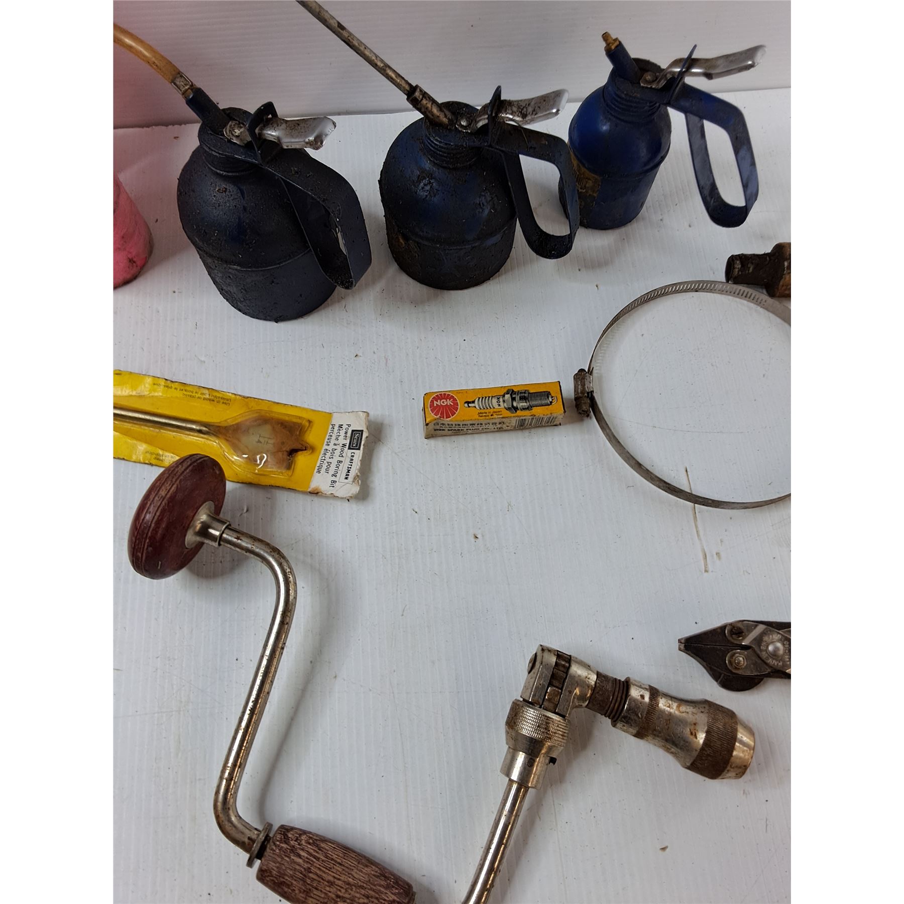 Assorted Items, Spark Plug, (3) Oil Dispenser Cans, Tube Cutter, Misc
