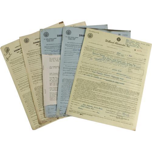 <B>Assorted Jazz Greats Agent-Signed Contracts.</B></I> Set of agent-signed contracts includes two for Cannonball Adderley, dated March 16 and May 22, 1956; and one each for Art Blakey (May 28, 1956), Horace Silver (January 14, 1957), and Charles Mingus (May 31, 1956) -- all for performances at the Blue Note. In overall Very Fine condition with some instances of wear, creasing, and/or areas of mild discoloration.<I>Accompanied by LOA from PSA/DNA.</B></I><BR><BR><b>Shipping:</b> Flat Material, Small (<a target="_blank" href="http://www.heritageauctions.com/common/shipping.php">view shipping information</a>)