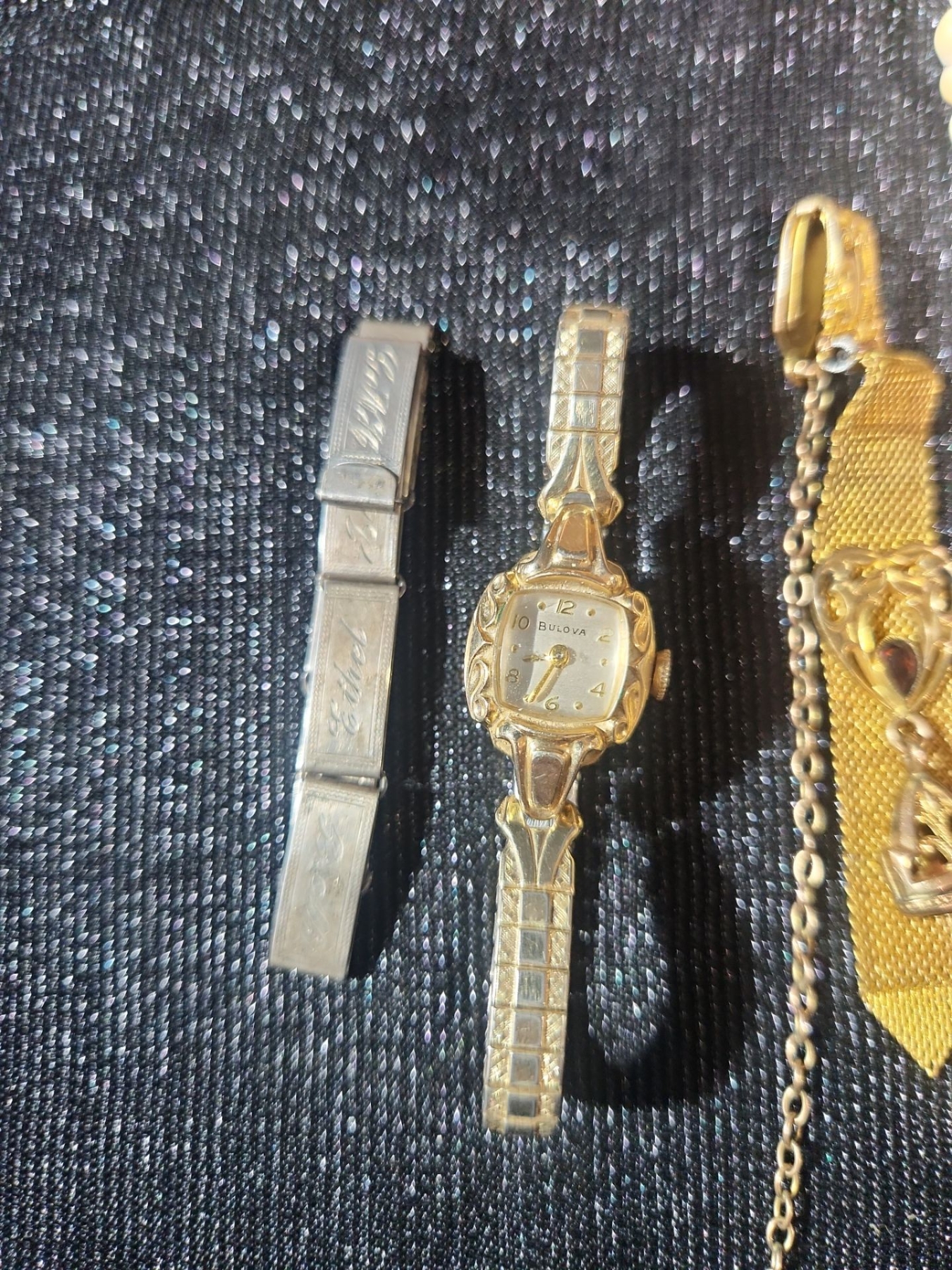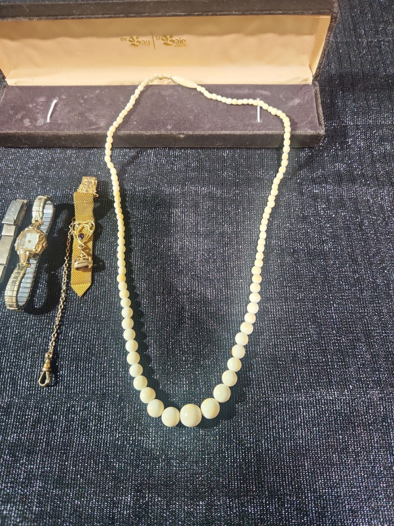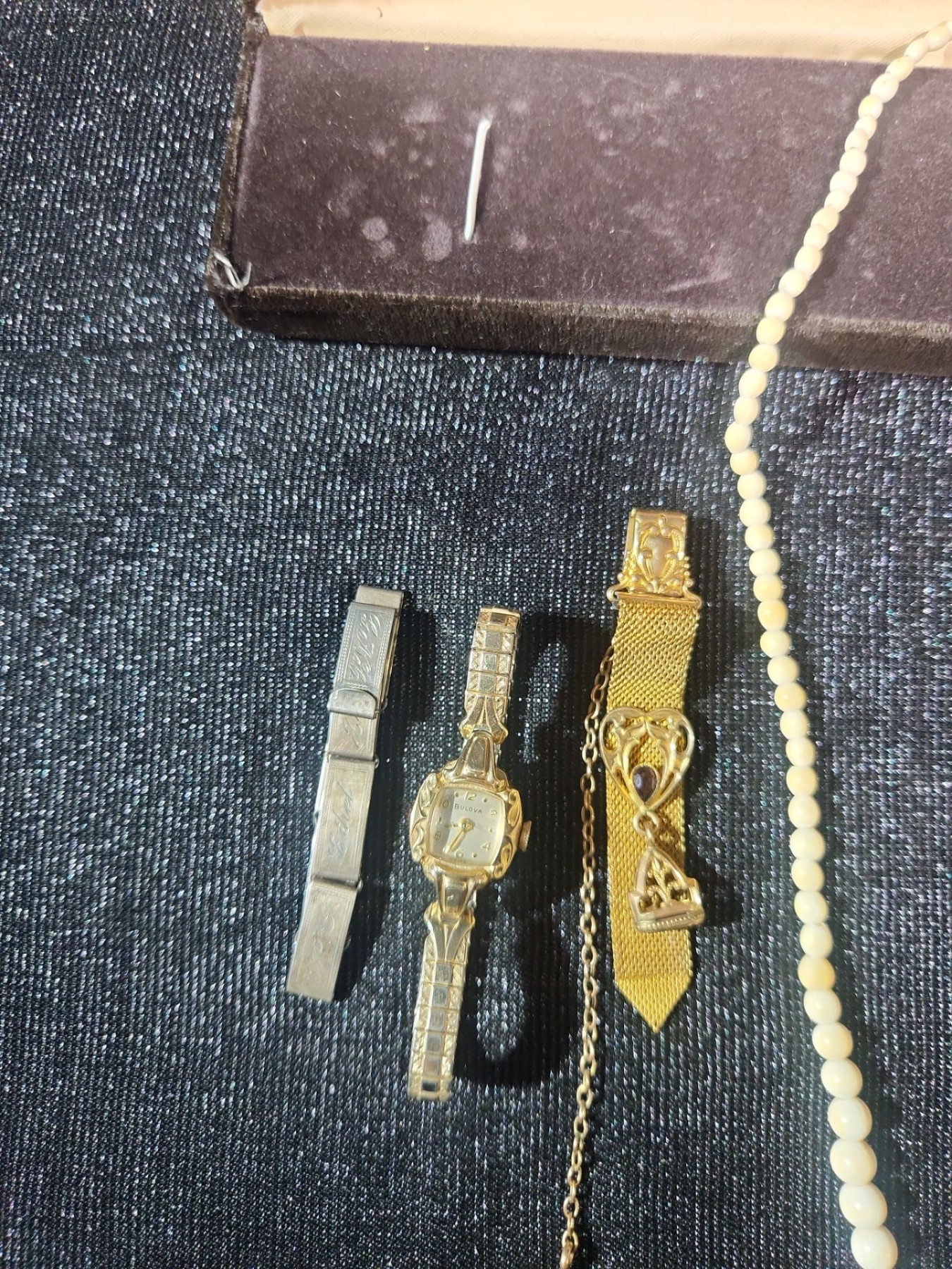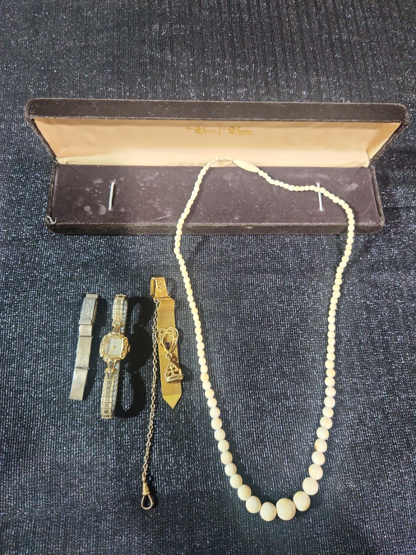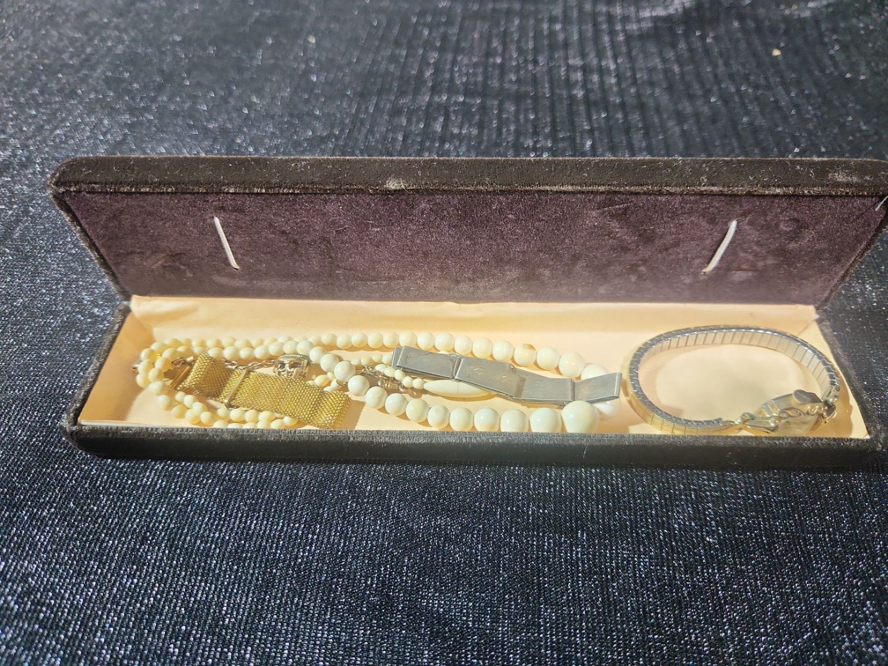 This case is filled with various pieces, included an Edwardian Art Deco style pocket watch fob, vintage Bulova watch, small silver toned bracelet and costume jewellery necklace