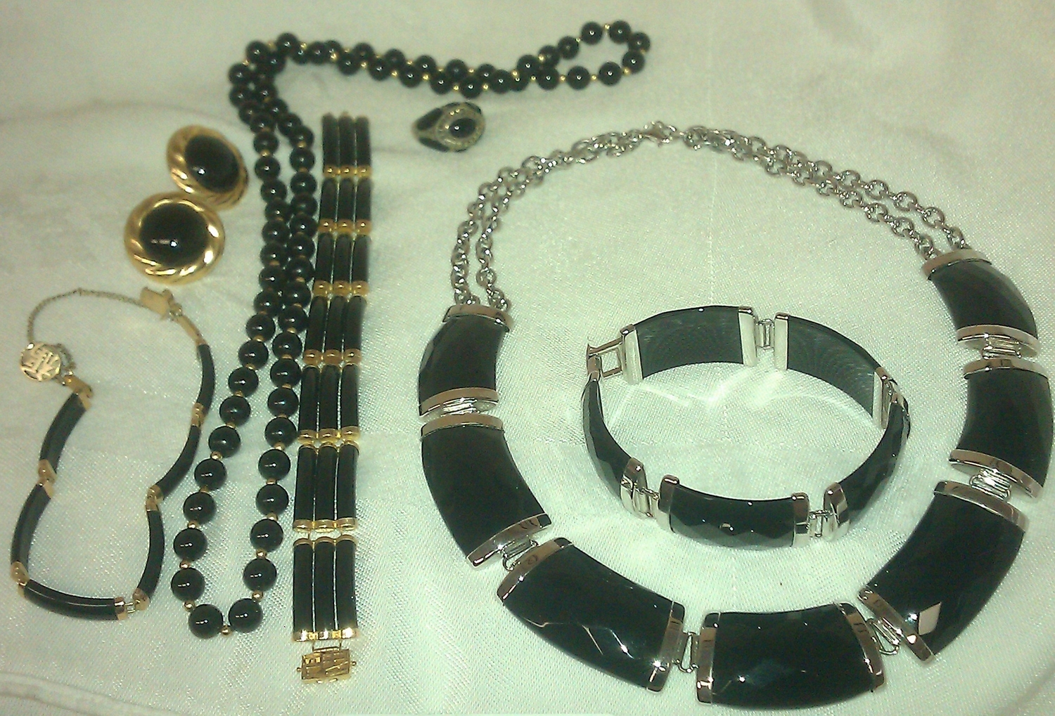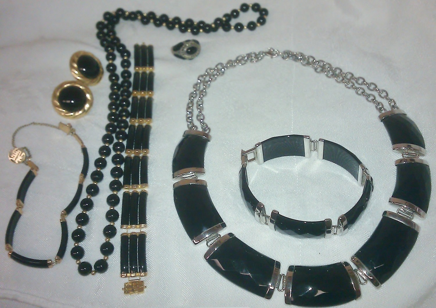 A sterling silver 7 faceted onyx link matching necklace & bracelet weighing 174.9 grams. A sterling Silver ring set w/ onyx & marcasites weighing 7.3 grams. An onyx bead eternity necklacew/ gold tone spacer beads. (2) Assorted 14K yellow gold 7 onyx bracelets. A pair pf 14K yellow gold earrings set w/ 2 round onyx cabochons. the 14K gold bracelets & earrings weigh 55.6 Grams