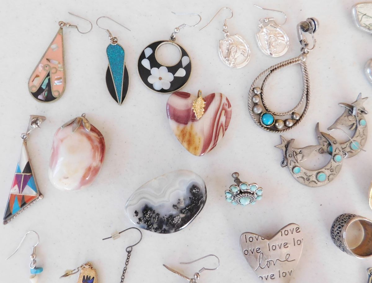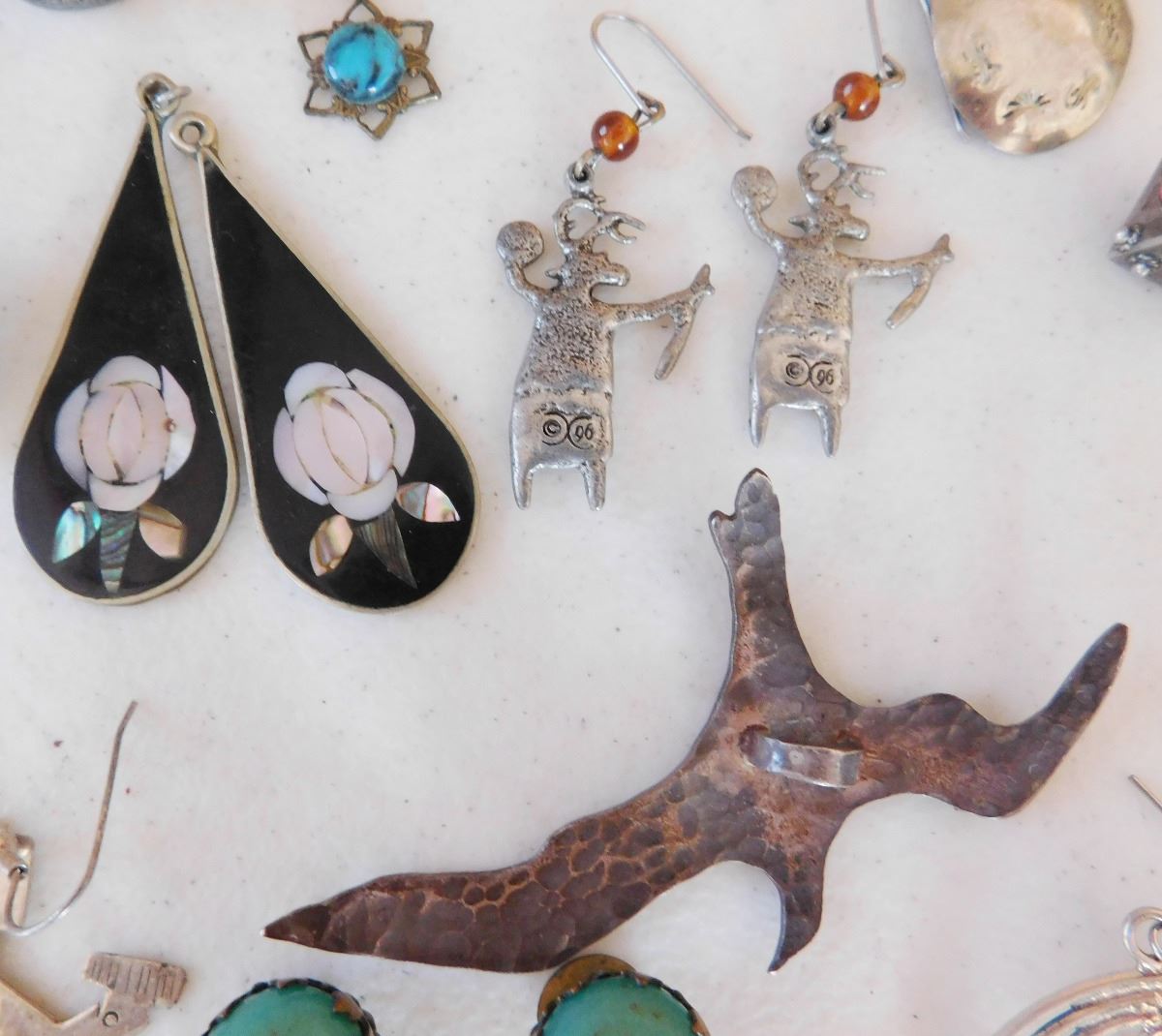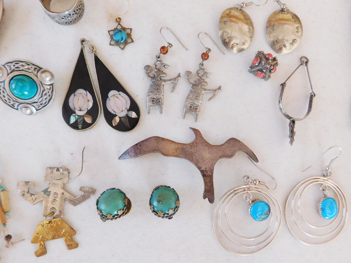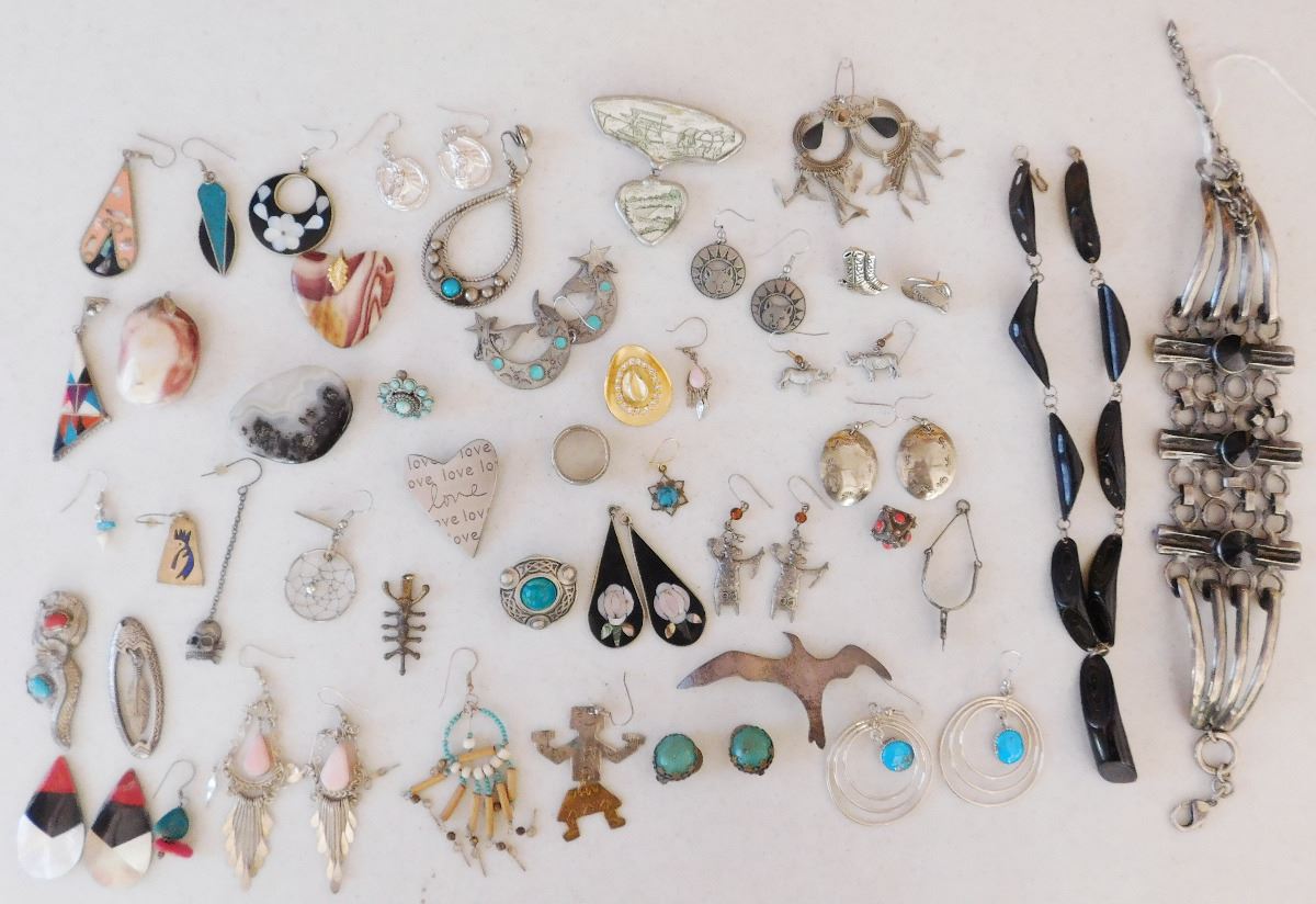Assorted Jewelry Lot, 20th century items. Made of metal, sterling silver, turquoise, mother of pearl, coral, etc. Items vary in size and origin, many being Native American or Mexican. Lot includes earring pairs and singles, various pins and pendants. Note the metal, modernist choker or necklace. Single Zuni earring in image 4 has been paired with its mate. Condition: Pre-owned, see images. Shipping: $18.50 w/insurance and signature.