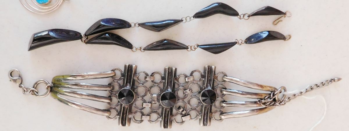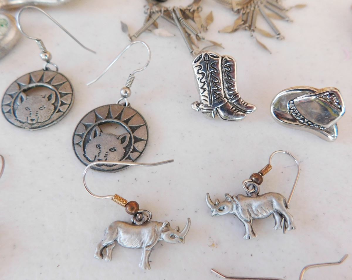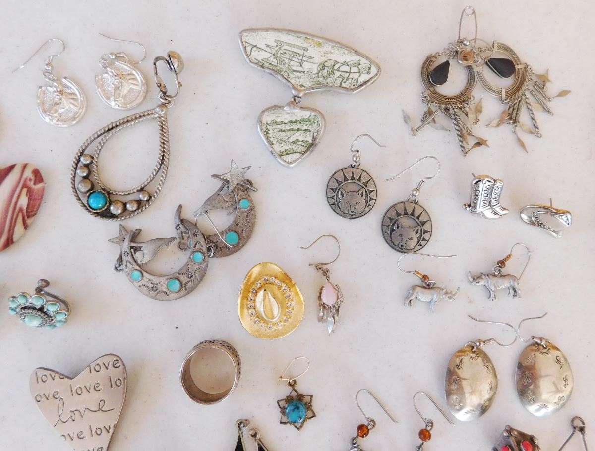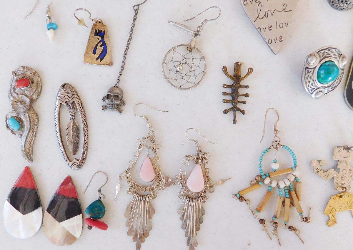 Assorted Jewelry Lot, 20th century items. Made of metal, sterling silver, turquoise, mother of pearl, coral, etc. Items vary in size and origin, many being Native American or Mexican. Lot includes earring pairs and singles, various pins and pendants. Note the metal, modernist choker or necklace. Single Zuni earring in image 4 has been paired with its mate. Condition: Pre-owned, see images. Shipping: $18.50 w/insurance and signature.