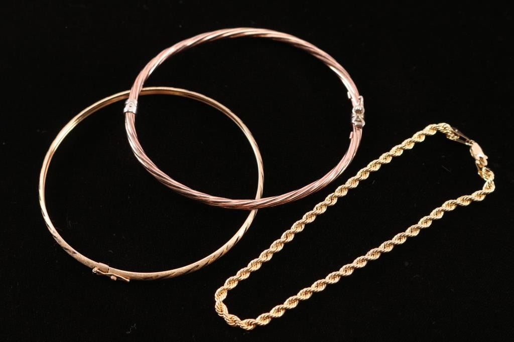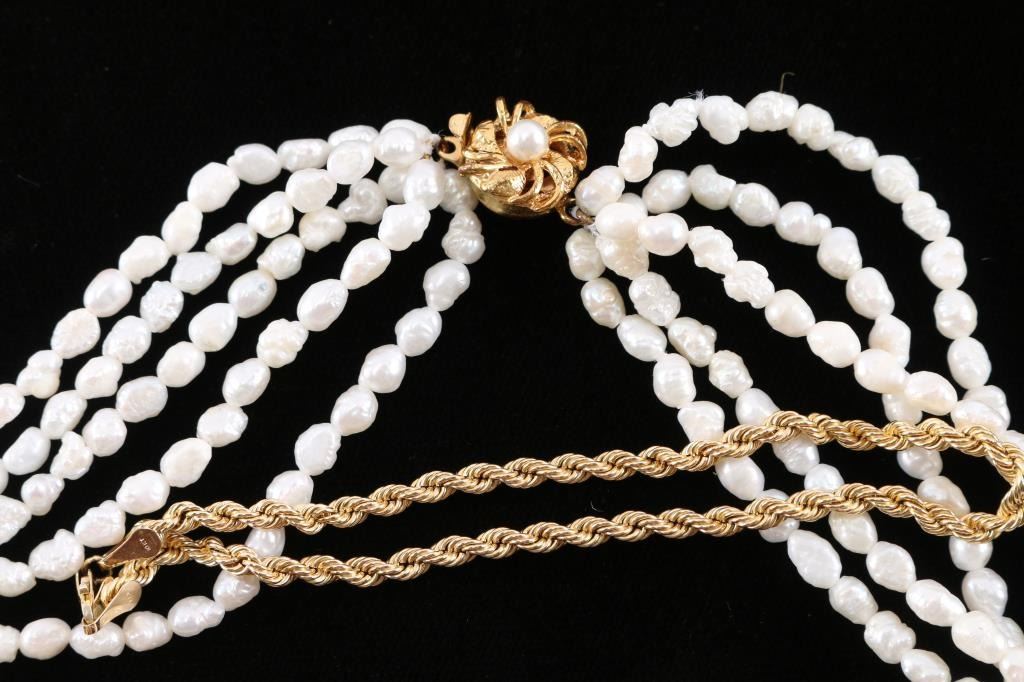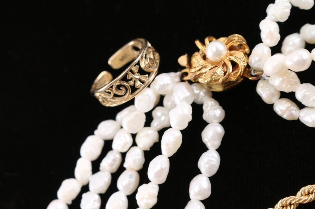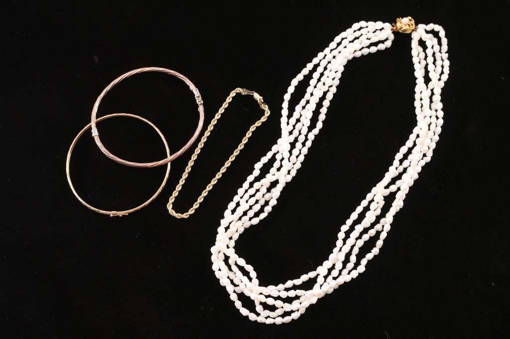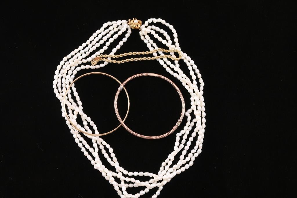 One 10k gold bangle, one 10k rose gold bangle, one 10 gold rope bracelet, one 14k gold toe ring, one 5-strand fresh water pearl necklace with gold tone clasp.