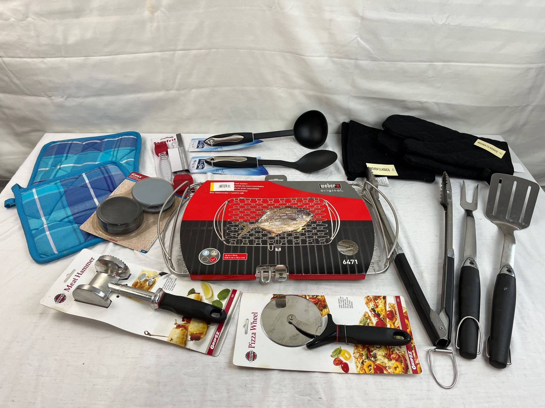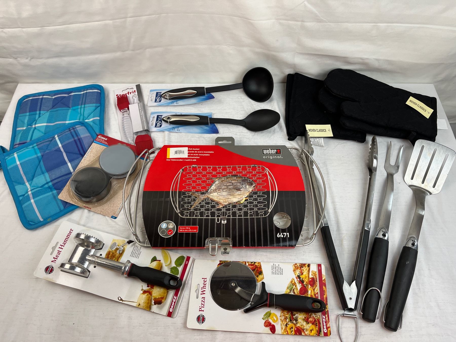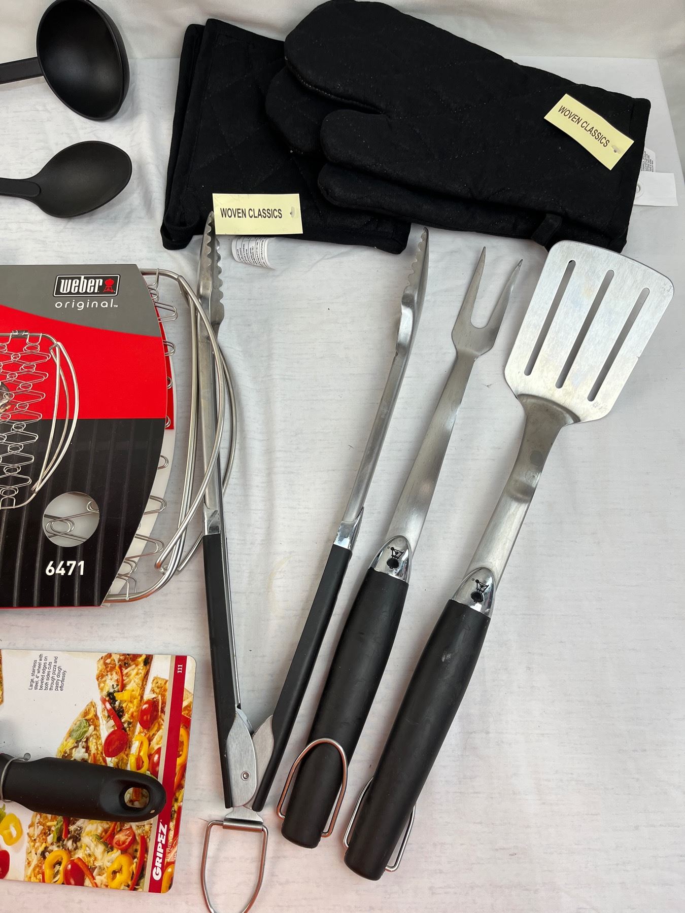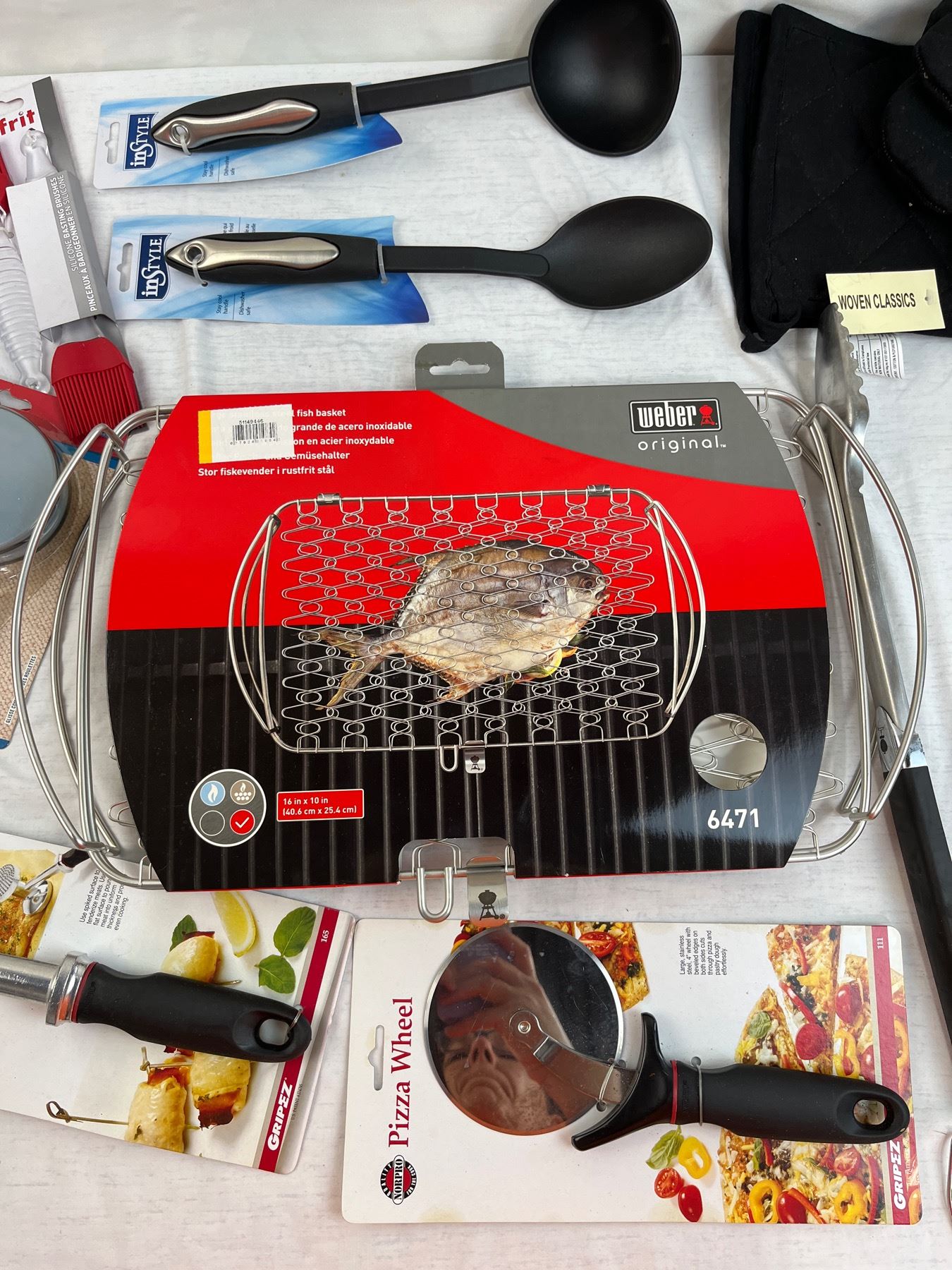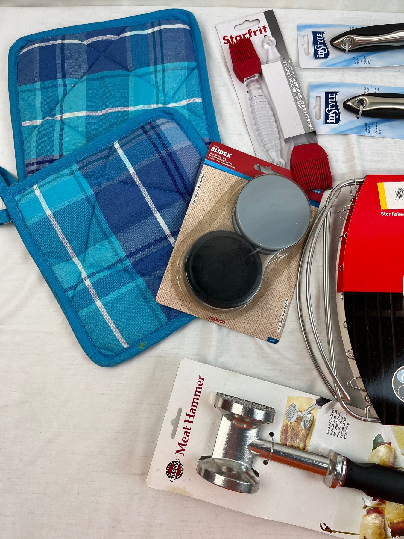 13 pieces in total - new & used - including fish basket, oven mitts, utensils ets