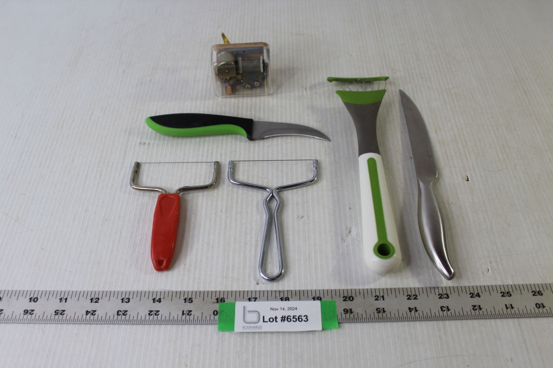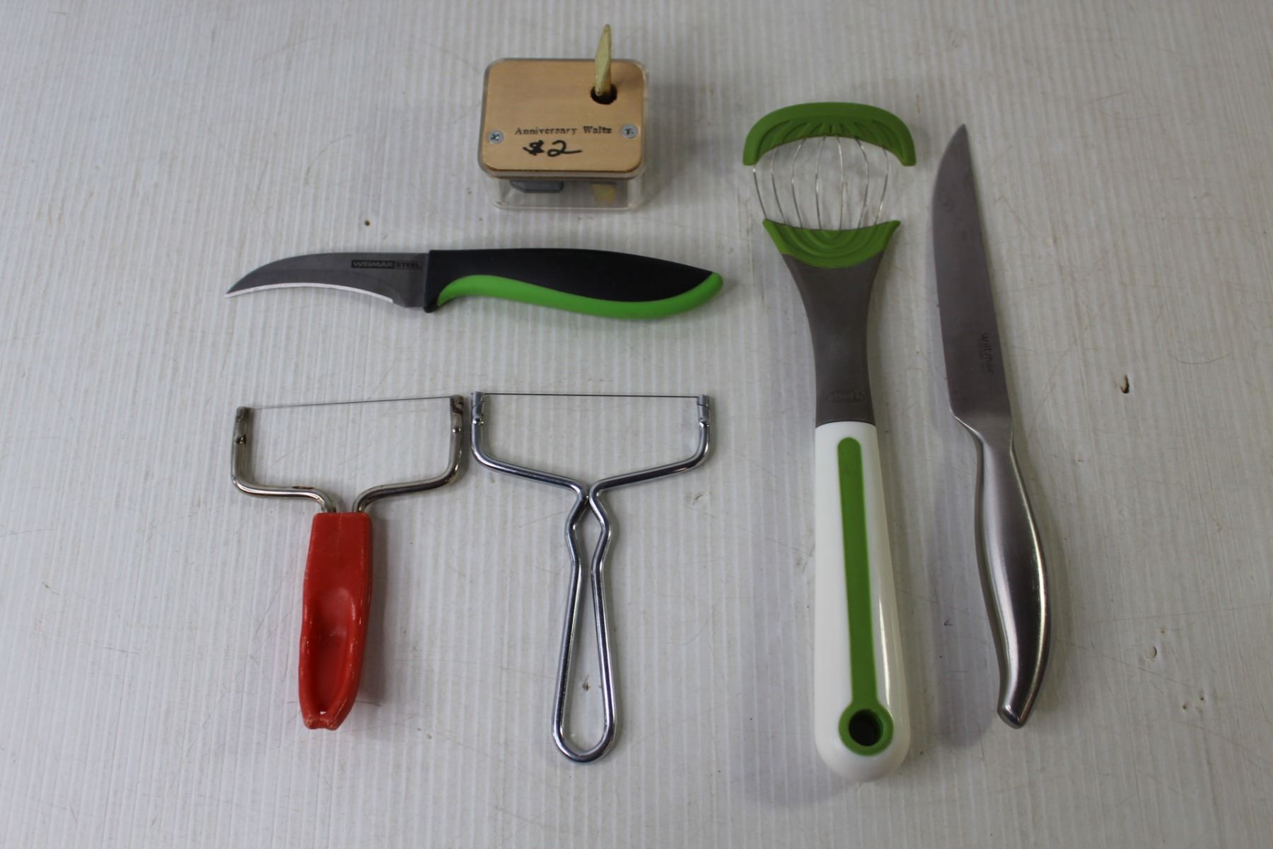 Assorted Kitchen Utensils (Knives, Cheese Slicers), Wind-Up Music Box "Anniversary Waltz" - Working