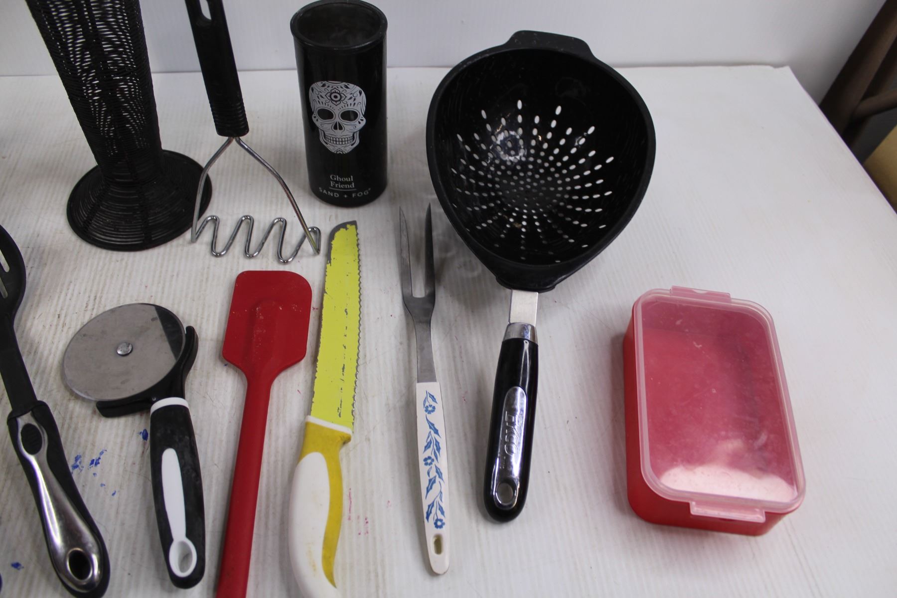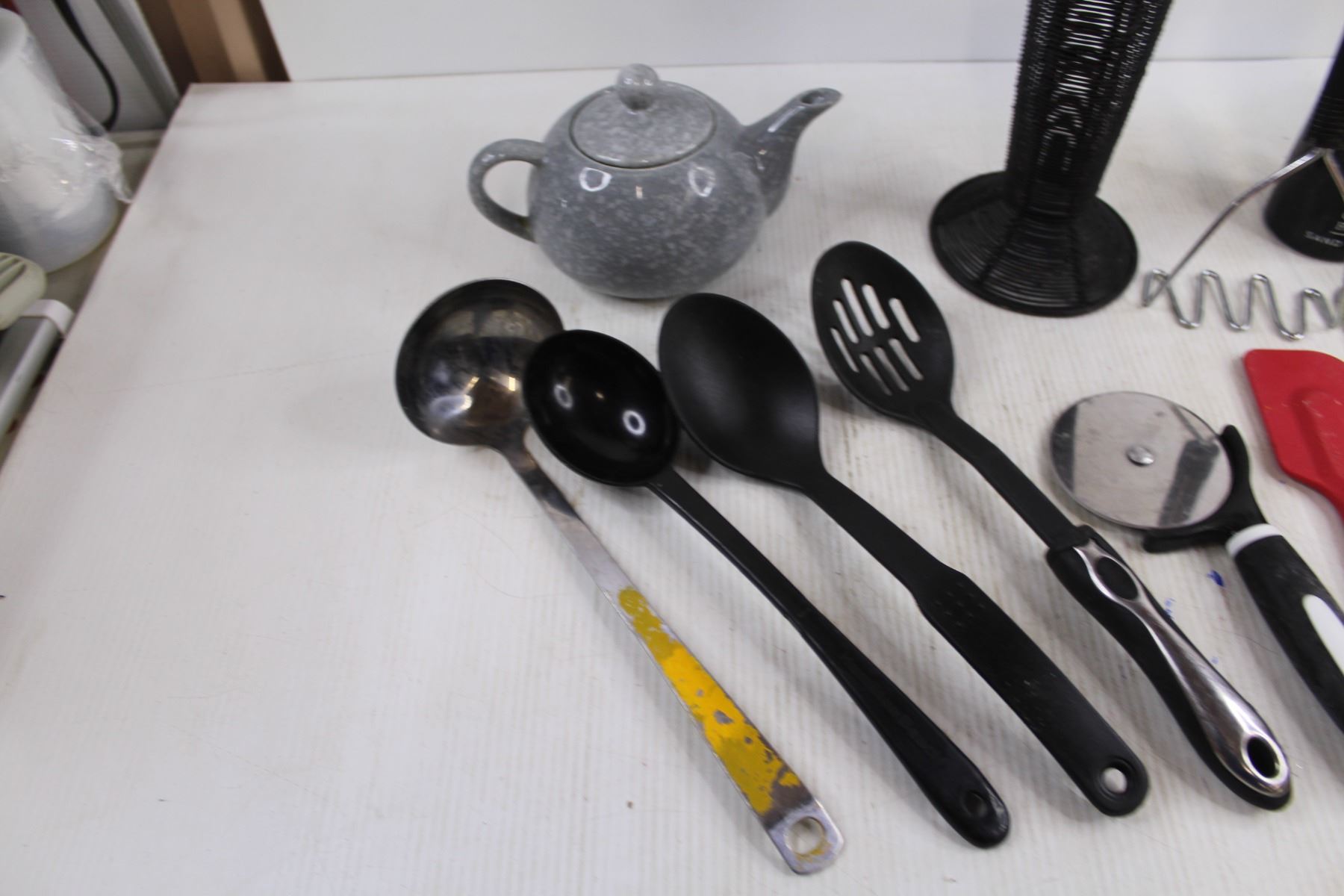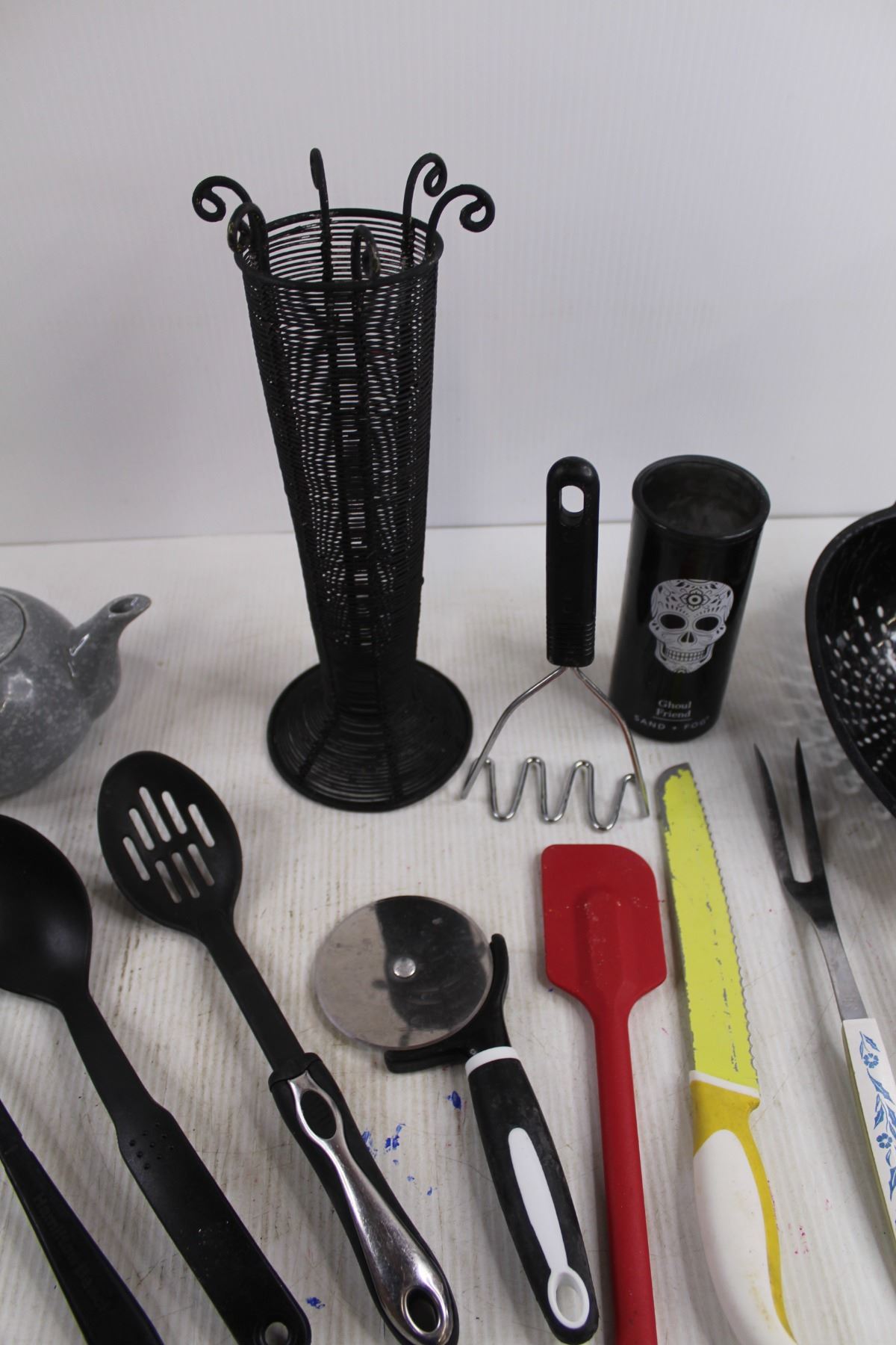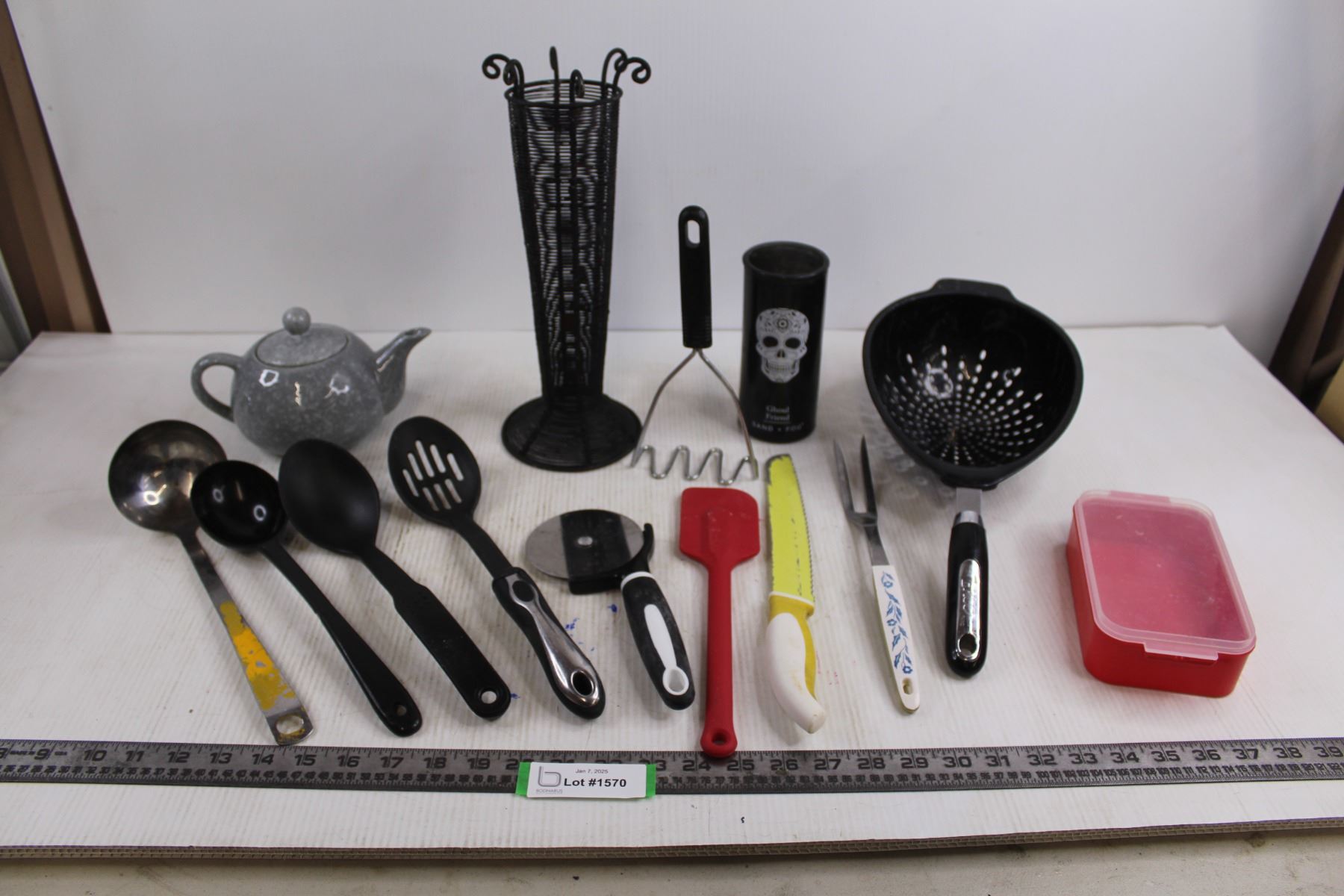 Assorted Kitchen Utensils (Ladles, Spoons, Pizza Cutter, Spatula, Colander, Holders, Teapot)