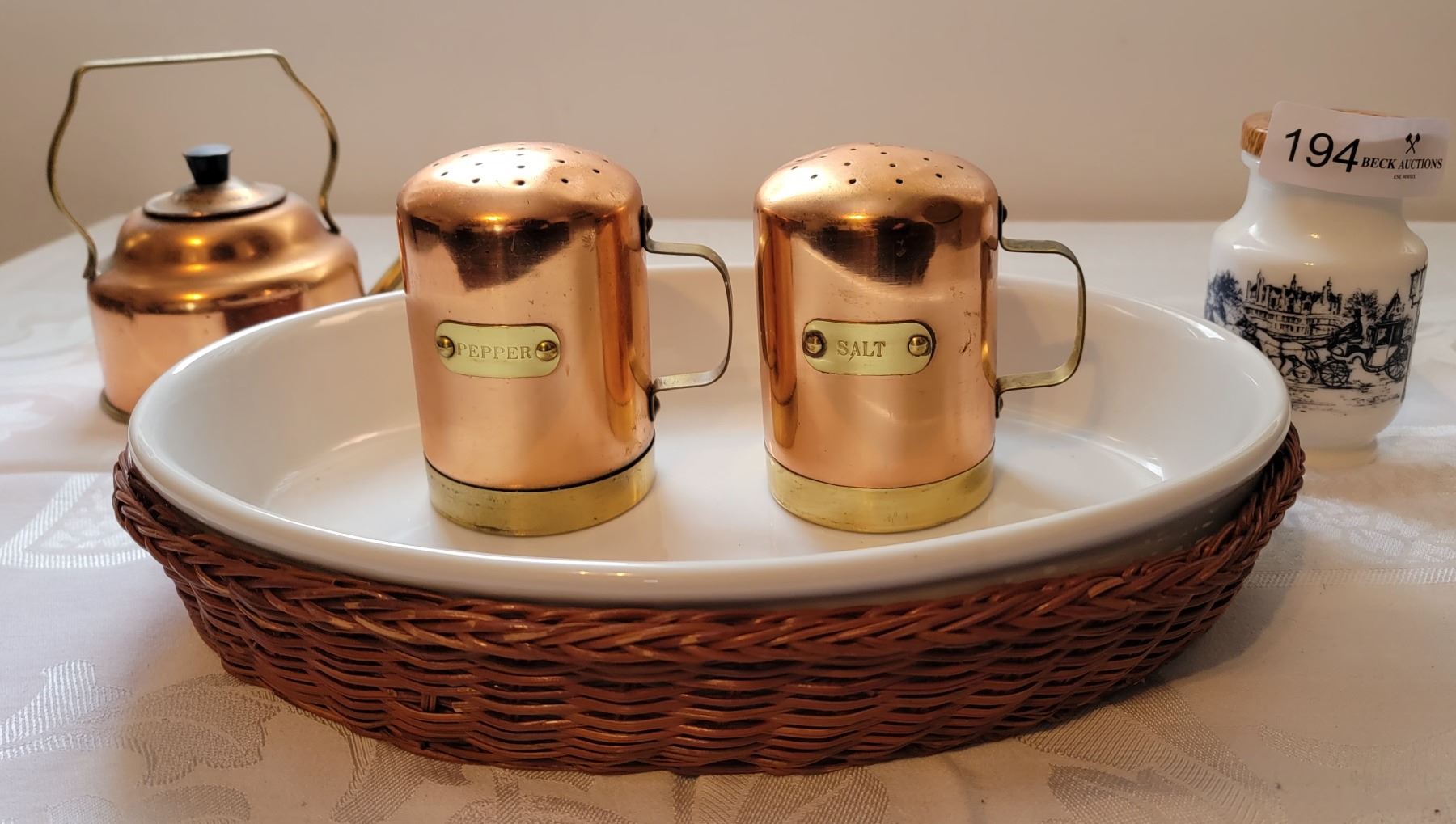 Tea Kettle, salt & pepper, Plater, fancy jar.