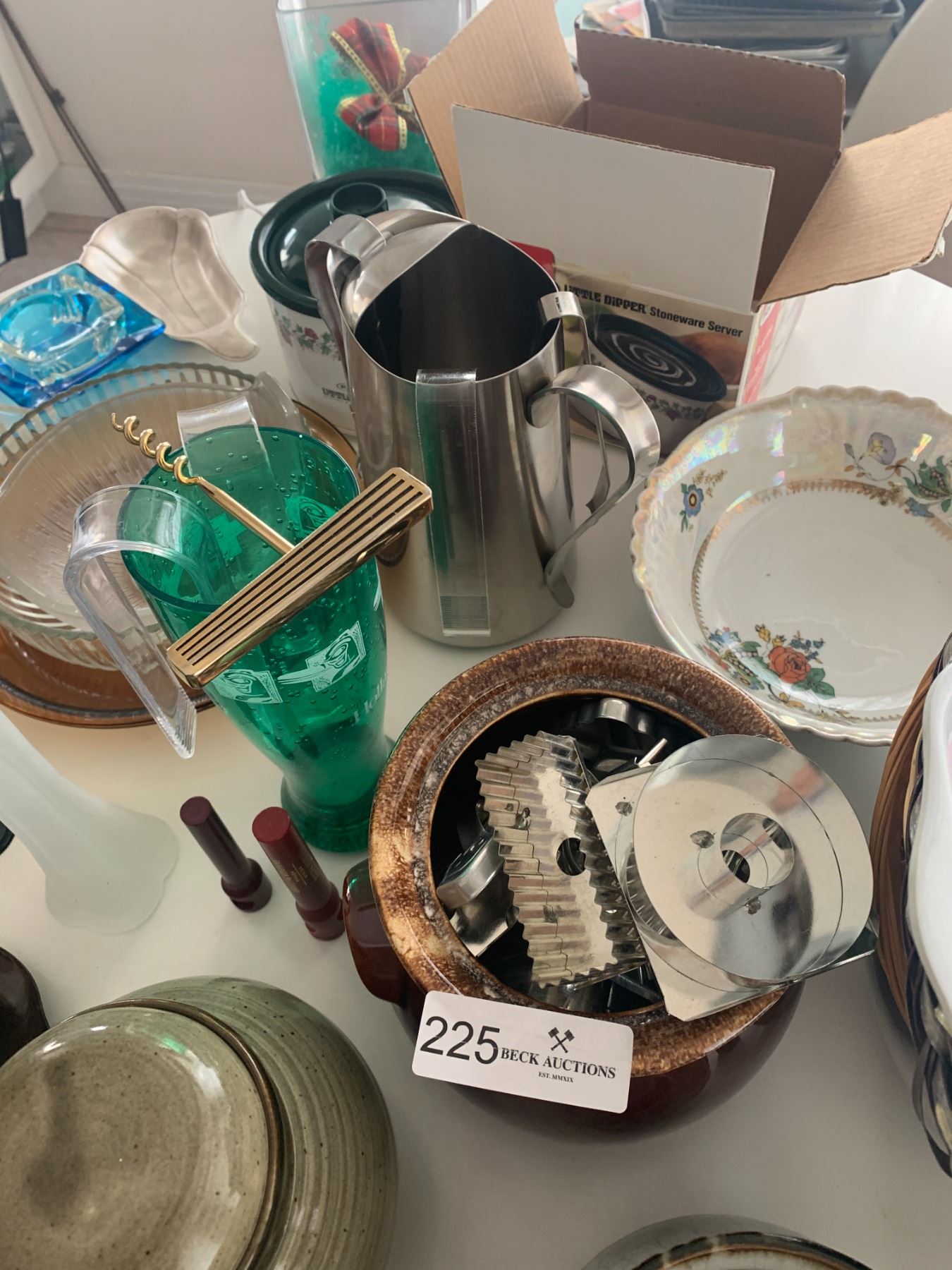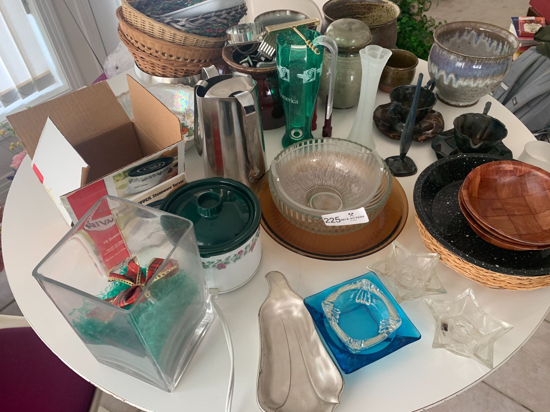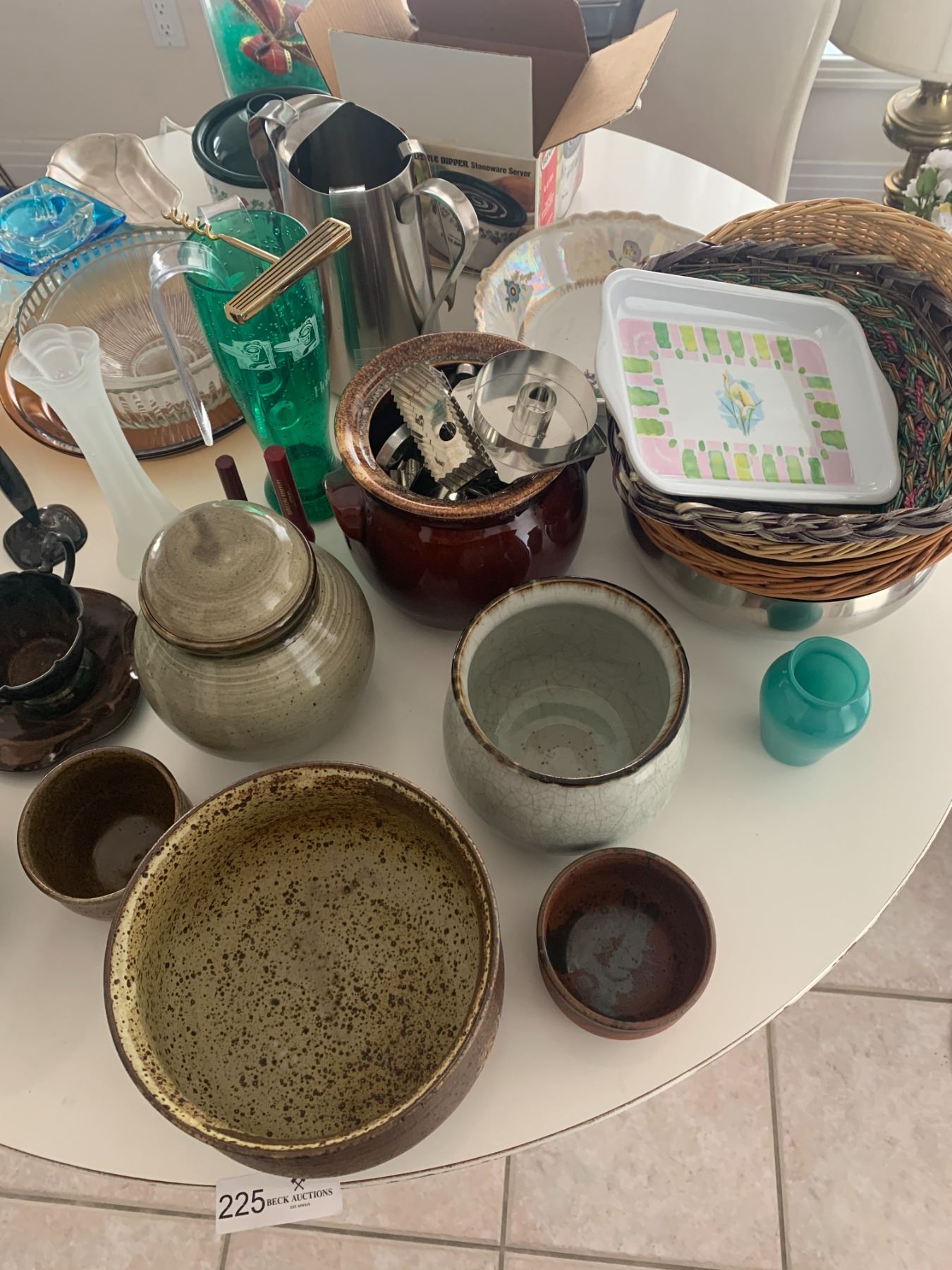 Including silver plate cups, vase, and ceramic bowls, baskets, little dipper, electric stoneware server, corkscrews, cookie cutters, & more!