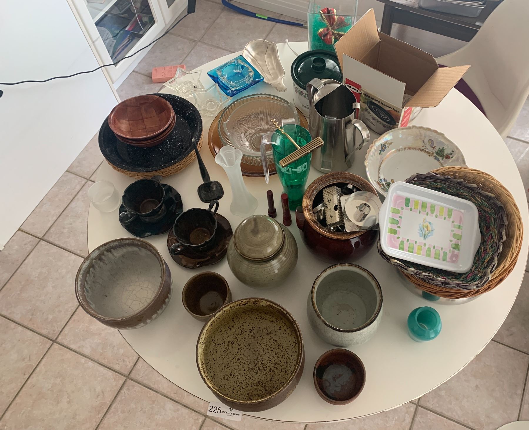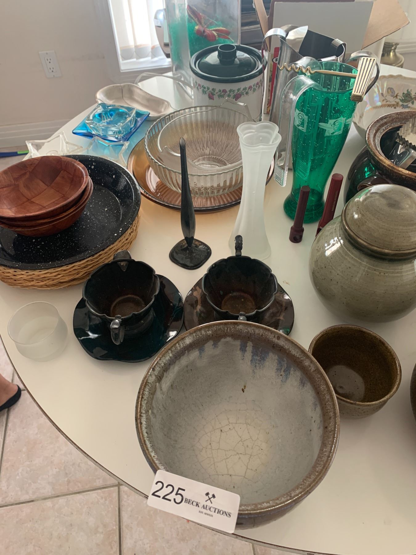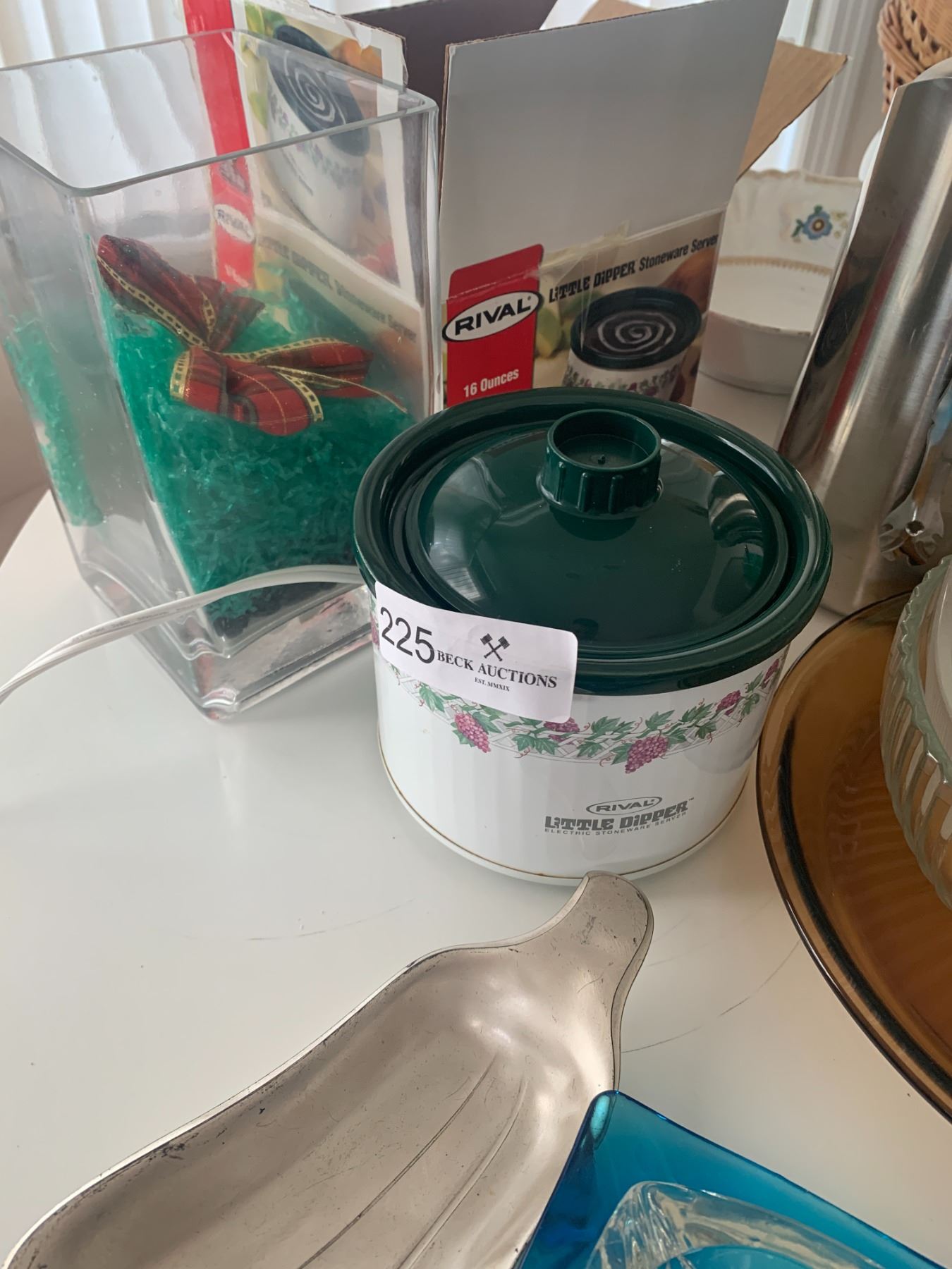Including silver plate cups, vase, and ceramic bowls, baskets, little dipper, electric stoneware server, corkscrews, cookie cutters, & more!