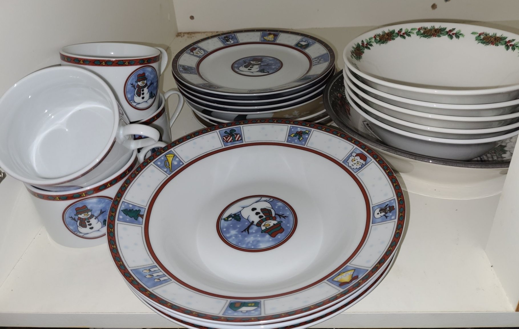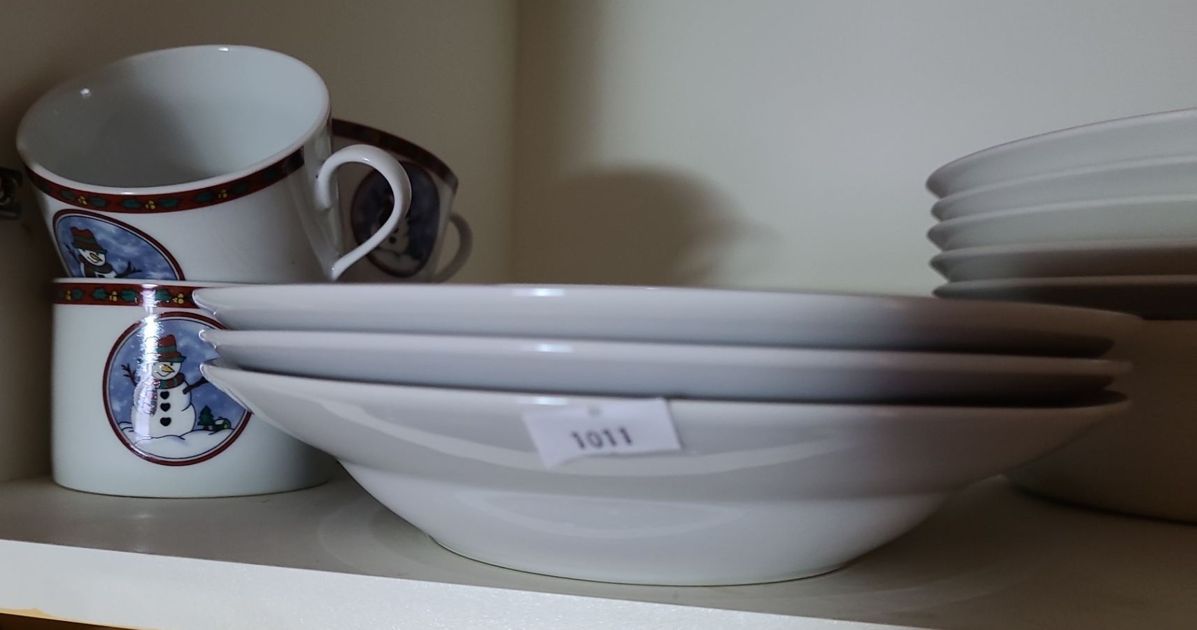 Assorted Kitchenware Including: Snowman Mugs, Plates and Bowls