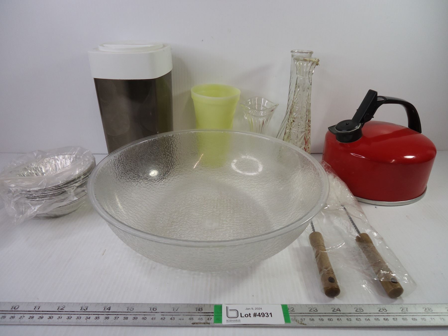 Assorted Kitchenware, Kettle, Salad Bowl(plastic) and (3) Vases