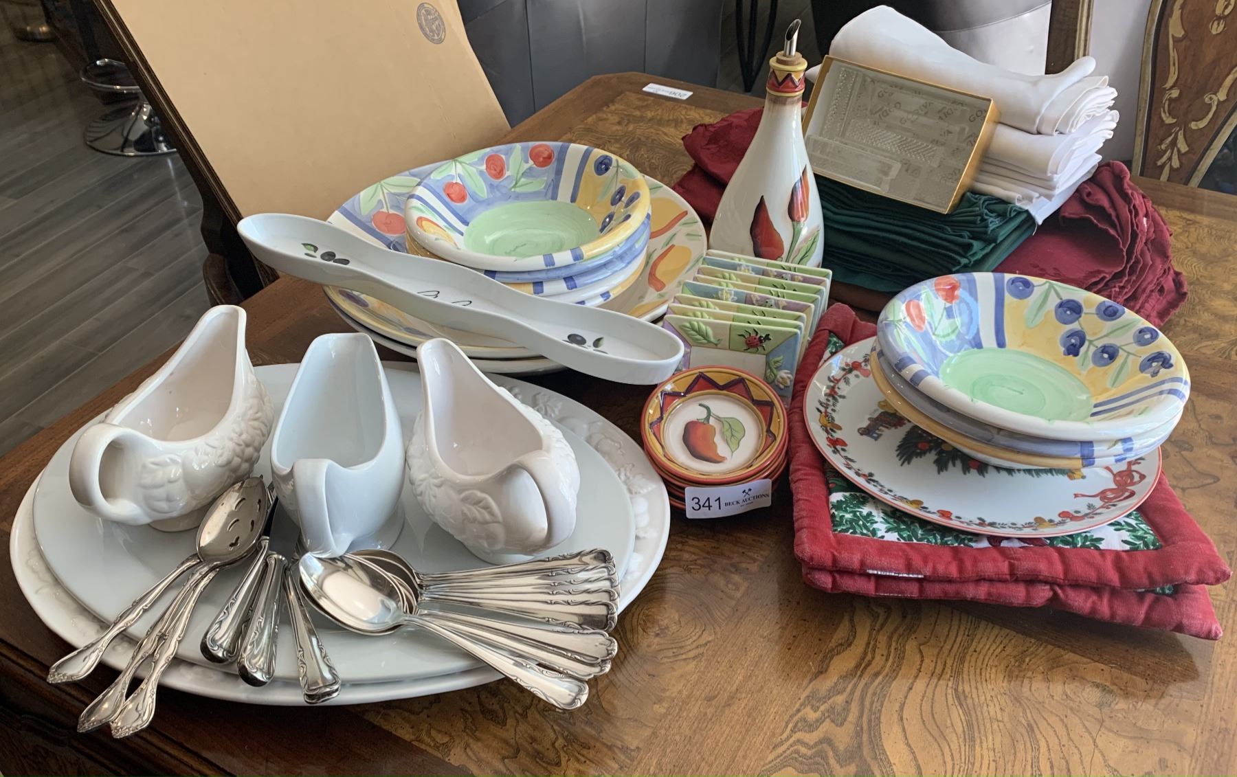 Includes bowls, plates, gravy boats, cutlery, oil decanter, and more!