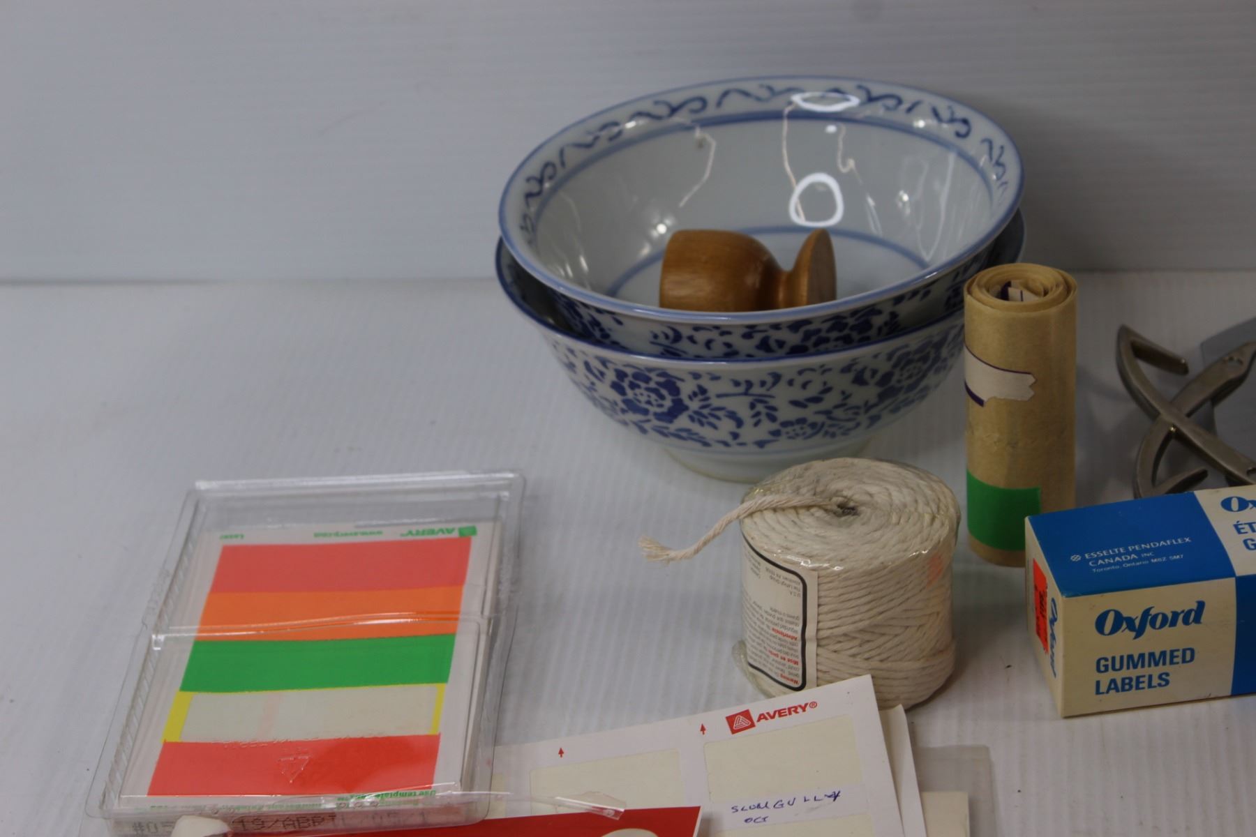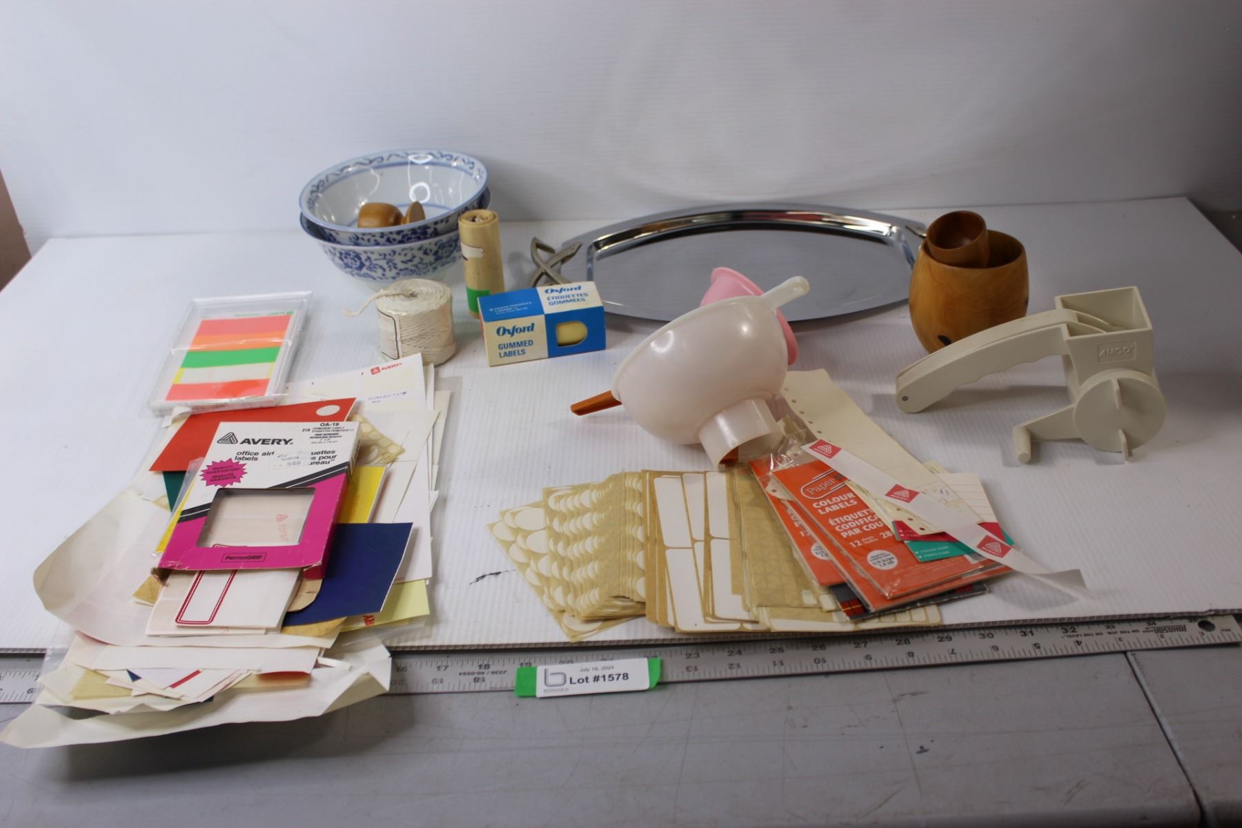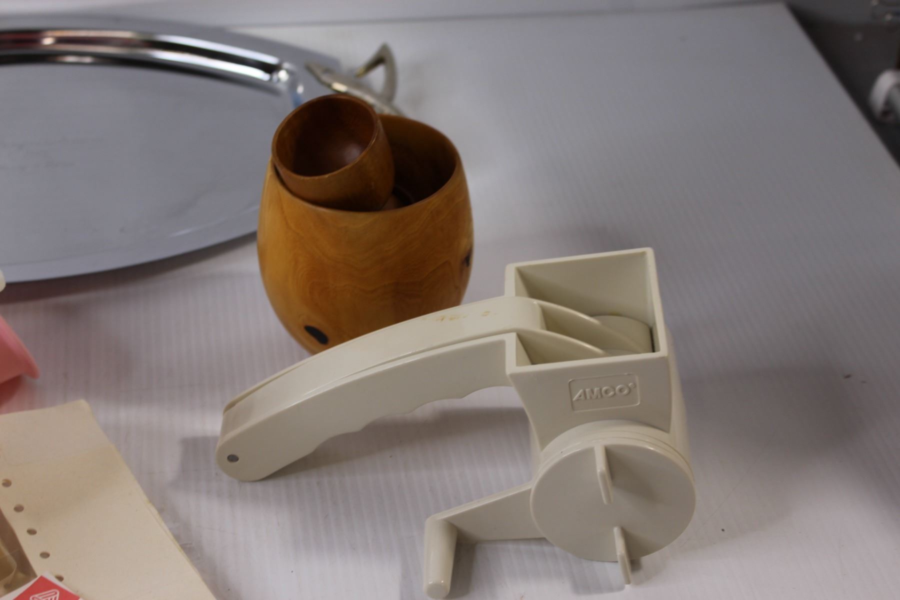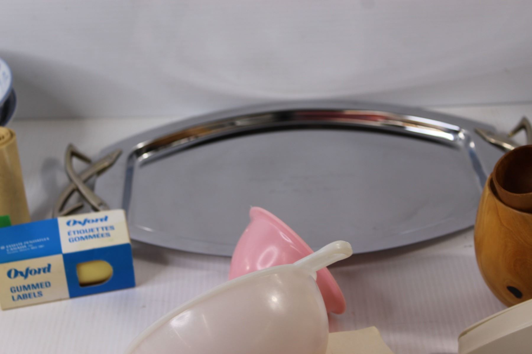 Assorted Labels, Mirror Wedding Tray, (2) Bowl, Cheese Grater, Misc.