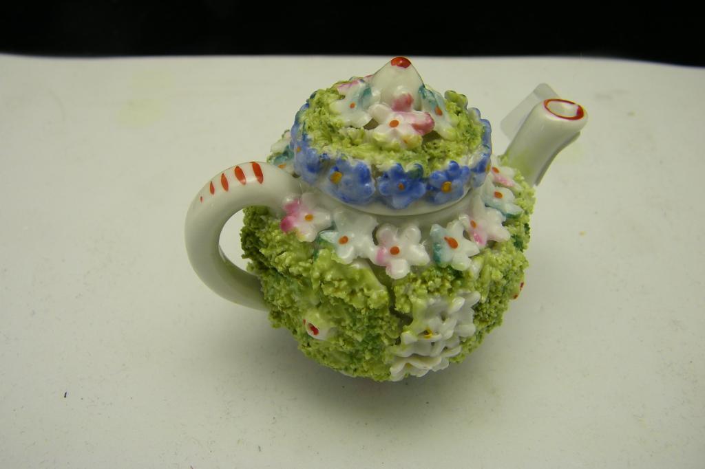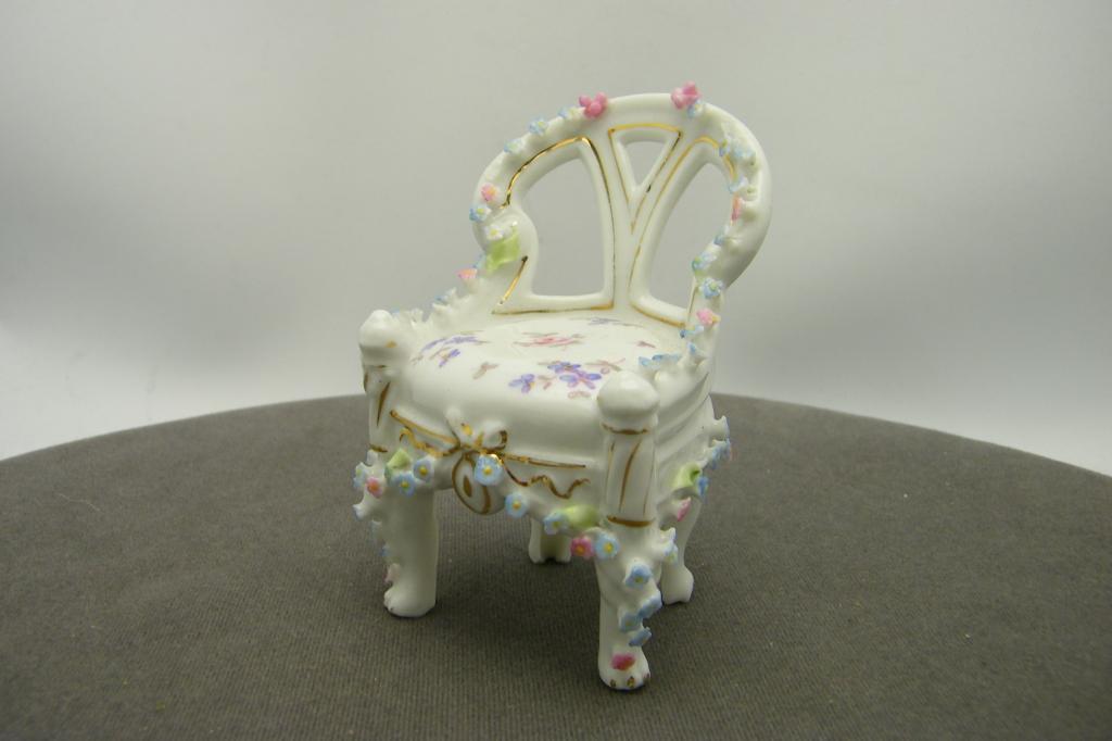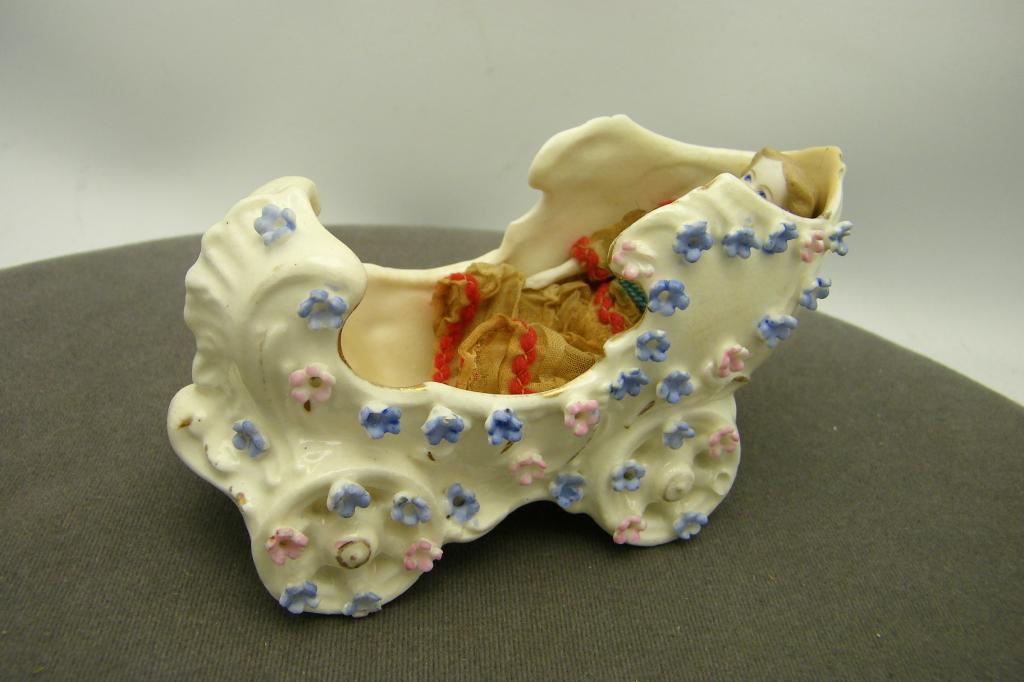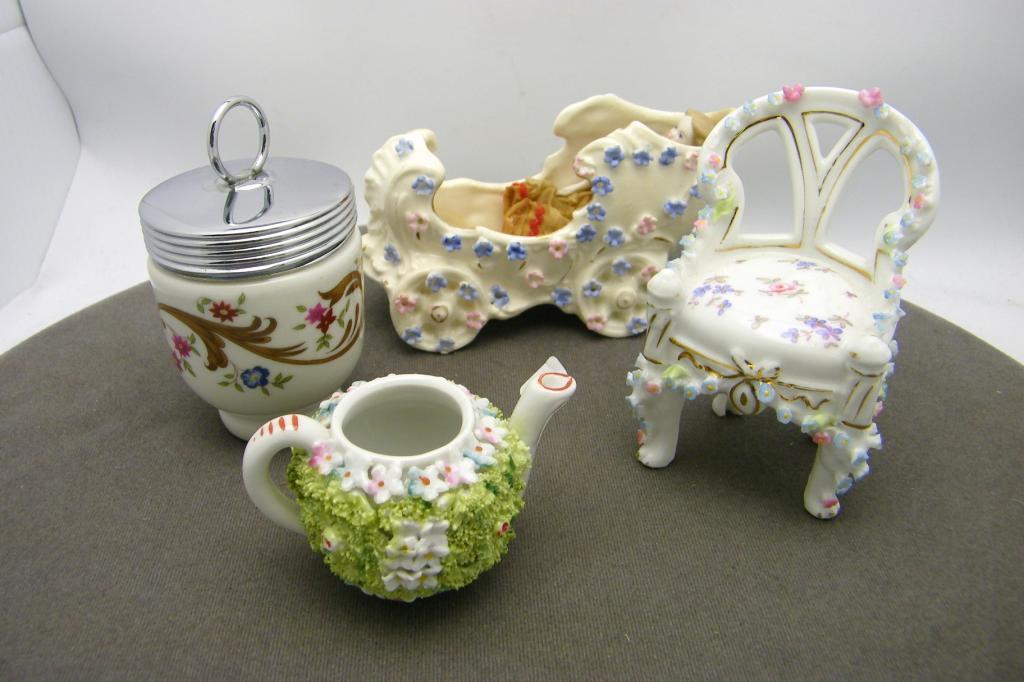 Mini tea pot - Made in Germany 3" H - porcelain chair 4 " H - small jar - Royal Worcester England 4" H and porcelain baby carriage with Bisque doll - 4.5" L